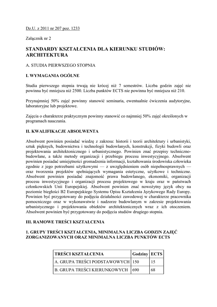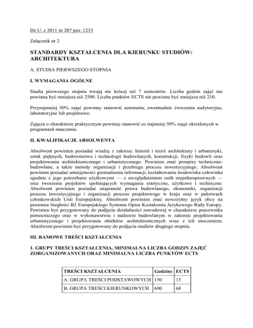 Dz.U. z 2011 nr 207 poz. 1233 Załącznik nr 2 STANDARDY KSZTAŁCENIA DLA KIERUNKU STUDIÓW: ARCHITEKTURA A. STUDIA PIERWSZEGO STOPNIA I. WYMAGANIA OGÓLNE Studia pierwszego stopnia trwają nie krócej niż 7 semestrów. Liczba godzin zajęć nie powinna być mniejsza niż 2500. Liczba punktów ECTS nie powinna być mniejsza niż 210. Przynajmniej 50% zajęć powinny stanowić seminaria, ewentualnie ćwiczenia audytoryjne, laboratoryjne lub projektowe. Zajęcia o charakterze praktycznym powinny stanowić co najmniej 50% zajęć określonych w programach nauczania. II. KWALIFIKACJE ABSOLWENTA Absolwent powinien posiadać wiedzę z zakresu: historii i teorii architektury i urbanistyki, sztuk pięknych, budownictwa i technologii budowlanych, konstrukcji, fizyki budowli oraz projektowania architektonicznego i urbanistycznego. Powinien znać przepisy technicznobudowlane, a także metody organizacji i przebiegu procesu inwestycyjnego. Absolwent powinien posiadać umiejętności gromadzenia informacji, kształtowania środowiska człowieka zgodnie z jego potrzebami użytkowymi — z uwzględnieniem osób niepełnosprawnych — oraz tworzenia projektów spełniających wymagania estetyczne, użytkowe i techniczne. Absolwent powinien posiadać znajomość prawa budowlanego, ekonomiki, organizacji procesu inwestycyjnego i organizacji procesu projektowego w kraju oraz w państwach członkowskich Unii Europejskiej. Absolwent powinien znać nowożytny język obcy na poziomie biegłości B2 Europejskiego Systemu Opisu Kształcenia Językowego Rady Europy. Powinien być przygotowany do podjęcia działalności zawodowej w charakterze pracownika pomocniczego oraz w wykonawstwie i nadzorze budowlanym w zakresie projektowania urbanistycznego i projektowania obiektów architektonicznych wraz z ich otoczeniem. Absolwent powinien być przygotowany do podjęcia studiów drugiego stopnia. III. RAMOWE TREŚCI KSZTAŁCENIA 1. GRUPY TREŚCI KSZTAŁCENIA, MINIMALNA LICZBA GODZIN ZAJĘĆ ZORGANIZOWANYCH ORAZ MINIMALNA LICZBA PUNKTÓW ECTS TREŚCI KSZTAŁCENIA Godziny ECTS A. GRUPA TREŚCI PODSTAWOWYCH 150 15 B. GRUPA TREŚCI KIERUNKOWYCH 68 690 Razem 840 83 2. SKŁADNIKI TREŚCI KSZTAŁCENIA W GRUPACH, MINIMALNA LICZBA GODZIN ZAJĘĆ ZORGANIZOWANYCH ORAZ MINIMALNA LICZBA PUNKTÓW ECTS SKŁADNIKI TREŚCI KSZTAŁCENIA Godziny/ECTS A. GRUPA TREŚCI PODSTAWOWYCH Treści kształcenia w zakresie: 150/15 1. Matematyki 45 2. Geometrii wykreślnej 45 3. Fizyki budowli 30 4. Mechaniki budowli 30 B. GRUPA TREŚCI KIERUNKOWYCH Treści kształcenia w zakresie: 690/68 1. Podstaw projektowania architektonicznego 2. Projektowania urbanistycznego 3. Historii architektury i urbanistyki 4. Budownictwa ogólnego i materiałoznawstwa 5. Konstrukcji budowlanych 6. Instalacji budowlanych 7. Sztuk plastycznych i technik warsztatowych 8. Ekonomiki procesu inwestycyjnego 9. Organizacji procesu inwestycyjnego 10. Prawa budowlanego 11. Etyki zawodu architekta 3. TREŚCI I EFEKTY KSZTAŁCENIA A. GRUPA TREŚCI PODSTAWOWYCH 1. Kształcenie w zakresie matematyki Treści kształcenia: Elementy algebry i analizy — pochodne i ich zastosowania, elementy rachunku całkowego. Układy równań liniowych. Równania prostych i płaszczyzn. Równania krzywych i powierzchni. Elementy logiki matematycznej. Elementy geometrii analitycznej. Efekty kształcenia — umiejętności i kompetencje: abstrakcyjne rozumienie problemów technicznych; stosowanie podstawowych metod matematycznych w projektowaniu architektonicznym i urbanistycznym. 2. Kształcenie w zakresie geometrii wykreślnej Treści kształcenia: Perspektywa i aksonometria. Metody odwzorowania i restytucji elementów przestrzeni. Geometryczne kształtowanie form architektonicznych z zastosowaniem wielościanów, brył i powierzchni. Metody perspektywy stosowanej. Efekty kształcenia — umiejętności i kompetencje: stosowanie geometrii wykreślnej w projektowaniu architektonicznym; konstruowanie i wizualizacja obiektów architektonicznych. 3. Kształcenie w zakresie fizyki budowli Treści kształcenia: Właściwości cieplno-wilgotnościowe konstrukcji przegród budowlanych. Podstawowe zjawiska dotyczące oświetlenia światłem dziennym i sztucznym. Akustyka — propagacja w przestrzeni otwartej, akustyka wnętrz, izolacyjność akustyczna przegród. Efekty kształcenia — umiejętności i kompetencje: uwzględnianie wymagań cieplnowilgotnościowych; projektowanie architektoniczne ochrony przeciwdźwiękowej i odpowiedniego oświetlenia. 4. Kształcenie w zakresie mechaniki budowli Treści kształcenia: Statyka na płaszczyźnie. Analiza płaskich układów statycznie wyznaczalnych. Metody graficznego i analitycznego wyznaczania sił. Wytrzymałość układów konstrukcyjnych. Zasady modelowania i łączenia różnych obciążeń konstrukcji. Określanie obciążeń konstrukcji. Efekty kształcenia — umiejętności i kompetencje: rozumienie zagadnień kształtowania struktur i ustrojów budowlanych; przygotowywanie schematów statycznych konstrukcji; projektowanie elementów konstrukcyjnych; identyfikowanie naprężeń występujących w elementach konstrukcyjnych; określanie obciążeń konstrukcji. B. GRUPA TREŚCI KIERUNKOWYCH 1. Kształcenie w zakresie podstaw projektowania architektonicznego Treści kształcenia: Zasady projektowania architektonicznego. Elementy kompozycji architektonicznej. Efekty kształcenia — umiejętności i kompetencje: rozumienie wzajemnych relacji obiektu i otoczenia; wykonywanie projektów architektonicznych o małym stopniu złożoności; stosowanie różnych środków technicznych i materiałowych do prezentacji pomysłu architektonicznego. 2. Kształcenie w zakresie podstaw projektowania urbanistycznego Treści kształcenia: Zasady projektowania urbanistycznego. Elementy kompozycji urbanistycznej. Relacje między elementami kształtującymi przestrzeń. System planowania przestrzennego w Polsce. Efekty kształcenia — umiejętności i kompetencje: rozumien