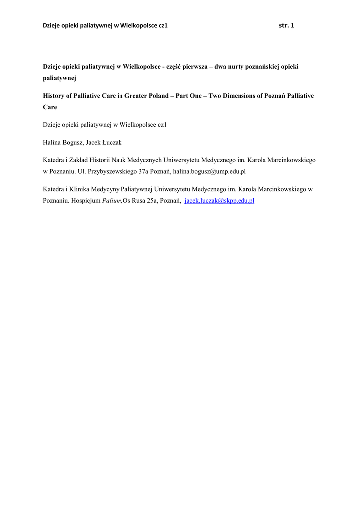 Dzieje opieki paliatywnej w Wielkopolsce cz1 str. 1 Dzieje opieki paliatywnej w Wielkopolsce - część pierwsza – dwa nurty poznańskiej opieki paliatywnej History of Palliative Care in Greater Poland – Part One – Two Dimensions of Poznań Palliative Care Dzieje opieki paliatywnej w Wielkopolsce cz1 Halina Bogusz, Jacek Łuczak Katedra i Zakład Historii Nauk Medycznych Uniwersytetu Medycznego im. Karola Marcinkowskiego w Poznaniu. Ul. Przybyszewskiego 37a Poznań, [email protected] Katedra i Klinika Medycyny Paliatywnej Uniwersytetu Medycznego im. Karola Marcinkowskiego w Poznaniu. Hospicjum Palium,Os Rusa 25a, Poznań, [email protected] Dzieje opieki paliatywnej w Wielkopolsce cz1 str. 2 Streszczenie Opieka paliatywna i hospicyjna, za której początki uważa się zwykle lata 70te I 80te XX wieku wypełniła istniejącą ówcześnie lukę w zakresie opieki nad nieuleczalnie chorymi. Nieuleczalnie chory jako osoba wymagająca specyficznego postepowania terapeutycznego i pielęgnacyjnego został dostrzeżony około przełomu wieków XIX i XX. Wtedy powstają różnorakie zakłady także na terenie Polski i Wielkopolski. Zawdzięczamy je głównie formacjom zakonnym, które prowadziły swą działalność także w domach chorych. Cały ten system został zniszczony w latach okupacji niemieckiej a następnie pierwszych dziesięcioleci rządów PRL. Poznań był trzecim z kolei – po Krakowie i Gdańsku, – w którym zaczął się rozwijać ruch hospicyjny. Jednak odmiennie jak w innych ośrodkach prawie od samego początku istniały dwa odrębne choć przenikające się nawzajem nurty tego ruchu. Poznań jest także niekwestionowanym liderem wśród ośrodków opieki paliatywnej powstającej w strukturach publicznej opieki zdrowotnej. Dzięki staraniom profesora Jacka Łuczaka powstał tutaj nie tylko pierwszy oddział opieki paliatywnej w Polsce, ale i pierwsza w Europie środkowo-wschodniej klinika opieki paliatywnej. Ośrodek ten pełnił rolę wiodącego i modelowego w skali kraju, prowadząc szkolenia, inspirując powstawanie nowych oddziałów i hospicjów i ich rozwój. Słowa kluczowe – opieka paliatywna, opieka nad nieuleczalnie chorymi, opieka paliatywna w Wielkopolsce, opieka u schyłku życia Dzieje opieki paliatywnej w Wielkopolsce cz1 str. 3 Abstract The beginnings of Hospice palliative care are usually placed in the seventies and eighties of last century. The development of palliative care was the answer to the lack of care for incurable patients of that time. The incurables were identified as patients with special needs as regards to treatment and care about the end of the XIXth century. Quite a number of houses specialized in care of incurable patients were established at that time. They were run usually by nuns, providing also home care for the ill. This system of care was destroyed during german rules in Poland in the times of second world war and in the fifties during communist times. Poznań was the third center after Kraków and Gdańsk where hospice movement was established. However it was in Poznań where two separate centers started almost at the same time. From this time on this two dimensional hospice care have existed in Poznań. It was also here where the first palliative care ward in Poland was establishes as well as the first Palliative Medicine Chair in Medical university. This center founded by professor Jack Luczak has gained the status of the leading educational and scientific center. Its educational and social activities were the inspiration for development of many new hospices in Poland. Key words – palliative care, palliative care in Greater Poland, care of incurable diseases, end of life care Dzieje opieki paliatywnej w Wielkopolsce cz1 str. 4 Wprowadzenie Opieka paliatywna, hospicjum, opieka nad chorymi u schyłku życia – to sformułowania, które są w powszechnym użyciu od około czterdziestu lat w Polsce. Wprowadzone zostały do użycia i świadomości społecznej dzięki ruchowi hospicyjnemu, który zaczął rozwijać się w Polsce na przełomie lat siedemdziesiątych i osiemdziesiątych ubiegłego wieku. Wielkopolska była trzecim po Gdańsku i Krakowie ośrodkiem nowego ruchu. Była jednocześnie pierwszym miejscem, gdzie opieka paliatywna zyskała sobie obywatelstwo w państwowej, ówcześnie, opiece zdrowotnej. Od tej pory zaczęła silnie promieniować na całą Polskę, a nawet poza jej granice, płynąc dwoma, przenikającymi się nurtami: społecznym i publicznym. To także Poznań stał się pierwszym ośrodkiem akademickim, który podjął działalność leczniczą, edukacyjną i naukową na polu opieki paliatywnej. Rozwój opieki paliatywnej, jego dynamika i bogactwo wynikały z tradycji opieki nad nieuleczalnie chorymi w Polsce. Na ile ruch hospicyjny czerpał wzorce z istniejących ośrodków zachodnioeuropejskich, a na ile kształt polskiej i wielkopolskiej opieki paliatywnej wynikał z tych tradycji jest między innymi przedmiotem refleksji podjętej w niniejszym artykule. Opieka nad nieuleczalnie chorymi w Polsce przed powstaniem hospicjów Pierwotnie opieka nad nieuleczalnie chorymi była jedną z funkcji szpitali. Potwierdza to między innymi XVIII-wieczny dokument erygujący Szpital Generalny w Warszawie „Szpital Generalny zakładamy chcąc ,aby (…)nieuleczalni, głupi i szaleni w tymże szpitalu opatrzenie swoich potrzeb znaleźli”[1]. W XIX wieku szpitale nadal pełniły funkcje opiekuńcze w stosunku do nieuleczalnie chorych. Niekiedy dopiero brak nadziei na wyleczenie chorego bywał bodźcem do szukania dla niego pomocy w szpitalu. Świadczą o tym na przykład uwagi siostry miłosierdzia ze szpitala Przemienienia Pańskiego, w Poznaniu, która ubolewała: „Niemal wszystkich (chorych) dopiero wtenczas do Instytutu oddają, gdy wyzdrowienie ich staje się wątpliwym. Nierzadko umierających przynoszą” [2] Około przełomu wieku XIX i XX – podobnie jak w innych krajach Europy, także na ziemiach 