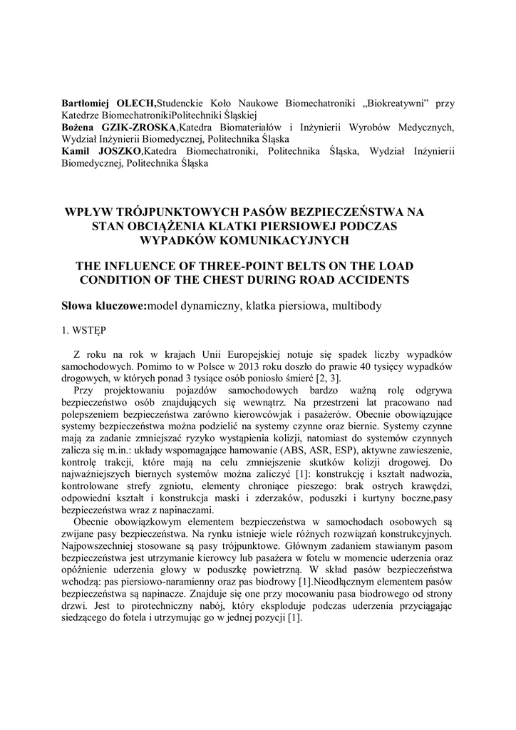 Bartłomiej OLECH,Studenckie Koło Naukowe Biomechatroniki „Biokreatywni” przy Katedrze BiomechatronikiPolitechniki Śląskiej Bożena GZIK-ZROSKA,Katedra Biomateriałów i Inżynierii Wyrobów Medycznych, Wydział Inżynierii Biomedycznej, Politechnika Śląska Kamil JOSZKO,Katedra Biomechatroniki, Politechnika Śląska, Wydział Inżynierii Biomedycznej, Politechnika Śląska WPŁYW TRÓJPUNKTOWYCH PASÓW BEZPIECZEŃSTWA NA STAN OBCIĄŻENIA KLATKI PIERSIOWEJ PODCZAS WYPADKÓW KOMUNIKACYJNYCH THE INFLUENCE OF THREE-POINT BELTS ON THE LOAD CONDITION OF THE CHEST DURING ROAD ACCIDENTS Słowa kluczowe:model dynamiczny, klatka piersiowa, multibody 1. WSTĘP Z roku na rok w krajach Unii Europejskiej notuje się spadek liczby wypadków samochodowych. Pomimo to w Polsce w 2013 roku doszło do prawie 40 tysięcy wypadków drogowych, w których ponad 3 tysiące osób poniosło śmierć [2, 3]. Przy projektowaniu pojazdów samochodowych bardzo ważną rolę odgrywa bezpieczeństwo osób znajdujących się wewnątrz. Na przestrzeni lat pracowano nad polepszeniem bezpieczeństwa zarówno kierowcówjak i pasażerów. Obecnie obowiązujące systemy bezpieczeństwa można podzielić na systemy czynne oraz biernie. Systemy czynne mają za zadanie zmniejszać ryzyko wystąpienia kolizji, natomiast do systemów czynnych zalicza się m.in.: układy wspomagające hamowanie (ABS, ASR, ESP), aktywne zawieszenie, kontrolę trakcji, które mają na celu zmniejszenie skutków kolizji drogowej. Do najważniejszych biernych systemów można zaliczyć [1]: konstrukcję i kształt nadwozia, kontrolowane strefy zgniotu, elementy chroniące pieszego: brak ostrych krawędzi, odpowiedni kształt i konstrukcja maski i zderzaków, poduszki i kurtyny boczne,pasy bezpieczeństwa wraz z napinaczami. Obecnie obowiązkowym elementem bezpieczeństwa w samochodach osobowych są zwijane pasy bezpieczeństwa. Na rynku istnieje wiele różnych rozwiązań konstrukcyjnych. Najpowszechniej stosowane są pasy trójpunktowe. Głównym zadaniem stawianym pasom bezpieczeństwa jest utrzymanie kierowcy lub pasażera w fotelu w momencie uderzenia oraz opóźnienie uderzenia głowy w poduszkę powietrzną. W skład pasów bezpieczeństwa wchodzą: pas piersiowo-naramienny oraz pas biodrowy [1].Nieodłącznym elementem pasów bezpieczeństwa są napinacze. Znajduje się one przy mocowaniu pasa biodrowego od strony drzwi. Jest to pirotechniczny nabój, który eksploduje podczas uderzenia przyciągając siedzącego do fotela i utrzymując go w jednej pozycji [1]. XII Konferencja Naukowa Majówka Młodych Biomechaników im. prof. Dagmary Tejszerskiej s. 94 2. METODYKA BADAŃ W niniejszej pracy podjęto próbę przeanalizowania wpływu działania trójpunktowych pasów bezpieczeństwa na stan obciążenia klatki piersiowej podczas wypadków komunikacyjnych. W tym celu opracowano przestrzenny, dynamiczny model klatki piersiowej na bazie obrazów CT. Do przeprowadzenia symulacji wykorzystano oprogramowanie MADYMO. Modelowanie dynamiczne najczęściej wykorzystywane jest w branży motoryzacyjnej, ze względu na możliwość otrzymania wartości przemieszczeń, prędkości i przyspieszeń analizowanych podczas wypadków samochodowych. Najczęściej wykorzystywanymi programami do symulacji wypadków i projektowania systemów bezpieczeństwa są programy MADYMO i PAM-CRASH. Modelowanie daje możliwość przewidywania skutków i analizy zachowań badanych obiektów, bez konieczności prowadzenia drogich, niepowtarzalnych i często inwazyjnych eksperymentów. Model uwzględnia następujące elementy:  11 kręgów piersiowych (od Th1 do Th11),  11 par żeber,  żebra chrzęstne,  mostek z wyszczególnieniem rękojeści, trzonu i wyrostka mieczykowatego. Rys. 1. Model klatkipiersiowejwykonany w programieMadymo 3. PODSUMOWANIE Opracowany model dynamiczny klatki piersiowej daje możliwość analizy obciążeń powstających w połączeniach poszczególnych elementów podczas zderzenia czołowego. Dzięki temu możnaprzewidywać miejsce oraz stopień wystąpienia urazów w trakcie wypadków samochodowych. LITERATURA [1] Fundowicz P., Radzimierski M., Wieczorek M.: KonstrukcjaPojazdówSamochodowychWSiP, Warszawa 2010 [2] Wypadkidrogowe w Polsce w 2013 roku- ITS, Warszawa 2014 [3] http://ec.europa.eu/polska/news/140331_wypadki_drogowe_pl.htm