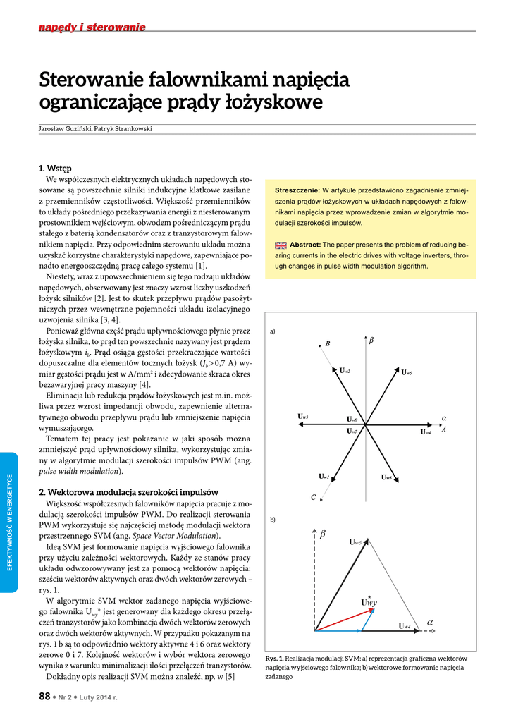 Sterowanie falownikami napięcia ograniczające prądy łożyskowe Efektywność bezpieczeństwo w energetyce Jarosław Guziński, Patryk Strankowski 1. Wstęp We współczesnych elektrycznych układach napędowych stosowane są powszechnie silniki indukcyjne klatkowe zasilane z przemienników częstotliwości. Większość przemienników to układy pośredniego przekazywania energii z niesterowanym prostownikiem wejściowym, obwodem pośredniczącym prądu stałego z baterią kondensatorów oraz z tranzystorowym falownikiem napięcia. Przy odpowiednim sterowaniu układu można uzyskać korzystne charakterystyki napędowe, zapewniające ponadto energooszczędną pracę całego systemu [1]. Niestety, wraz z upowszechnieniem się tego rodzaju układów napędowych, obserwowany jest znaczy wzrost liczby uszkodzeń łożysk silników [2]. Jest to skutek przepływu prądów pasożytniczych przez wewnętrzne pojemności układu izolacyjnego uzwojenia silnika [3, 4]. Ponieważ główna część prądu upływnościowego płynie przez łożyska silnika, to prąd ten powszechnie nazywany jest prądem łożyskowym ib. Prąd osiąga gęstości przekraczające wartości dopuszczalne dla elementów tocznych łożysk (Jb > 0,7 A) wymiar gęstości prądu jest w A/mm2 i zdecydowanie skraca okres bezawaryjnej pracy maszyny [4]. Eliminacja lub redukcja prądów łożyskowych jest m.in. możliwa przez wzrost impedancji obwodu, zapewnienie alternatywnego obwodu przepływu prądu lub zmniejszenie napięcia wymuszającego. Tematem tej pracy jest pokazanie w jaki sposób można zmniejszyć prąd upływnościowy silnika, wykorzystując zmiany w algorytmie modulacji szerokości impulsów PWM (ang. pulse width modulation). 2. Wektorowa modulacja szerokości impulsów Większość współczesnych falowników napięcia pracuje z modulacją szerokości impulsów PWM. Do realizacji sterowania PWM wykorzystuje się najczęściej metodę modulacji wektora przestrzennego SVM (ang. Space Vector Modulation). Ideą SVM jest formowanie napięcia wyjściowego falownika przy użyciu zależności wektorowych. Każdy ze stanów pracy układu odwzorowywany jest za pomocą wektorów napięcia: sześciu wektorów aktywnych oraz dwóch wektorów zerowych – rys. 1. W algorytmie SVM wektor zadanego napięcia wyjściowego falownika Uwy* jest generowany dla każdego okresu przełączeń tranzystorów jako kombinacja dwóch wektorów zerowych oraz dwóch wektorów aktywnych. W przypadku pokazanym na rys. 1 b są to odpowiednio wektory aktywne 4 i 6 oraz wektory zerowe 0 i 7. Kolejność wektorów i wybór wektora zerowego wynika z warunku minimalizacji ilości przełączeń tranzystorów. Dokładny opis realizacji SVM można znaleźć, np. w [5] 88 l Nr 2 l Luty 2014 r. Streszczenie: W artykule przedstawiono zagadnienie zmniejszenia prądów łożyskowych w układach napędowych z falownikami napięcia przez wprowadzenie zmian w algorytmie modulacji szerokości impulsów. Abstract: The paper presents the problem of reducing bearing currents in the electric drives with voltage inverters, through changes in pulse width modulation algorithm. a) b) Rys. 1. Realizacja modulacji SVM: a) reprezentacja graficzna wektorów napięcia wyjściowego falownika; b) wektorowe formowanie napięcia zadanego Rys. 2. Struktura układu napędowego silnika indukcyjnego z falownikiem napięcia dla składowej wspólnej z zaznaczeniem pojemności pasożytniczych (1) co prowadzi do: (2) a) b) Rys. 3. Napięcia wyjściowe falownika: a) składowa wspólna odniesiona do punktu środkowego kondensatorów; b) składowa wspólna odniesiona do bieguna (–) obwodu pośredniczącego DC Napięcie wyjściowe falownika uzależnione jest od napięcia zasilającego Ud oraz od aktualnej kombinacji przewodzenia tranzystorów. Wartości napięć wyjściowych dla wszystkich możliwych stanów łączników podano w tabeli 1. W tab. 1 podano również składowe napięcia w ortogonalnym układzie współrzędnych 0αβ po zastosowaniu transformacji zachowującej moc układu: a ponieważ: (5) (3) to składowa wspólna napięcia: Wielkość u0 z tab. 1 jest składową zerową napięcia, która dla układu 0αβ jest odpowiednikiem składowej wspólnej z układu naturalnego abc. (4) Nr 2 l Luty 2014 r. l 89 bezpieczeństwo Efektywność w energetyce 3. Falownik napięcia jako źródło składowej wspólnej napięcia Falownik napięcia pracujący w systemie PWM jest źródłem składowej wspólnej napięcia CMV (ang. common mode voltage). Napięcie CMV (uCMV) definiowane jest jako napięcie pomiędzy punktem neutralnym odbiornika a potencjałem uziemienia ochronnego PE (ang. Power Earth). Na rys. 2 przedstawiono schemat zastępczy dla trójfazowego falownika napięcia z silnikiem i kablem oraz typowym układem zasilania falownika [6]. Falownik stanowi źródło wymuszające składową wspólną w elektrotechnice, w układach trójfazowych, ma nazwę składowej zerowej napięcia. Znaczna stromość impulsów tego napięcia (du/dt) powoduje przepływ impulsów prądu upływnościowego. Dokładna analiza napięcia uCMV dla pełnego obwodu z rys. 2 jest utrudniona z uwagi na brak pełnej informacji o elementach składowych po stronie zasilania falownika. Dlatego, z uwagi na małą impedancję elementów szeregowych obwodu CM, do celów analizy przyjmuje się, że punkt środkowy obwodu DC jest potencjałem odniesienia, galwanicznie połączonym z PE – rys. 3 a. Zgodnie z rys. 3 napięcia wyjściowe falownika uU , uV , uW są określone następująco: Tabela 1. Wartości napięć wyjściowych falownika dla wszystkich kombinacji łączników(1) Oznaczenie Rodzaj wektora(3) Numer kombinacji stanów łączników falownika(2) 100 110 010 011 001 101 NP P 000 aktywny NP zerowy NP P uU Ud Ud 0 0 0 Ud 0 Ud uV 0 Ud Ud Ud 0 0 0 Ud uW 0 0 0 Ud Ud Ud 0 Ud uCMV (układ współrzędnych abc) Ud 3 2Ud 3 Ud 3 2Ud 3 Ud 3 2Ud 3 0 Ud u0 (układ współrzędnych αβ0, transformacja P = const.) Ud √3 2U