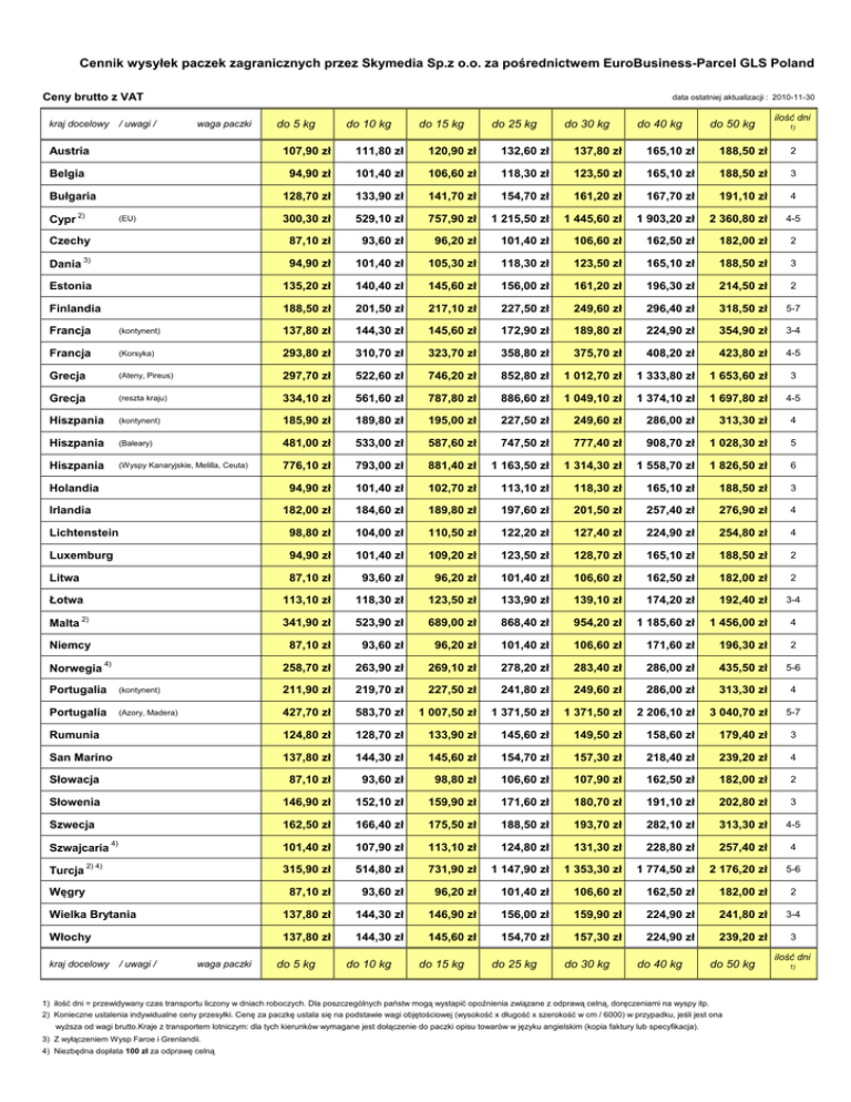 Cennik wysyłek paczek zagranicznych przez Skymedia Sp.z o.o. za pośrednictwem EuroBusiness-Parcel GLS Poland Ceny brutto z VAT kraj docelowy / uwagi / data ostatniej aktualizacji : 2010-11-30 waga paczki do 5 kg do 10 kg do 15 kg do 25 kg do 30 kg do 40 kg do 50 kg ilość dni 1) Austria 107,90 zł 111,80 zł 120,90 zł 132,60 zł 137,80 zł 165,10 zł 188,50 zł 2 Belgia 94,90 zł 101,40 zł 106,60 zł 118,30 zł 123,50 zł 165,10 zł 188,50 zł 3 128,70 zł 133,90 zł 141,70 zł 154,70 zł 161,20 zł 167,70 zł 191,10 zł 4 300,30 zł 529,10 zł 757,90 zł 1 215,50 zł 1 445,60 zł 1 903,20 zł 2 360,80 zł Czechy 87,10 zł 93,60 zł 96,20 zł 101,40 zł 106,60 zł 162,50 zł 182,00 zł 2 3) 94,90 zł 101,40 zł 105,30 zł 118,30 zł 123,50 zł 165,10 zł 188,50 zł 3 Estonia 135,20 zł 140,40 zł 145,60 zł 156,00 zł 161,20 zł 196,30 zł 214,50 zł 2 Finlandia 188,50 zł 201,50 zł 217,10 zł 227,50 zł 249,60 zł 296,40 zł 318,50 zł 5-7 Bułgaria Cypr 2) Dania (EU) 4-5 Francja (kontynent) 137,80 zł 144,30 zł 145,60 zł 172,90 zł 189,80 zł 224,90 zł 354,90 zł 3-4 Francja (Korsyka) 293,80 zł 310,70 zł 323,70 zł 358,80 zł 375,70 zł 408,20 zł 423,80 zł 4-5 Grecja (Ateny, Pireus) 297,70 zł 522,60 zł 746,20 zł 852,80 zł 1 012,70 zł 1 333,80 zł 1 653,60 zł 3 Grecja (reszta kraju) 334,10 zł 561,60 zł 787,80 zł 886,60 zł 1 049,10 zł 1 374,10 zł 1 697,80 zł 4-5 Hiszpania (kontynent) 185,90 zł 189,80 zł 195,00 zł 227,50 zł 249,60 zł 286,00 zł 313,30 zł 4 Hiszpania (Baleary) 481,00 zł 533,00 zł 587,60 zł 747,50 zł 777,40 zł 908,70 zł 1 028,30 zł 5 Hiszpania (Wyspy Kanaryjskie, Melilla, Ceuta) 776,10 zł 793,00 zł 881,40 zł 1 163,50 zł 1 314,30 zł 1 558,70 zł 1 826,50 zł 6 94,90 zł 101,40 zł 102,70 zł 113,10 zł 118,30 zł 165,10 zł 188,50 zł 3 182,00 zł 184,60 zł 189,80 zł 197,60 zł 201,50 zł 257,40 zł 276,90 zł 4 Lichtenstein 98,80 zł 104,00 zł 110,50 zł 122,20 zł 127,40 zł 224,90 zł 254,80 zł 4 Luxemburg 94,90 zł 101,40 zł 109,20 zł 123,50 zł 128,70 zł 165,10 zł 188,50 zł 2 Litwa 87,10 zł 93,60 zł 96,20 zł 101,40 zł 106,60 zł 162,50 zł 182,00 zł 2 113,10 zł 118,30 zł 123,50 zł 133,90 zł 139,10 zł 174,20 zł 192,40 zł 3-4 341,90 zł 523,90 zł 689,00 zł 868,40 zł 954,20 zł 1 185,60 zł 1 456,00 zł 4 87,10 zł 93,60 zł 96,20 zł 101,40 zł 106,60 zł 171,60 zł 196,30 zł 2 258,70 zł 263,90 zł 269,10 zł 278,20 zł 283,40 zł 286,00 zł 435,50 zł 5-6 4 Holandia Irlandia Łotwa Malta 2) Niemcy Norwegia 4) Portugalia (kontynent) 211,90 zł 219,70 zł 227,50 zł 241,80 zł 249,60 zł 286,00 zł 313,30 zł Portugalia (Azory, Madera) 427,70 zł 583,70 zł 1 007,50 zł 1 371,50 zł 1 371,50 zł 2 206,10 zł 3 040,70 zł Rumunia 124,80 zł 128,70 zł 133,90 zł 145,60 zł 149,50 zł 158,60 zł 179,40 zł 3 San Marino 137,80 zł 144,30 zł 145,60 zł 154,70 zł 157,30 zł 218,40 zł 239,20 zł 4 Słowacja 87,10 zł 93,60 zł 98,80 zł 106,60 zł 107,90 zł 162,50 zł 182,00 zł 2 Słowenia 146,90 zł 152,10 zł 159,90 zł 171,60 zł 180,70 zł 191,10 zł 202,80 zł 3 162,50 zł 166,40 zł 175,50 zł 188,50 zł 193,70 zł 282,10 zł 313,30 zł 4-5 101,40 zł 107,90 zł 113,10 zł 124,80 zł 131,30 zł 228,80 zł 257,40 zł 4 315,90 zł 514,80 zł 731,90 zł 1 147,90 zł 1 353,30 zł 1 774,50 zł 2 176,20 zł 87,10 zł 93,60 zł 96,20 zł 101,40 zł 106,60 zł 162,50 zł 182,00 zł 2 Wielka Brytania 137,80 zł 144,30 zł 146,90 zł 156,00 zł 159,90 zł 224,90 zł 241,80 zł 3-4 Włochy 137,80 zł 144,30 zł 145,60 zł 154,70 zł 157,30 zł 224,90 zł 239,20 zł 3 Szwecja Szwajcaria Turcja 4) 2) 4) Węgry kraj docelowy / uwagi / waga paczki do 5 kg do 10 kg do 15 kg do 25 kg do 30 kg do 40 kg do 50 kg 1) ilość dni = przewidywany czas transportu liczony w dniach roboczych. Dla poszczególnych państw mogą wystapić opoźnienia związane z odprawą celną, doręczeniami na wyspy itp. 2) Konieczne ustalenia indywidualne ceny przesyłki. Cenę za paczkę ustala się na podstawie wagi objętościowej (wysokość x długość x szerokość w cm / 6000) w przypadku, jeśli jest ona wyższa od wagi brutto.Kraje z transportem lotniczym: dla tych kierunków wymagane jest dołączenie do paczki opisu towarów w języku angielskim (kopia faktury lub specyfikacja). 3) Z wyłączeniem Wysp Faroe i Grenlandii. 4) Niezbędna dopłata 100 zł za odprawę celną 5-7 5-6 ilość dni 1)