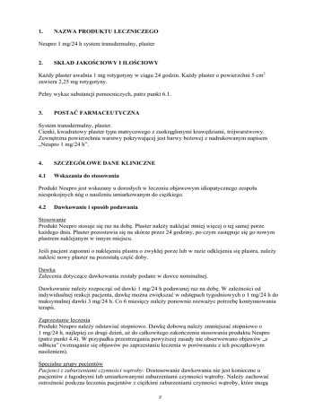1. NAZWA PRODUKTU LECZNICZEGO Neupro 1 mg/24 h system transdermalny, plaster 2. SKŁAD JAKOŚCIOWY I ILOŚCIOWY Każdy plaster uwalnia 1 mg rotygotyny w ciągu 24 godzin. Każdy plaster o powierzchni 5 cm2 zawiera 2,25 mg rotygotyny. Pełny wykaz substancji pomocniczych, patrz punkt 6.1. 3. POSTAĆ FARMACEUTYCZNA System transdermalny, plaster. Cienki, kwadratowy plaster typu matrycowego z zaokrąglonymi krawędziami, trójwarstwowy. Zewnętrzna powierzchnia warstwy pokrywającej jest barwy beżowej z nadrukowanym napisem „Neupro 1 mg/24 h”. 4. SZCZEGÓŁOWE DANE KLINICZNE 4.1 Wskazania do stosowania Produkt Neupro jest wskazany u dorosłych w leczeniu objawowym idiopatycznego zespołu niespokojnych nóg o nasileniu umiarkowanym do ciężkiego. 4.2 Dawkowanie i sposób podawania Stosowanie Produkt Neupro stosuje się raz na dobę. Plaster należy naklejać mniej więcej o tej samej porze każdego dnia. Plaster pozostawia się na skórze przez 24 godziny, po czym zastępuje się go nowym plastrem naklejanym w innym miejscu. Jeśli pacjent zapomni o naklejeniu plastra o zwykłej porze lub w razie odklejenia się plastra, należy nakleić nowy plaster na pozostałą część doby. Dawka Zalecenia dotyczące dawkowania zostały podane w dawce nominalnej. Dawkowanie należy rozpocząć od dawki 1 mg/24 h podawanej raz na dobę. W zależności od indywidualnej reakcji pacjenta, dawkę można zwiększać w odstępach tygodniowych o 1 mg/24 h do maksymalnej dawki 3 mg/24 h. Co 6 miesięcy należy ponownie rozważyc potrzebę kontynuowania terapii. Zaprzestanie leczenia Produkt Neupro należy odstawiać stopniowo. Dawkę dobową należy zmniejszać stopniowo o 1 mg/24 h, najlepiej co drugi dzień, aż do całkowitego zakończenia stosowania produktu Neupro (patrz punkt 4.4). W przypadku przestrzegania powyższej zasady nie obserwowano objawów „z odbicia” (wzmaganie się objawów po zaprzestaniu leczenia w porównaniu z ich początkowym nasileniem). Specjalne grupy pacjentów Pacjenci z zaburzeniami czynności wątroby: Dostosowanie dawkowania nie jest konieczne u pacjentów z łagodnymi lub umiarkowanymi zaburzeniami czynności wątroby. Należy zachować ostrożność podczas leczenia pacjentów z ciężkimi zaburzeniami czynności wątroby, które mogą 2 prowadzić do zmniejszenia klirensu rotygotyny. Rotygotyna nie była badana w tej grupie pacjentów. W razie nasilenia się zaburzeń czynności wątroby konieczne może być zmniejszenie dawki. Pacjenci z zaburzeniami czynności nerek: Dostosowanie dawkowania nie jest konieczne u pacjentów z łagodnymi do ciężkich zaburzeniami czynności nerek, w tym u osób wymagających dializy. Niespodziewana kumulacja rotygotyny może również wystapić w przypadku ostrego pogorszenia czynności nerek (patrz punkt 5.2). Dzieci i młodzież Nie ustalono bezpieczeństwa stosowania i skuteczności rotygotyny u dzieci i młodzieży. Brak dostępnych danych. Sposób podawania Plaster należy nakleić na czystą, suchą, nieuszkodzoną i zdrową skórę brzucha, uda, biodra, bocznej części tułowia, barku lub ramienia. Należy unikać ponownego naklejania plastra w tym samym miejscu przez okres 14 dni. Nie wolno stosować plastra Neupro na skórę zaczerwienioną, podrażnioną lub uszkodzoną (patrz punkt 4.4). Stosowanie i sposób obchodzenia się z produktem: Każdy plaster jest zapakowany w saszetkę i należy go nakleić na skórę bezpośrednio po otwarciu saszetki. Należy zdjąć jedną połowę warstwy ochronnej, przykleić lepką część plastra do skóry i silnie docisnąć. Następnie odchylić plaster i zdjąć drugą część warstwy ochronnej. Nie należy dotykać lepkiej powierzchni plastra. Plaster należy silnie docisnąć dłonią przez około 20 do 30 sekund, aby zapewnić jego właściwe przyklejenie. Jeśli plaster się odklei, należy nakleić nowy plaster na pozostałą część 24-godzinnego okresu do podania następnej dawki. Nie należy przecinać plastra na części. 4.3 Przeciwwskazania Nadwrażliwość na substancję czynną lub na którąkolwiek substancję pomocniczą wymienioną w punkcie 6.1. Badanie metodą rezonansu magnetycznego lub kardiowersja (patrz punkt 4.4). 4.4 Specjalne ostrzeżenia i środki ostrożności dotyczące stosowania Rezonans magnetyczny (NMR) i kardiowersja Warstwa pokrywająca plastra Neupro zawiera aluminium. Aby uniknąć oparzeń skóry, plaster Neupro należy zdjąć przed wykonaniem u pacjenta badania metodą rezonansu magnetycznego (NMR) lub kardiowersji. Niedociśnienie ortostatyczne Agoniści dopaminy zaburzają układową regulację ciśnienia tętniczego powodując niedociśnienie ortostatyczne. Zdarzenia te występowały także podczas leczenia rotygotyną, ale ich częstość była podobna do obserwowanej u pacjentów otrzymujących placebo. Zaleca się kontrolowanie ciśnienia tętniczego, zwłaszcza w początkowym okresie leczenia, w związku z ogólnym ryzykiem wystąpienia niedociśnienia ortostatycznego związanego z leczeniem dopaminergicznym. Omdlenia W badaniach klinicznych z zastosowaniem rotygotyny obserwowano omdlenia, ale częstość ich występowania była podobna do tej obserwowanej u pacjentów otrzymujących placebo. Przypadki nagłego zasypiania i senność 3 Stosowanie rotygotyny było związane z sennością i przypadkami nagłego zasypiania. Zgłaszano przypadki nagłego zasypiania pacjentów w trakcie aktywności dziennej, czasami bez żadnych objawów poprzedzających. Lekarze zapisujący produkt Neupro powinni stale oceniać pacjentów pod kątem ospałości lub senności, ponieważ pacjenci mogą nie zdawać sobie sprawy z tych objawów dopóki nie zostaną bezpośrednio zapytani. Należy starannie rozważyć zmniejszenie dawki produktu lub zakończenie leczenia. Zaburzenia kontroli nawyków i popędów Należy regularnie monitorować pacjentów ze względu na możliwość wystąpienia zaburzeń kontroli nawyków i popędów. Należy poinformować pacjen