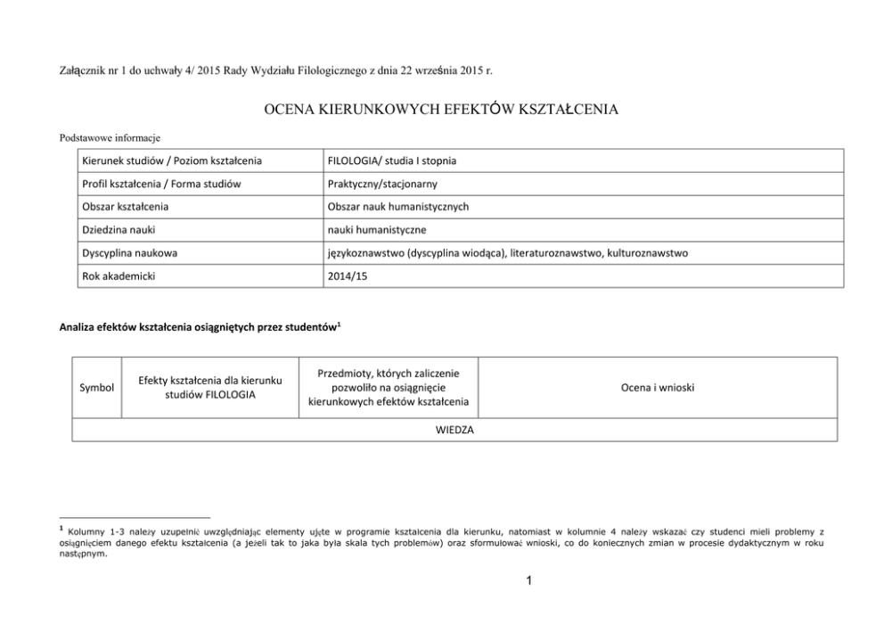 Załącznik nr 1 do uchwały 4/ 2015 Rady Wydziału Filologicznego z dnia 22 września 2015 r. OCENA KIERUNKOWYCH EFEKTÓW KSZTAŁCENIA Podstawowe informacje Kierunek studiów / Poziom kształcenia FILOLOGIA/ studia I stopnia Profil kształcenia / Forma studiów Praktyczny/stacjonarny Obszar kształcenia Obszar nauk humanistycznych Dziedzina nauki nauki humanistyczne Dyscyplina naukowa językoznawstwo (dyscyplina wiodąca), literaturoznawstwo, kulturoznawstwo Rok akademicki 2014/15 Analiza efektów kształcenia osiągniętych przez studentów1 Symbol Efekty kształcenia dla kierunku studiów FILOLOGIA Przedmioty, których zaliczenie pozwoliło na osiągnięcie kierunkowych efektów kształcenia Ocena i wnioski WIEDZA 1 Kolumny 1-3 należy uzupełnić uwzględniając elementy ujęte w programie kształcenia dla kierunku, natomiast w kolumnie 4 należy wskazać czy studenci mieli problemy z osiągnięciem danego efektu kształcenia (a jeżeli tak to jaka była skala tych problemów) oraz sformułować wnioski, co do koniecznych zmian w procesie dydaktycznym w roku następnym. 1 K_W01 Ma podstawową wiedzę o miejscu i znaczeniu kształcenia filologicznego w kontekście nauk humanistycznych, o specyfice kształcenia filologicznego, którego celem jest osiągnięcie poziomu językowego na poziomie C1 i kompetencji interkulturowej Łacina Praktyka zawodowa PNJA Historia literatury angielskiej i amerykańskiej/niemieckiej Historia W.Brytanii i USA/Historia Niemiec WOKAJ/PNJN/PNJR/ Metodologia badań i pisanie prac naukowo- badawczych/ Tłumaczenie ustne rozmów handlowych/ Tłumaczenie pisemne korespondencji i tekstów ekonomicznych/ Komunikacja interpersonalna/ Praktyka PNJR: Większość studentów opanowała lub utrwaliła poprawne zastosowanie materiału, przewidzianego w sylabusie na ten rok. Częściowo pomogła w tym mała liczebność grupy. Historia Wielkiej Brytanii i USA: Bardzo trudno dokonać jest oceny osiągnięcia konkretnego efektu kształcenia przez studentów przede wszystkim z powodu poziomu językowego studentów; pomimo upraszczania języka na wykładach istnieje prawdopodobieństwo, że wiele osób może nie rozumieć (całości lub części) wykładów Historia Niemiec: wykład realizowany w dużej mierze w języku polskim z powodu braku dostatecznej znajomości języka. Efekty w odniesieniu do zrozumienia treści, informacji, interpretacji problemów osiągnięty. 2 K_W02 Zna podstawową terminologię z dziedziny językoznawstwa, językoznawstwa stosowanego, kulturoznawstwa, literaturoznawstwa w obrębie filologii angielskiej lub germańskiej Łacina PNJA Gramatyka opisowa (fonetyka i fonologia) Gramatyka opisowa (składnia i morfologia) Historia literatury angielskiej i amerykańskiej/niemieckiej Historia W. Brytanii i USA WOKAOJ PNJN/PNJR Metodologia badań i pisanie prac naukowo- badawczych Gramatyka opisowa: Duży odsetek studentów nie poradził sobie z opanowaniem specjalistycznej terminologii, tym bardziej, że były to terminy w języku obcym. Ograniczenie ilości terminów, komentarze i opisy mogą pomóc uniknąć tego typu problemów. Rozkład procentowy ocen 3-5 wskazuje, że zdecydowana większość studentów ma uporządkowaną wiedzę szczegółową z zakresu fonetyki artykulacyjnej języka angielskiego. W przyszłości studenci dla których osiągnięcie tego efektu jest szczególnie trudne powinni częściej uczestniczyć w indywidualnych konsultacjach z wykładowcą. W celu lepszej oceny osiągnięcia efektu przez studentów należy rozważyć wprowadzenie dodatkowej metody oceny: oceny aktywności studentów podczas zajęć. Seminarium dyplomowe Historia literatury angielskiej: Znaczna część studentów zapoznała się z podstawową terminologią z zakresu literaturoznawstwa amerykańskiego; Część studentów, która miała z tym problemy, posiada nieuporządkowaną wiedzę z zakresu literaturoznawstwa angielskiego i niski poziom znajomości języka angielskiego. Seminarium dyplomowe: student rozumie podstawowe pojęcia i terminologię z dziedziny seminarium. K_W03 Ma podstawową wiedzę dotyczącą historii Wielkiej Brytanii, USA lub Republiki Federalnej Niemiec Historia W. Brytanii i USA WOKAOJ Większość studentów nie miała problemów z osiągnięciem tego efektu 3 K_W04 Ma podstawową uporządkowaną wiedzę z historii literatury Wielkiej Brytanii, USA lub Republiki Federalnej Niemiec w kontekście europejskiej historii i tradycji literackiej WOKAOJ/ Historia literatury angielskiej i amerykańskiej/niemieckiej Większość studentów nie miała problemów z osiągnięciem tego efektu Historia literatury angielskiej Studenci, którzy nie zaliczyli kursu nie posiadali wiedzy z zakresu europejskiej historii i tradycji literackiej z zajęć w szkole średniej, nie nadrobili braków we własnym zakresie, bądź nie uczęszczali na wykłady czy na zajęcia, na których takie zagadnienia były omawiane. Zamierzam wprowadzić ścisłą kontrole obecności na zajęciach z przedmiotu i nadal zachęcać do indywidualnych konsultacji w trakcie dyżuru dla osób chętnych do nadrobienia zaległości. Należy zachęcać studentów także do pracy nad językiem obcym, w którym prowadzone są wykłady i zajęcia. Historia literatury niemieckiej: studenci osiągnęli efekt, studenci poznali najważniejsze wydarzenia i kierunki w epokach literackich mające znaczenie dla rozwoju historii literatury niemieckojęzycznej 4 K_W05 Ma szczegółową wiedzę z historii literatury Wielkiej Brytanii, USA lub Republiki Federalnej Niemiec oraz wiedzę niezbędną do analizy i interpretacji wybranych, reprezentatywnych tekstów literackich Historia literatury angielskiej i amerykańskiej/niemieckiej WOKAOJ Większość studentów nie miała problemów z osiągnięciem tego efektu Historia literatury angielskiej: Znaczna część studentów nabyła szczegółową wiedzę z zakresu historii literatury Wielkiej Brytanii, którą obejmował kurs. Pozostała część stud