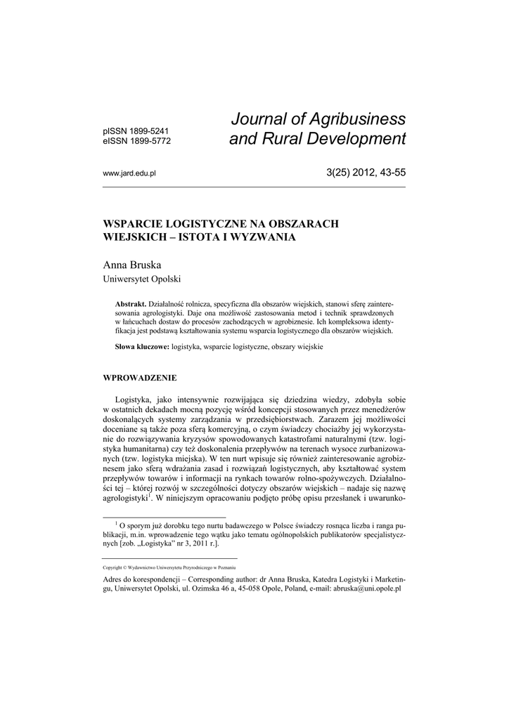 pISSN 1899-5241 eISSN 1899-5772 Journal of Agribusiness and Rural Development www.jard.edu.pl 3(25) 2012, 43-55 WSPARCIE LOGISTYCZNE NA OBSZARACH WIEJSKICH – ISTOTA I WYZWANIA Anna Bruska Uniwersytet Opolski Abstrakt. Działalność rolnicza, specyficzna dla obszarów wiejskich, stanowi sferę zainteresowania agrologistyki. Daje ona możliwość zastosowania metod i technik sprawdzonych w łańcuchach dostaw do procesów zachodzących w agrobiznesie. Ich kompleksowa identyfikacja jest podstawą kształtowania systemu wsparcia logistycznego dla obszarów wiejskich. Słowa kluczowe: logistyka, wsparcie logistyczne, obszary wiejskie WPROWADZENIE Logistyka, jako intensywnie rozwijająca się dziedzina wiedzy, zdobyła sobie w ostatnich dekadach mocną pozycję wśród koncepcji stosowanych przez menedżerów doskonalących systemy zarządzania w przedsiębiorstwach. Zarazem jej możliwości doceniane są także poza sferą komercyjną, o czym świadczy chociażby jej wykorzystanie do rozwiązywania kryzysów spowodowanych katastrofami naturalnymi (tzw. logistyka humanitarna) czy też doskonalenia przepływów na terenach wysoce zurbanizowanych (tzw. logistyka miejska). W ten nurt wpisuje się również zainteresowanie agrobiznesem jako sferą wdrażania zasad i rozwiązań logistycznych, aby kształtować system przepływów towarów i informacji na rynkach towarów rolno-spożywczych. Działalności tej – której rozwój w szczególności dotyczy obszarów wiejskich – nadaje się nazwę agrologistyki1. W niniejszym opracowaniu podjęto próbę opisu przesłanek i uwarunko1 O sporym już dorobku tego nurtu badawczego w Polsce świadczy rosnąca liczba i ranga publikacji, m.in. wprowadzenie tego wątku jako tematu ogólnopolskich publikatorów specjalistycznych [zob. „Logistyka” nr 3, 2011 r.]. Copyright © Wydawnictwo Uniwersytetu Przyrodniczego w Poznaniu Adres do korespondencji – Corresponding author: dr Anna Bruska, Katedra Logistyki i Marketingu, Uniwersytet Opolski, ul. Ozimska 46 a, 45-058 Opole, Poland, e-mail: [email protected] 44 A. Bruska wań zapotrzebowania na działania logistyczne występującego na obszarach wiejskich oraz identyfikacji wyzwań, jakie pociąga za sobą uruchomienie wsparcia logistycznego. WSPARCIE LOGISTYCZNE – POJĘCIE I UWARUNKOWANIA Wsparcie logistyczne jest interpretowane jako odzwierciedlenie charakteru funkcji logistycznych, które towarzyszą dowolnym systemom i procesom społeczno-ekonomicznym [Chaberek 2002]. Każdy proces zaspokajania potrzeb w gospodarce rynkowej wymaga bowiem uruchomienia przepływu towarów, zasobów lub przemieszczenia klienta bądź kombinacji tych przesunięć – zależnie od typu potrzeby. Dążenie do ekonomicznie efektywnej realizacji tych procesów uzasadnia kształtowanie przepływów w sposób zintegrowany, czyli zgodnie z koncepcją logistyki i w ramach zoptymalizowanych systemów logistycznych. System wsparcia logistycznego Chaberek [2002] określa jako podsystem dowolnej organizacji, który wspiera jej podstawowy proces wytwarzania dóbr poprzez integrację wszystkich działań związanych ze skutecznym efektywnym i korzystnym przepływem niezbędnych do wytworzenia dobra podstawowego zasobów oraz wspierający obsługę procesu wytwarzania w zakresie zapewnienia jego dostępności, niezawodności. W skali mikro, zadania logistyczne stanowią zatem konsekwencję zapotrzebowania na wsparcie logistyczne ze strony systemu wytwórczego. Adaptując określenie wsparcia logistycznego i jego systemu do szerszej skali działań podejmowanych w agrobiznesie, można nawiązać do enumeracji podstawowych zadań logistycznego procesu wspierającego zaspokajanie potrzeb na poziomie gminy [Niziński i Kolator 2007]. Obejmuje on zadania związane z zaspokajaniem potrzeb w zakresie konsumpcji indywidualnej gospodarstw domowych, dostępem do usług konsumpcji zbiorowej oraz procesy wynikające z potrzeb zgłaszanych przez lokalną wytwórczość (tab. 1). Powyższy katalog nie wyczerpuje jednak zadań, jakie stoją przed systemem wsparcia logistycznego na obszarach wiejskich. Ich struktura wynika z uwarunkowań lokalnych systemów osadniczych, które pełnią wiele funkcji powiązanych m.in. ze sposobem użytkowania gruntu (tab. 2). Przedstawione w tabelach czynniki stanowią podstawowe grupy uwarunkowań systemu wsparcia logistycznego na danym obszarze, bowiem wsparcie przepływów fizycznych i informacyjnych wynika bezpośrednio z zadań, jakie realizuje się na danym terenie na rzecz zainteresowanych stron (mieszkańców, przedsiębiorstw, instytucji, turystów i in.) oraz jest powiązane ze sposobem użytkowania przestrzeni (zwłaszcza dominującymi funkcjami). Zarówno jeden, jak i drugi czynnik generuje określoną strukturę przepływów, a jej obsługa jest realizowana w ramach systemów wsparcia logistycznego. Dodatkowym czynnikiem, który będzie warunkować zarówno przyszły kształt obszarów wiejskich, jak i – w konsekwencji – również systemów wsparcia logistycznego na tych terenach jest presja na ich rozwój wielofunkcyjny. Skutkiem tego będą dalsze modyfikacje zarówno struktury przepływów w obrębie obszarów wiejskich, jak i w ich relacji z terenami zurbanizowanymi. Journal of Agribusiness and Rural Development Wsparcie logistyczne na obszarach wiejskich – istota i wyzwania 45 Tabela 1. Przykładowy katalog zadań logistycznych na obszarach wiejskich Table 1. Sample list of logistic tasks in rural areas Zakres funkcjonalny Functional scope Zadania wsparcia logistycznego Tasks of logistic support Konsumpcja indywidualna Private consumption Zapewnianie powiązań umożliwiających zaopatrzenie w towary (produkty i usługi) zaspokajające potrzeby mieszkańców oraz pozostałych nabywców indywidualnych To provide links to enable the supply of goods (products and services) to meet the needs of residents and other individuals Konsumpcja zbiorowa Collective consumption Tworzenie warunków dostę