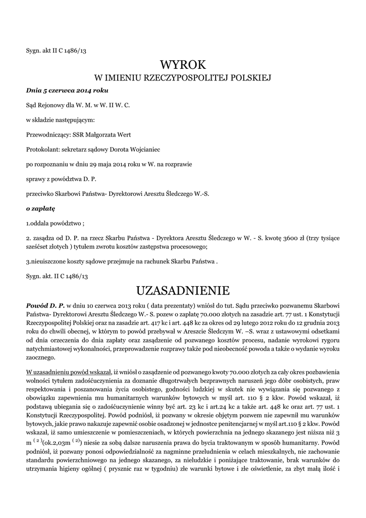 Sygn. akt II C 1486/13 WYROK W IMIENIU RZECZYPOSPOLITEJ POLSKIEJ Dnia 5 czerwca 2014 roku Sąd Rejonowy dla W. M. w W. II W. C. w składzie następującym: Przewodniczący: SSR Małgorzata Wert Protokolant: sekretarz sądowy Dorota Wojcianiec po rozpoznaniu w dniu 29 maja 2014 roku w W. na rozprawie sprawy z powództwa D. P. przeciwko Skarbowi Państwa- Dyrektorowi Aresztu Śledczego W.-S. o zapłatę 1.oddala powództwo ; 2. zasądza od D. P. na rzecz Skarbu Państwa - Dyrektora Aresztu Śledczego w W. - S. kwotę 3600 zł (trzy tysiące sześćset złotych ) tytułem zwrotu kosztów zastępstwa procesowego; 3.nieuiszczone koszty sądowe przejmuje na rachunek Skarbu Państwa . Sygn. akt. II C 1486/13 UZASADNIENIE Powód D. P. w dniu 10 czerwca 2013 roku ( data prezentaty) wniósł do tut. Sądu przeciwko pozwanemu Skarbowi Państwa- Dyrektorowi Aresztu Śledczego W.- S. pozew o zapłatę 70.000 złotych na zasadzie art. 77 ust. 1 Konstytucji Rzeczypospolitej Polskiej oraz na zasadzie art. 417 kc i art. 448 kc za okres od 29 lutego 2012 roku do 12 grudnia 2013 roku do chwili obecnej, w którym to powód przebywał w Areszcie Śledczym W. –S. wraz z ustawowymi odsetkami od dnia orzeczenia do dnia zapłaty oraz zasądzenie od pozwanego kosztów procesu, nadanie wyrokowi rygoru natychmiastowej wykonalności, przeprowadzenie rozprawy także pod nieobecność powoda a także o wydanie wyroku zaocznego. W uzasadnieniu powód wskazał, iż wniósł o zasądzenie od pozwanego kwoty 70.000 złotych za cały okres pozbawienia wolności tytułem zadośćuczynienia za doznanie długotrwałych bezprawnych naruszeń jego dóbr osobistych, praw respektowania i poszanowania życia osobistego, godności ludzkiej w skutek nie wywiązania się pozwanego z obowiązku zapewnienia mu humanitarnych warunków bytowych w myśl art. 110 § 2 kkw. Powód wskazał, iż podstawą ubiegania się o zadośćuczynienie winny być art. 23 kc i art.24 kc a także art. 448 kc oraz art. 77 ust. 1 Konstytucji Rzeczypospolitej. Powód podniósł, iż pozwany w okresie objętym pozwem nie zapewnił mu warunków bytowych, jakie prawo nakazuje zapewnić osobie osadzonej w jednostce penitencjarnej w myśl art.110 § 2 kkw. Powód wskazał, iż samo umieszczenie w pomieszczeniach, w których powierzchnia na jednego skazanego jest niższa niż 3 m ( 2 )(ok.2,03m ( 2)) niesie za sobą dalsze naruszenia prawa do bycia traktowanym w sposób humanitarny. Powód podniósł, iż pozwany ponosi odpowiedzialność za nagminne przeludnienia w celach mieszkalnych, nie zachowanie standardu powierzchniowego na jednego skazanego, za nieludzkie i poniżające traktowanie, brak warunków do utrzymania higieny ogólnej ( prysznic raz w tygodniu) złe warunki bytowe i złe oświetlenie, za zbyt małą ilość i za rzadko odbywające się zajęcia KO w związku z tym powód został poddany niezgodnie z prawem, nieludzkiemu i poniżającemu traktowaniu wynikającego z nie przestrzegania prawa a przecież warunki wykonywania kary nie powinny być źródłem dolegliwości innych niż bezpośrednio związanych z pozbawieniem wolności, a także zmuszenie powoda do przebywania na świetlicy przerobionej na cele, bez dostępu do wody bieżącej, toalety ( zamiast toalety było wiaderko), bez szafek na żywość. Powód wskazał, iż był zmuszony do noszenia brudnej, zniszczonej odzieży przy każdorazowym opuszczeniu pawilonu mieszkalnego, przez co był narażony na śmiech innych osadzonych a także funkcjonariuszy służby więziennej, a także był zmuszony do przebywania w pomieszczeniach, w których nie było dostatecznego dopływu światła słonecznego oraz bark możliwości patrzenia w dal przez zastosowanie tzw. „ blind”, przez co został narażony na pogorszenie wzroku, powód również podniósł, iż był zmuszany do spania na materacach bez odpowiedniego atestu, które często były zamoczone i zapleśniałe, co spowodowało u powoda choroby skóry oraz częste bóle kręgosłupa, ponieważ materace były wypełnione kawałkami pociętego materiału, a ponadto powód wskazał, iż wywożenie go do oddziału zewnętrznego w G. wywoływał u niego stres zmianą otoczenia. Ponadto powód wskazał, iż powszechnie przyjmuje się, że traktowanie „ humanitarne” oznacza także postępowanie z osobą pozbawienia wolności, które respektuje pewne minimalne potrzeby każdego człowieka, określone przez odniesienie przeciętnych standardów danego społeczeństwa. Powód wskazał, iż zasada ta wynika z konieczności zapewnienia pełnej ochrony godności ludzkiej i musi być stosowana również w odniesieniu do skazanych i tymczasowo aresztowanych. Powód przytoczył, iż standardy humanitarnego traktowania zaznacza przede wszystkim orzecznictwo ETPCZ w Strasburgu dotyczące art.3 Europejskiej Konwencji o Ochronie Praw Człowieka i podstawowych wolności z 04 listopada 1950 roku, ratyfikowana przez Polskę w 1993 roku, która stanowi, że nikt nie może być poddany torturom ani nieludzkiemu lub poniżającemu traktowaniu czy karaniu. Ponadto powód podniósł, iż został naruszony nakaz poszanowania życia prywatnego obywateli i ich prawo do intymności, co do osób osadzonych w AŚ lub ZK oznacza obowiązek zapewnienia takich warunków bytowych i sanitarnych, w których godność ludzka i prawo do intymności nie doznają istotnego uszczerbku. Wskazał również, iż zajmując się wielkością celi, w jakiej powinni przebywać więźniowie jako element zapewnienia godziwych warunków odbywania kary ETPCZ uznał za sprzeczne ze standardem Europejskiego Komitetu zapobiegania torturom- powierzchnia 2,8 m ( 2)jaka przypada na osadzonego. Wskazał także, że umieszczenie wielu osób na bardzo małej powierzchni nie sprzyja skutecznej ochronie zdrowia, przeciwnie ułatwia się rozprzestrzenianiu się chorób, co może być źródłem zagrożenia zdrowia w ekstremalnych warunkach nawet życiu. Podniósł, iż prawa podmiotowego można dochod
