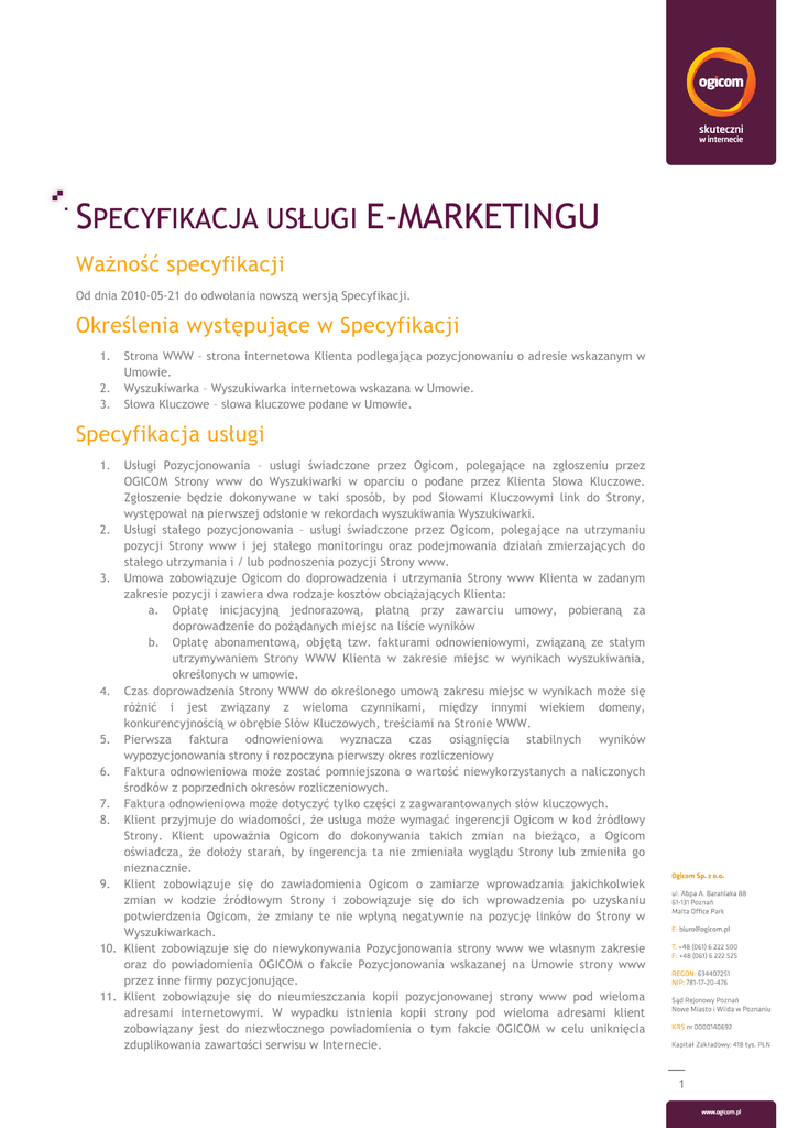 SPECYFIKACJA USŁUGI E-MARKETINGU Ważność specyfikacji Od dnia 2010-05-21 do odwołania nowszą wersją Specyfikacji. Określenia występujące w Specyfikacji 1. 2. 3. Strona WWW – strona internetowa Klienta podlegająca pozycjonowaniu o adresie wskazanym w Umowie. Wyszukiwarka – Wyszukiwarka internetowa wskazana w Umowie. Słowa Kluczowe – słowa kluczowe podane w Umowie. Specyfikacja usługi 1. Usługi Pozycjonowania – usługi świadczone przez Ogicom, polegające na zgłoszeniu przez OGICOM Strony www do Wyszukiwarki w oparciu o podane przez Klienta Słowa Kluczowe. Zgłoszenie będzie dokonywane w taki sposób, by pod Słowami Kluczowymi link do Strony, występował na pierwszej odsłonie w rekordach wyszukiwania Wyszukiwarki. 2. Usługi stałego pozycjonowania – usługi świadczone przez Ogicom, polegające na utrzymaniu pozycji Strony www i jej stałego monitoringu oraz podejmowania działań zmierzających do stałego utrzymania i / lub podnoszenia pozycji Strony www. 3. Umowa zobowiązuje Ogicom do doprowadzenia i utrzymania Strony www Klienta w zadanym zakresie pozycji i zawiera dwa rodzaje kosztów obciążających Klienta: a. Opłatę inicjacyjną jednorazową, płatną przy zawarciu umowy, pobieraną za doprowadzenie do pożądanych miejsc na liście wyników b. Opłatę abonamentową, objętą tzw. fakturami odnowieniowymi, związaną ze stałym utrzymywaniem Strony WWW Klienta w zakresie miejsc w wynikach wyszukiwania, określonych w umowie. 4. Czas doprowadzenia Strony WWW do określonego umową zakresu miejsc w wynikach może się różnić i jest związany z wieloma czynnikami, między innymi wiekiem domeny, konkurencyjnością w obrębie Słów Kluczowych, treściami na Stronie WWW. 5. Pierwsza faktura odnowieniowa wyznacza czas osiągnięcia stabilnych wyników wypozycjonowania strony i rozpoczyna pierwszy okres rozliczeniowy 6. Faktura odnowieniowa może zostać pomniejszona o wartość niewykorzystanych a naliczonych środków z poprzednich okresów rozliczeniowych. 7. Faktura odnowieniowa może dotyczyć tylko części z zagwarantowanych słów kluczowych. 8. Klient przyjmuje do wiadomości, że usługa może wymagać ingerencji Ogicom w kod źródłowy Strony. Klient upoważnia Ogicom do dokonywania takich zmian na bieżąco, a Ogicom oświadcza, że dołoży starań, by ingerencja ta nie zmieniała wyglądu Strony lub zmieniła go nieznacznie. 9. Klient zobowiązuje się do zawiadomienia Ogicom o zamiarze wprowadzania jakichkolwiek zmian w kodzie źródłowym Strony i zobowiązuje się do ich wprowadzenia po uzyskaniu potwierdzenia Ogicom, że zmiany te nie wpłyną negatywnie na pozycję linków do Strony w Wyszukiwarkach. 10. Klient zobowiązuje się do niewykonywania Pozycjonowania strony www we własnym zakresie oraz do powiadomienia OGICOM o fakcie Pozycjonowania wskazanej na Umowie strony www przez inne firmy pozycjonujące. 11. Klient zobowiązuje się do nieumieszczania kopii pozycjonowanej strony www pod wieloma adresami internetowymi. W wypadku istnienia kopii strony pod wieloma adresami klient zobowiązany jest do niezwłocznego powiadomienia o tym fakcie OGICOM w celu uniknięcia zduplikowania zawartości serwisu w Internecie. 1