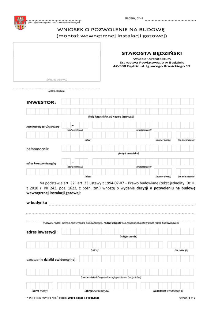 Będzin, dnia (nr rejestru organu nadzoru budowlanego) WNIOSEK O POZWOLENIE NA BUDOWĘ (montaż wewnętrznej instalacji gazowej) STAROSTA BĘDZIŃSKI Wydział Architektury Starostwa Powiatowego w Będzinie 42-500 Będzin ul. Ignacego Krasickiego 17 (pieczęć wpływu) (znak sprawy) INWESTOR: (imię i nazwisko lub nazwa instytucji) zamieszkały (a) /z siedzibą (kod pocztowy) (miejscowość) (ulica) (numer domu) (nr mieszkania) (numer domu) (nr mieszkania) pełnomocnik: (imię i nazwisko) adres korespondencyjny (kod pocztowy) (miejscowość) (ulica) Na podstawie art. 32 i art. 33 ustawy z 1994-07-07 – Prawo budowlane (tekst jednolity: Dz.U. z 2010 r. Nr 243, poz. 1623, z późn. zm.) wnoszę o wydanie decyzji o pozwoleniu na budowę wewnętrznej instalacji gazowej: w budynku (nazwa i rodzaj całego zamierzenia budowlanego, rodzaj obiektu lub zespołu obiektów bądź robót budowlanych) adres inwestycji: (miejscowość) (ulica) (nr posesji) oznaczenie działki ewidencyjnej: (numer działki wg ewidencji gruntów i budynków) (karta mapy) (obręb ewidencyjny) * PROSIMY WYPEŁNIAĆ DRUK WIELKIMI LITERAMI (jednostka ewidencyjna) Strona 1 z 2 Do wniosku dołączam1: 1) dowód zapłaty należnej opłaty skarbowej2, 2) cztery egzemplarze projektu budowlanego wraz z3: a) opiniami, uzgodnieniami, pozwoleniami i innymi dokumentami wymaganymi przepisami szczególnymi, w tym, stosownie do potrzeb: oświadczenie o zapewnieniu dostawy gazu i warunki przyłączenia obiektu do sieci gazowej, wstępna opinia kominiarska, b) informacją dotyczącą bezpieczeństwa i ochrony zdrowia ze względu na specyfikę projektowanego obiektu budowlanego, c) oświadczeniem projektanta, a także sprawdzającego, o sporządzeniu projektu budowlanego zgodnie z obowiązującymi przepisami oraz zasadami wiedzy technicznej, o którym mowa w art. 20 ust. 4 ustawy – Prawo budowlane, projekt winien być uzgodniony przez rzeczoznawców i organy wymagane obowiązującymi przepisami szczególnymi, 3) kserokopię uprawnień projektanta i kserokopię zaświadczenia o przynależności do właściwej izby zawodowej, aktualnego na dzień opracowania projektu, 4) kserokopię uprawnień sprawdzającego i kserokopię zaświadczenia o przynależności do właściwej izby zawodowej, aktualnego na dzień opracowania projektu, 5) oświadczenie o posiadanym prawie do dysponowania nieruchomością na cele budowlane, a) odpis z Rejestru Przedsiębiorców Krajowego Rejestru Sądowego określający osoby uprawnione do reprezentacji podmiotu (w przypadku, gdy inwestorem jest osoba prawna), b) zaświadczenie o wpisie do ewidencji działalności gospodarczej (w przypadku prowadzenia takiej działalności), 6) kopię aktualnej mapy zasadniczej i ewidencyjnej z państwowego zasobu geodezyjnego i kartograficznego, 7) upoważnienie udzielone osobie działającej w moim imieniu (pełnomocnictwo) – wraz z opłatą skarbową w wysokości 17 zł od każdego stosunku pełnomocnictwa2, 8) w przypadku prowadzenia robót budowlanych przy obiekcie wpisanym do rejestru zabytków lub na obszarze wpisanym do rejestru zabytków – pozwolenie na prowadzenie tych robót wydane przez Śląskiego Wojewódzkiego Konserwatora Zabytków w Katowicach. Zgodnie z art. 23 ust. 1 ustawy z 1997-08-29 o ochronie danych osobowych (tekst jednolity: Dz.U. z 2002 r. Nr 101, poz. 926, z późn. zm.) wyrażam zgodę na przetwarzanie przez Starostę Będzińskiego (Wydział Architektury Starostwa Powiatowego w Będzinie zs. w Będzinie przy ul. Ignacego Krasickiego 17) danych dotyczących mojej osoby w celu przeprowadzenia postępowania administracyjnego (dotyczy osób fizycznych). Adnotacja o opłacie skarbowej (podpis inwestora lub osoby przez niego upoważnionej) (numer telefonu kontaktowego) (podpis osoby przyjmującej wniosek z załącznikami) 1 2 3 Niepotrzebne skreślić Składający wniosek zobowiązany jest dołączyć dowód zapłaty należnej opłaty skarbowej nie później niż w ciągu 3 dni od chwili złożenia wniosku Wszystkie dokumenty załączone do projektu powinny być poświadczone przez projektanta za zgodność z oryginałem 12 września 2011 Strona 2 z 2