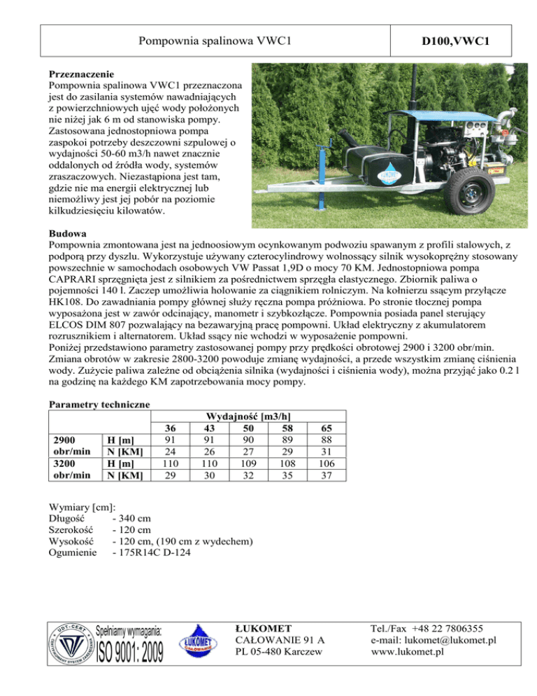Pompownia spalinowa VWC1 D100,VWC1 Przeznaczenie Pompownia spalinowa VWC1 przeznaczona jest do zasilania systemów nawadniających z powierzchniowych ujęć wody położonych nie niżej jak 6 m od stanowiska pompy. Zastosowana jednostopniowa pompa zaspokoi potrzeby deszczowni szpulowej o wydajności 50-60 m3/h nawet znacznie oddalonych od źródła wody, systemów zraszaczowych. Niezastąpiona jest tam, gdzie nie ma energii elektrycznej lub niemożliwy jest jej pobór na poziomie kilkudziesięciu kilowatów. Budowa Pompownia zmontowana jest na jednoosiowym ocynkowanym podwoziu spawanym z profili stalowych, z podporą przy dyszlu. Wykorzystuje używany czterocylindrowy wolnossący silnik wysokoprężny stosowany powszechnie w samochodach osobowych VW Passat 1,9D o mocy 70 KM. Jednostopniowa pompa CAPRARI sprzęgnięta jest z silnikiem za pośrednictwem sprzęgła elastycznego. Zbiornik paliwa o pojemności 140 l. Zaczep umożliwia holowanie za ciągnikiem rolniczym. Na kołnierzu ssącym przyłącze HK108. Do zawadniania pompy głównej służy ręczna pompa próżniowa. Po stronie tłocznej pompa wyposażona jest w zawór odcinający, manometr i szybkozłącze. Pompownia posiada panel sterujący ELCOS DIM 807 pozwalający na bezawaryjną pracę pompowni. Układ elektryczny z akumulatorem rozrusznikiem i alternatorem. Układ ssący nie wchodzi w wyposażenie pompowni. Poniżej przedstawiono parametry zastosowanej pompy przy prędkości obrotowej 2900 i 3200 obr/min. Zmiana obrotów w zakresie 2800-3200 powoduje zmianę wydajności, a przede wszystkim zmianę ciśnienia wody. Zużycie paliwa zależne od obciążenia silnika (wydajności i ciśnienia wody), można przyjąć jako 0.2 l na godzinę na każdego KM zapotrzebowania mocy pompy. Parametry techniczne 2900 obr/min 3200 obr/min H [m] N [KM] H [m] N [KM] 36 91 24 110 29 Wydajność [m3/h] 43 50 58 91 90 89 26 27 29 110 109 108 30 32 35 65 88 31 106 37 Wymiary [cm]: Długość - 340 cm Szerokość - 120 cm Wysokość - 120 cm, (190 cm z wydechem) Ogumienie - 175R14C D-124 ŁUKOMET CAŁOWANIE 91 A PL 05-480 Karczew Tel./Fax +48 22 7806355 e-mail: [email protected] www.lukomet.pl