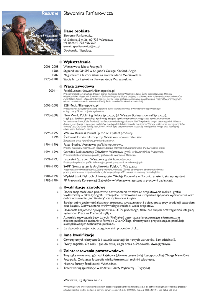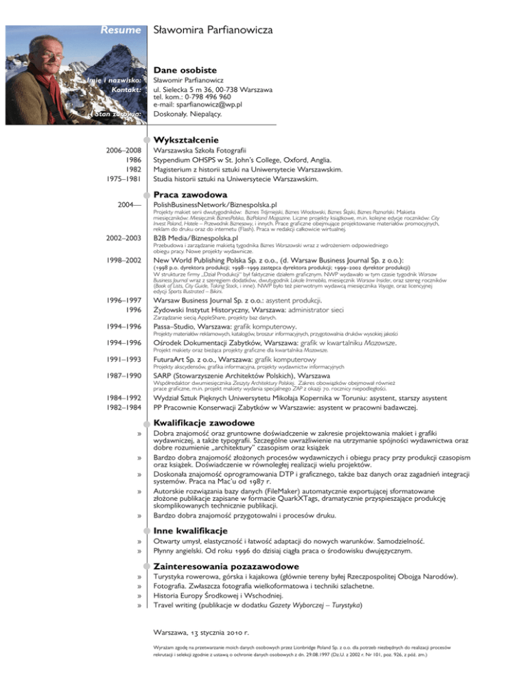 Resume Sławomira Parfianowicza Dane osobiste Imię i nazwisko: Kontakt: Stan zdrowia: Sławomir Parfianowicz ul. Sielecka 5 m 36, 00-738 Warszawa tel. kom.: 0-798 496 960 e-mail: [email protected] Doskonały. Niepalący. Wykształcenie 2006–2008 1986 1982 1975–1981 Warszawska Szkoła Fotografii Stypendium OHSPS w St. John’s College, Oxford, Anglia. Magisterium z historii sztuki na Uniwersytecie Warszawskim. Studia historii sztuki na Uniwersytecie Warszawskim. Praca zawodowa 2004— PolishBusinessNetwork/Biznespolska.pl Projekty makiet serii dwutygodników: Biznes Trójmiejski, Biznes Wrocławski, Biznes Śląski, Biznes Poznański. Makieta miesięczników: Miesięcznik BiznesPolska, BizPoland Magazine. Liczne projekty książkowe, m.in. kolejne edycje roczników: City Invest Poland, Hotele – Przewodnik Biznesowy, i innych. Prace graficzne obejmujące projektowanie materiałów promocyjnych, reklam do druku oraz do internetu (Flash). Praca w redakcji całkowicie wirtualnej. 2002–2003 B2B Media/Biznespolska.pl Przebudowa i zarządzanie makietą tygodnika Biznes Warszawski wraz z wdrożeniem odpowiedniego obiegu pracy. Nowe projekty wydawnicze. 1998–2002 New World Publishing Polska Sp. z o.o., (d. Warsaw Business Journal Sp. z o.o.): (1998 p.o. dyrektora produkcji; 1998–1999 zastępca dyrektora produkcji; 1999–2002 dyrektor produkcji) W strukturze firmy „Dział Produkcji“ był faktycznie działem graficznym. NWP wydawało w tym czasie tygodnik Warsaw Business Journal wraz z szeregiem dodatków, dwutygodnik Lokale Immobila, miesięcznik Warsaw Insider, oraz szereg roczników (Book of Lists, City Guide, Taking Stock, i inne). NWP było też pierwotnym wydawcą miesięcznika Voyage, oraz licencyjnej edycji Sports Illustrated – Bikini. 1996–1997 1996 Warsaw Business Journal Sp. z o.o.: asystent produkcji. Żydowski Instytut Historyczny, Warszawa: administrator sieci Zarządzanie siecią AppleShare, projekty baz danych. 1994–1996 Passa–Studio, Warszawa: grafik komputerowy. Projekty materiałów reklamowych, katalogów, broszur informacyjnych, przygotowalnia druków wysokiej jakości 1994–1996 Ośrodek Dokumentacji Zabytków, Warszawa: grafik w kwartalniku Mazowsze. Projekt makiety oraz bieżąca projekty graficzne dla kwartalnika Mazowsze. 1991–1993 FuturaArt Sp. z o.o., Warszawa: grafik komputerowy Projekty akscydensów, grafika informacyjna, projekty wydawnictw informacyjnych 1987–1990 SARP (Stowarzyszenie Architektów Polskich), Warszawa Współredaktor dwumiesięcznika Zeszyty Architektury Polskiej. Zakres obowiązków obejmował również prace graficzne, m.in. projekt makiety wydania specjalnego ZAP z okazji 70. rocznicy niepodległości. 1984–1992 1982–1984 Wydział Sztuk Pięknych Uniwersytetu Mikołaja Kopernika w Toruniu: asystent, starszy asystent PP Pracownie Konserwacji Zabytków w Warszawie: asystent w pracowni badawczej. Kwalifikacje zawodowe » » » » » Dobra znajomość oraz gruntowne doświadczenie w zakresie projektowania makiet i grafiki wydawniczej, a także typografii. Szczególne uwrażliwienie na utrzymanie spójności wydawnictwa oraz dobre rozumienie „architektury” czasopism oraz książek Bardzo dobra znajomość złożonych procesów wydawniczych i obiegu pracy przy produkcji czasopism oraz książek. Doświadczenie w równoległej realizacji wielu projektów. Doskonała znajomość oprogramowania DTP i graficznego, także baz danych oraz zagadnień integracji systemów. Praca na Mac’u od 1987 r. Autorskie rozwiązania bazy danych (FileMaker) automatycznie exportującej sformatowane złożone publikacje zapisane w formacie QuarkXTags, dramatycznie przyspieszające produkcję skomplikowanych technicznie publikacji. Bardzo dobra znajomość przygotowalni i procesów druku. Inne kwalifikacje » » Otwarty umysł, elastyczność i łatwość adaptacji do nowych warunków. Samodzielność. Płynny angielski. Od roku 1996 do dzisiaj ciągła praca o środowisku dwujęzycznym. Zainteresowania pozazawodowe » » » » Turystyka rowerowa, górska i kajakowa (głównie tereny byłej Rzeczpospolitej Obojga Narodów). Fotografia. Zwłaszcza fotografia wielkoformatowa i techniki szlachetne. Historia Europy Środkowej i Wschodniej. Travel writing (publikacje w dodatku Gazety Wyborczej – Turystyka) Warszawa, 13 stycznia 2010 r. Wyrażam zgodę na przetwarzanie moich danych osobowych przez Lionbridge Poland Sp. z o.o. dla potrzeb niezbędnych do realizacji procesów rekrutacji i selekcji zgodnie z ustawą o ochronie danych osobowych z dn. 29.08.1997 (Dz.U. z 2002 r. Nr 101, poz. 926, z póź. zm.)
