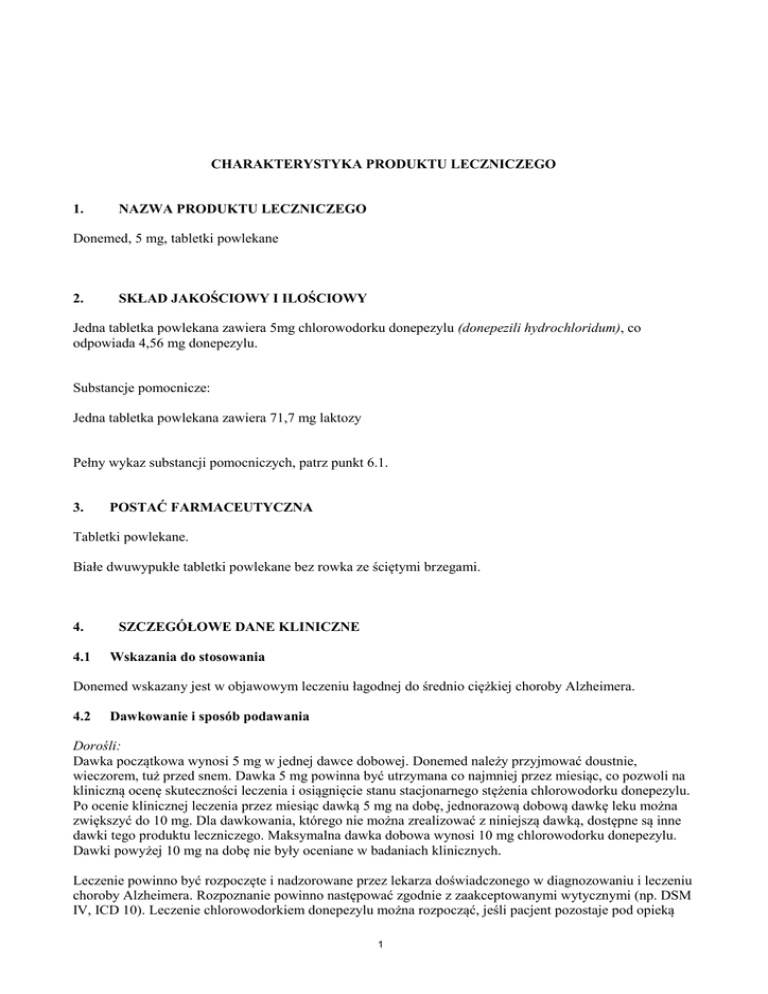 CHARAKTERYSTYKA PRODUKTU LECZNICZEGO 1. NAZWA PRODUKTU LECZNICZEGO Donemed, 5 mg, tabletki powlekane 2. SKŁAD JAKOŚCIOWY I ILOŚCIOWY Jedna tabletka powlekana zawiera 5mg chlorowodorku donepezylu (donepezili hydrochloridum), co odpowiada 4,56 mg donepezylu. Substancje pomocnicze: Jedna tabletka powlekana zawiera 71,7 mg laktozy Pełny wykaz substancji pomocniczych, patrz punkt 6.1. 3. POSTAĆ FARMACEUTYCZNA Tabletki powlekane. Białe dwuwypukłe tabletki powlekane bez rowka ze ściętymi brzegami. 4. 4.1 SZCZEGÓŁOWE DANE KLINICZNE Wskazania do stosowania Donemed wskazany jest w objawowym leczeniu łagodnej do średnio ciężkiej choroby Alzheimera. 4.2 Dawkowanie i sposób podawania Dorośli: Dawka początkowa wynosi 5 mg w jednej dawce dobowej. Donemed należy przyjmować doustnie, wieczorem, tuż przed snem. Dawka 5 mg powinna być utrzymana co najmniej przez miesiąc, co pozwoli na kliniczną ocenę skuteczności leczenia i osiągnięcie stanu stacjonarnego stężenia chlorowodorku donepezylu. Po ocenie klinicznej leczenia przez miesiąc dawką 5 mg na dobę, jednorazową dobową dawkę leku można zwiększyć do 10 mg. Dla dawkowania, którego nie można zrealizować z niniejszą dawką, dostępne są inne dawki tego produktu leczniczego. Maksymalna dawka dobowa wynosi 10 mg chlorowodorku donepezylu. Dawki powyżej 10 mg na dobę nie były oceniane w badaniach klinicznych. Leczenie powinno być rozpoczęte i nadzorowane przez lekarza doświadczonego w diagnozowaniu i leczeniu choroby Alzheimera. Rozpoznanie powinno następować zgodnie z zaakceptowanymi wytycznymi (np. DSM IV, ICD 10). Leczenie chlorowodorkiem donepezylu można rozpocząć, jeśli pacjent pozostaje pod opieką 1 osoby, która będzie regularnie sprawdzać przyjmowanie leku przez pacjenta. Leczenie podtrzymujące można kontynuować, dopóki przynosi terapeutyczne korzyści dla pacjenta. Dlatego należy regularnie oceniać kliniczne korzyści ze stosowania chlorowodorku donepezylu. Kiedy nie ma efektów terapeutycznych, należy rozważyć przerwanie leczenia. Nie można przewidzieć indywidualnej odpowiedzi na leczenie. Po przerwaniu leczenia obserwowano stopniowe zmniejszenie korzystnych skutków leczenia chlorowodorkiem donepezylu. Niewydolność nerek i wątroby: Ponieważ niewydolność nerek nie wpływa na klirens chlorowodorku donepezylu, u pacjentów z niewydolnością nerek można stosować podobny schemat dawkowania, jak u wszystkich pacjentów. Z uwagi na możliwą zwiększoną ekspozycję u pacjentów z łagodną do umiarkowanej niewydolnością wątroby (patrz punkt 5.2), zwiększanie dawki powinno następować zgodnie z indywidualną tolerancją. Brak danych dla pacjentów z ciężką niewydolnością wątroby. Dzieci i młodzież: Chlorowodorek donepezylu nie jest zalecany do stosowania u dzieci i młodzieży. 4.3 Przeciwwskazania Donemed jest przeciwwskazany u pacjentów z nadwrażliwością na chlorowodorek donepezylu, pochodne piperydyny lub którąkolwiek z substancji pomocniczych. 4.4 Specjalne ostrzeżenia i środki ostrożności dotyczące stosowania Stosowanie chlorowodorku donepezylu u pacjentów z ciężką chorobą Alzheimera, innymi rodzajami demencji lub innymi rodzajami zaburzeń pamięci (np. pogorszenie funkcji poznawczych związane z wiekiem) nie było badane. Znieczulenie: Chlorowodorek donepezylu, jako inhibitor cholinesterazy, może nasilać zwiotczenie mięśni wywołane przez pochodne sukcynylocholiny podczas znieczulenia. Zaburzenia sercowo-naczyniowe: Z uwagi na swe działanie farmakologiczne, inhibitory cholinesterazy mogą wywierać wagotoniczny wpływ na częstość akcji serca (np. bradykardia). Powyższe działanie może być szczególnie ważne u pacjentów z zespołem chorego węzła zatokowego lub zaburzeniami przewodnictwa nadkomorowego, jak blok zatokowoprzedsionkowy lub przedsionkowo-komorowy. Istnieją doniesienia o omdleniach i drgawkach. Podczas badania pacjentów należy brać pod uwagę możliwość bloku serca lub zahamowania zatokowego. Zaburzenia żołądkowo-jelitowe: Pacjenci o zwiększonym ryzyku rozwoju wrzodów, np. z chorobą wrzodową w wywiadzie lub przyjmujący jednocześnie niesteroidowe leki przeciwzapalne (NLPZ), powinni być monitorowani pod kątem objawów. Jednak badania kliniczne z chlorowodorkiem donepezylu nie wykazały zwiększenia, w porównaniu z placebo, częstości zapadania na chorobę wrzodową przewodu pokarmowego ani krwawień z przewodu pokarmowego. Zaburzenia układu moczowo-płciowego: Chociaż w badaniach klinicznych tego nie stwierdzono, cholinomimetyki mogą powodować niedrożność ujścia pęcherza moczowego. Zaburzenia neurologiczne: Napady drgawkowe: cholinomimetyki uważane są za możliwą przyczynę drgawek uogólnionych. Jednak występowanie drgawek może być również objawem choroby Alzheimera. Cholinomimetyki mogą nasilać lub wywoływać objawy pozapiramidowe. 2 Zaburzenia płuc: Z uwagi na działanie cholinomimetyczne, inhibitory cholinesterazy powinny być przepisywane z ostrożnością pacjentom ze stwierdzoną w wywiadzie astmą lub obturacyjną chorobą płuc. Należy unikać jednoczesnego podawania chlorowodorku donepezylu z innymi inhibitorami acetylocholinesterazy, agonistami lub antagonistami układu cholinergicznego. Ciężka niewydolność wątroby: Nie ma danych dotyczących pacjentów z ciężką niewydolnością wątroby. Laktoza: Ten produkt medyczny zawiera laktozę. Pacjenci z rzadką dziedziczną nietolerancją galaktozy, z niedoborem Lapp laktozy lub zaburzeniami wchłaniania glukozy-galaktozy, nie powinni przyjmować tego produktu leczniczego. Badania kliniczne umieralności w otępieniu naczyniowym: Przeprowadzono trzy badania kliniczne trwające po 6 miesięcy, badające przypadki kryteriów NINDSAIREN pod kątem prawdopodobnej lub możliwej demencji naczyniowej (VaD). Kryteria NINDS-AIREN zostały ustalone w celu zidentyfikowania pacjentów, u których demencja spowodowana jest jedynie pr