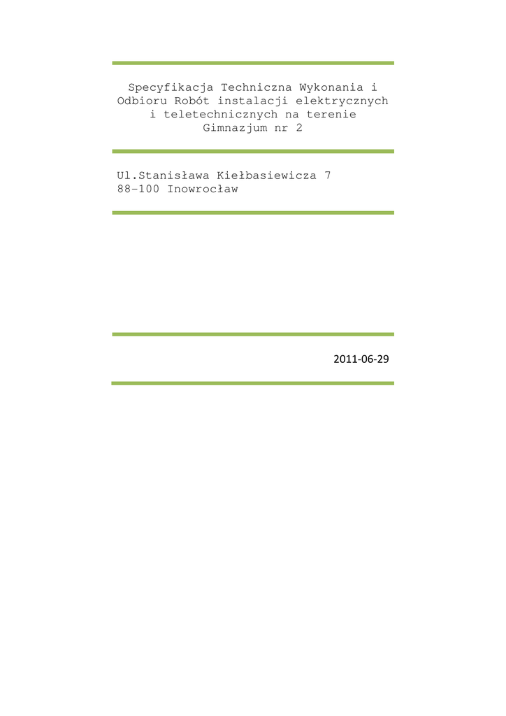 Specyfikacja Techniczna Wykonania i Odbioru Robót instalacji elektrycznych i teletechnicznych na terenie Gimnazjum nr 2 Ul.Stanisława Kiełbasiewicza 7 88-100 Inowrocław 2011-06-29 Specyfikacja Techniczna Wykonania i Odbioru Robót instalacji elektrycznych i teletechnicznych na terenie Gimnazjum nr 2 1. POSTANOWIENIA OGÓLNE ..................................................................................................... 3 1.1. PRZEDMIOT ST ................................................................................................................ 3 1.2. ZAKRES STOSOWANIA ST ............................................................................................. 3 1.3. ZAKRES ROBÓT ST ......................................................................................................... 3 1.4. PODZIAŁ ROBÓT WG CPV ............................................................................................. 4 OKREŚLENIA PODSTAWOWE .......................................................................................................... 4 2. 3. OGÓLNE WYMAGANIA ............................................................................................................. 10 3.1. ODPOWIEDZIALNOŚĆ WYKONAWCY ................................................................................. 10 3.2. PRZEKAZANIE PLACU BUDOWY...................................................................................... 11 3.3. ZABEZPIECZENIE INTERESU OSÓB TRZECICH ...................................................... 11 3.4. OCHRONA ŚRODOWISKA .................................................................................................... 11 3.5. OCHRONA PRZECIWPOŻAROWA ........................................................................................ 12 3.6. OPIEKA NAD ROBOTAMI ................................................................................................. 12 3.7. PRZESTRZEGANIE PRAWA ............................................................................................... 12 4. WYMAGANE WŁAŚCIWOŚCI MATERIAŁÓW ......................................................................... 12 4.1. OGÓLNE WYMAGANIA DOTYCZĄCE MATERIAŁÓW .................................................. 12 4.2. SKŁADOWANIE MATERIAŁÓW ...................................................................................... 13 5. SPRZĘT..................................................................................................................................... 13 6. TRANSPORT ............................................................................................................................. 14 7. WYKONANIE ROBÓT ............................................................................................................... 14 7.1. OKABLOWANIE..................................................................................................................... 14 7.2. MONTAŻ ELEMENTÓW INSTALACJI I URUCHOMIENIA .......................................... 15 7.2.1. GNIAZDA KOMPUTEROWE...................................................................................... 15 7.2.2. PATCH PANEL ......................................................................................................... 16 7.3. DOKUMENATACJA ................................................................................................................ 17 7.4. GWARANCJA ......................................................................................................................... 17 8. ZAKRES RZECZOWY ............................................................................................................... 17 9. KONTROLA JAKOŚCI I OBMIAR ROBÓT ......................................................................... 18 10. ODBIÓR ROBÓT ...................................................................................................................... 18 11. PRACE PORZĄDKOWE ............................................................................................................. 18 12. NORMY I PRZEPISY ............................................................................................................. 19 2|Strona Specyfikacja Techniczna Wykonania i Odbioru Robót instalacji elektrycznych i teletechnicznych na terenie Gimnazjum nr 2 1. POSTANOWIENIA OGÓLNE 1.1. PRZEDMIOT ST Przedmiotem niniejszej specyfikacji technicznej są wymagania wykonania i odbioru instalacji elektrycznej i teletechnicznej • • • • instalacja okablowania komputerowego (okablowanie strukturalne), urządzenia obsługi sieci komputerowej (urządzenia aktywne), instalacja okablowania i montaż wraz z uruchomieniem systemu SSWiN, instalacja zasilania i oświetlenia, przebudowa pomieszczeń Gimnazjum nr 2. 1.2. ZAKRES STOSOWANIA ST Specyfikacja techniczna jest stosowana jako dokument przetargowy i kontraktowy przy zleceniu realizacji robót objetych w punkcie 1.1 i jest dokumentem nadrzędnym w stosunku do projektu technicznego. 1.3. ZAKRES ROBÓT ST Ustalenia zawarte w niniejszej specyfikacji dotyczą prowadzenia robót i obejmują: • • • instalacje elektryczne zasilania elementów instalacji, instalacje sieci komputerowej, instalacje systemu SSWiN, 3|Strona Specyfikacja Techniczna Wykonania i Odbioru Robót instalacji elektrycznych i teletechnicznych na terenie Gimnazjum nr 2 1.4. PODZIAŁ ROBÓT WG CPV Podział robót objętych zamówieniem według Kodu Wspólnego Słownika Zamówień (CPV): Dział: 45000000-7, Roboty budowlane Grupa: 453 - Roboty instalacyjne Kategorie robót: 45312200-9 Instalowanie alarmów włamaniowych 45314200-3 Instalowanie infrastruktury kablowej 45311100-1 Roboty w zakresie instalacji elektrycznej 2. OKREŚLENIA PODSTAWOWE Podstawowe określenia dotyczące przedmiotu zamówienia zostały zawarte w przytoczonych w niniejszym dokumencie aktów normatywnych. Określenia podstawowe definiujące pojęcia użyte w specyfikacji technicznej: S