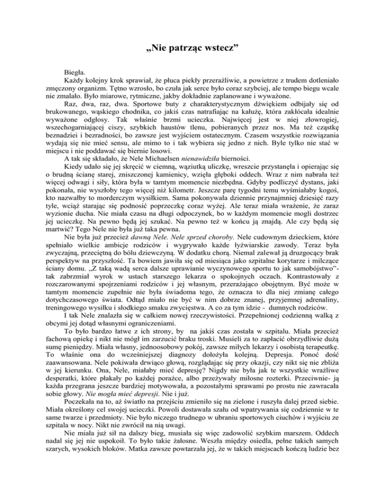 „Nie patrząc wstecz” Biegła. Każdy kolejny krok sprawiał, że płuca piekły przeraźliwie, a powietrze z trudem dotleniało zmęczony organizm. Tętno wzrosło, bo czuła jak serce było coraz szybciej, ale tempo biegu wcale nie zmalało. Było miarowe, rytmiczne, jakby dokładnie zaplanowane i wyważone. Raz, dwa, raz, dwa. Sportowe buty z charakterystycznym dźwiękiem odbijały się od brukowanego, wąskiego chodnika, co jakiś czas natrafiając na kałużę, która zakłócała idealnie wyważone odgłosy. Tak właśnie brzmi ucieczka. Najwięcej jest w niej złowrogiej, wszechogarniającej ciszy, szybkich haustów tlenu, pobieranych przez nos. Ma też cząstkę beznadziei i bezradności, bo zawsze jest wyjściem ostatecznym. Czasem wszystkie rozwiązania wydają się nie mieć sensu, ale mimo to i tak wybiera się jedno z nich. Byle tylko nie stać w miejscu i nie poddawać się biernie losowi. A tak się składało, że Nele Michaelsen nienawidziła bierności. Kiedy udało się jej skręcić w ciemną, wąziutką uliczkę, wreszcie przystanęła i opierając się o brudną ścianę starej, zniszczonej kamienicy, wzięła głęboki oddech. Wraz z nim nabrała też więcej odwagi i siły, która była w tamtym momencie niezbędna. Gdyby podliczyć dystans, jaki pokonała, nie wyszłoby tego więcej niż kilometr. Jeszcze parę tygodni temu wyśmiałaby kogoś, kto nazwałby to morderczym wysiłkiem. Sama pokonywała dziennie przynajmniej dziesięć razy tyle, wciąż starając się podnosić poprzeczkę coraz wyżej. Ale teraz miała wrażenie, że zaraz wyzionie ducha. Nie miała czasu na długi odpoczynek, bo w każdym momencie mogli dostrzec jej ucieczkę. Na pewno będą jej szukać. Na pewno też w końcu ją znajdą. Ale czy będą się martwić? Tego Nele nie była już taka pewna. Nie była już przecież dawną Nele. Nele sprzed choroby. Nele cudownym dzieckiem, które spełniało wielkie ambicje rodziców i wygrywało każde łyżwiarskie zawody. Teraz była zwyczajną, przeciętną do bólu dziewczyną. W dodatku chorą. Niemal zalewał ją druzgocący brak perspektyw na przyszłość. Ta bowiem jawiła się od miesiąca jako szpitalne korytarze i milczące ściany domu. „Z taką wadą serca dalsze uprawianie wyczynowego sportu to jak samobójstwo”tak zabrzmiał wyrok w ustach starszego lekarza o spokojnych oczach. Kontrastowały z rozczarowanymi spojrzeniami rodziców i jej własnym, przerażająco obojętnym. Być może w tamtym momencie zupełnie nie była świadoma tego, że oznacza to dla niej zmianę całego dotychczasowego świata. Odtąd miało nie być w nim dobrze znanej, przyjemnej adrenaliny, treningowego wysiłku i słodkiego smaku zwycięstwa. A co za tym idzie - dumnych rodziców. I tak Nele znalazła się w całkiem nowej rzeczywistości. Przepełnionej codzienną walką z obcymi jej dotąd własnymi ograniczeniami. To było bardzo łatwe z ich strony, by na jakiś czas została w szpitalu. Miała przecież fachową opiekę i nikt nie mógł im zarzucić braku troski. Musieli za to zapłacić obrzydliwie dużą sumę pieniędzy. Miała własny, jednoosobowy pokój, zawsze miłych lekarzy i osobistą terapeutkę. To właśnie ona do wcześniejszej diagnozy dołożyła kolejną. Depresja. Ponoć dość zaawansowana. Nele pokiwała drwiąco głową, rozglądając się przy okazji, czy nikt się nie zbliża w jej kierunku. Ona, Nele, miałaby mieć depresję? Nigdy nie była jak te wszystkie wrażliwe desperatki, które płakały po każdej porażce, albo przeżywały miłosne rozterki. Przeciwnie- ją każda przegrana jeszcze bardziej motywowała, a pozostałymi sprawami po prostu nie zawracała sobie głowy. Nie mogła mieć depresji. Nie i już. Poczekała na to, aż światło na przejściu zmieniło się na zielone i ruszyła dalej przed siebie. Miała określony cel swojej ucieczki. Powoli dostawała szału od wpatrywania się codziennie w te same twarze i przedmioty. Nie było niczego trudnego w ubraniu sportowych ciuchów i wyjściu ze szpitala w nocy. Nikt nie zwrócił na nią uwagi. Nie miała już sił na dalszy bieg, musiała się więc zadowolić szybkim marszem. Oddech nadal się jej nie uspokoił. To było takie żałosne. Weszła między osiedla, pełne takich samych szarych, wysokich bloków. Matka zawsze powtarzała jej, że w takich miejscach kończą ludzie bez ambicji. Ludzie tacy jak ona i ojciec mieszkali w szanowanej dzielnicy, w dużym domu z ogrodem i koniecznie wysokim płotem. Nele od dziecka marzyła, żeby w tym ogrodzie postawili dla niej huśtawkę. Każdą taką prośbę ojciec nazywał głupotą. Z huśtawki mogła spaść- mówił i wciąż powtarzał, że nie może w ten sposób ryzykować kontuzji. Przecież odkąd tylko pamiętała najważniejsze były łyżwy. Godziny spędzane na lodowisku, ćwiczenia, dieta i podporządkowanie się. Nie znała innego życia i być może dlatego za nim nigdy nie tęskniła. Przyzwyczaiła się do tego, że zaraz po lekcjach musiała biec na trening, że nigdy nie odwiedzała koleżanek. Poświęciła łyżwom właściwie wszystko, a teraz została z niczym. Do Nele powoli docierało, że znienawidziła łyżwy jeszcze przed wyrokiem. Ale nie odważyłaby się sama ich zostawić. Po prostu nie wiedziała, jak miałoby wyglądać inne życie. W pewnym momencie huśtawka stała się dla niej czymś równie niedostępnym jak beztroska i wolność. Nigdy nie odważyła się złamać zakazu i samej wybrać się na plac zabaw. Nigdy, aż do teraz. Teraz nie miała przecież nic do stracenia. Czasem świadomość własnego położenia potrafi zmienić sposób postrzegania świata. Nagle dotychczasowe priorytety ulegają odwróceniu i wiesz, że wreszcie to ty możesz zadecydować. W ustach czuła nieprzyjemny, metaliczny posmak. Nogi miała jak z waty, ale wreszcie dotarła na miejsce. Mały, dość obskurny plac zabaw w słabym świetle poranka nie zachęcał do dłuższego przebyw