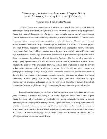 Charakterystyka twórczości klarnetowej Eugène Bozzy na tle francuskiej literatury klarnetowej XX wieku Promotor: prof. dr hab. Bogdan Ocieszak „Eugène Bozza jest kompozytorem wykonawców – granie jego muzyki, tak świetnie napisanej na każdy instrument, to wyzwanie, a samo ćwiczenie jej sprawia dużą przyjemność. Bozza jest również kompozytorem słuchaczy – jego muzyka zawsze potrafi zainteresować i nawet niedoświadczony odbiorca odnajdzie się w jej melodyce i tonalności.” Ta wypowiedź Normana Heima – amerykańskiego specjalisty w zakresie literatury klarnetowej doskonale oddaje charakter twórczości tego francuskiego kompozytora XX wieku. To właśnie piękno linii melodycznej, bogactwo środków harmonicznych oraz szczególne walory techniczne i wyrazowe dzieł Bozzy skłoniły Autora pracy do tego, aby zgłębić twórczość klarnetową tego kompozytora. W toku jego poszukiwań okazało się, że powszechnie wykonywane dzieła Bozzy na klarnet z fortepianem, takie jak Fantaisie Italienne, Claribel czy Aria są zaledwie małą cząstką jego twórczości na ten instrument. Eugène Bozza jest bowiem autorem ponad czterdziestu dzieł z wykorzystaniem klarnetu, jednak duża większość z nich to utwory wykonywane bardzo rzadko, a niektóre – wcale. Zaliczają się do nich: kompozycje pedagogiczne (różnego rodzaju etiudy), dzieła kameralne, zarówno na zespoły instrumentów dętych, jak i na klarnet z fortepianem, a nade wszystko Concerto na klarnet i orkiestrę kameralną. Celem pracy doktorskiej Autora było pokazanie różnorodności tych wartościowych utworów, pokazanie ich na tle twórczości klarnetowej innych francuskich kompozytorów oraz przybliżenie muzyki klarnetowej Bozzy szerszemu gronu odbiorców. Pracę doktorską rozpoczyna rozdział, w którym naszkicowano przemiany stylistyczne, jakie zachodziły w muzyce francuskiej w XX wieku. Żyjący w latach 1905 – 1991 Eugène Bozza był więc ich świadkiem. W rozdziale tym krótko scharakteryzowano twórczość najważniejszych kompozytorów tamtego okresu, z podkreśleniem, jakie nurty reprezentowali, a także opisem ich twórczości klarnetowej. Duży nacisk w tym rozdziale został przez Autora położony na przybliżenie sylwetek dwóch największych reformatorów w muzyce francuskiej XX wieku – Claude Debussy’ego oraz Oliviera Messiaena. Rozdział ten stanowi tło dla późniejszego omówienia twórczości Bozzy. Drugi rozdział pracy w całości poświęcony jest sylwetce Eugène Bozzy. W pierwszej jego części zamieszczono biografię kompozytora. Uwzględniono w niej również ważniejsze jego dzieła. W drugiej części rozdziału Autor opisał cechy twórczości Bozzy, które zilustrował kilkoma przykładami nutowymi. Rozdział trzeci to opis dzieł pedagogicznych Bozzy, czyli różnego rodzaju etiud. W jego części wstępnej Autor zamieścił krótką historię klarnetu oraz charakterystykę utworów pedagogicznych napisanych przez klarnecistów – twórców francuskiej szkoły klarnetowej: Hyacinthe Klosé, Chrysogone Cyrille Rose, Paula Jeanjeana, Auguste Periera, Ulysse Delécluse oraz Jaquesa Lancelota. Część wstępna tego rozdziału pokazuje, jak wielki wpływ ma literatura dydaktyczna na rozwój techniki instrumentalnej oraz stanowi tło dla utworów pedagogicznych Eugène Bozzy. W rozdziale opisano cztery napisane przez Bozzę zeszyty etiud na klarnet: 14 Études de mécanisme, Douze études, Onze études sur des modes karnatiques oraz Graphismes, z uwzględnieniem ich różnorodnej problematyki. W czwartym rozdziale pracy doktorskiej Autor zawarł opis dzieł kameralnych Bozzy na różne składy instrumentów dętych. Kompozytor napisał niemal dwadzieścia tego typu dzieł, więc ze względu na ich ilość Autor scharakteryzował w pracy tylko pięć z nich, jego zdaniem, najbardziej znaczących. W pierwszej kolejności opisane zostały dwa duety: Contrastes III na klarnet i fagot oraz Trois mouvements na flet i klarnet. Z triów na różne instrumenty Autor wybrał Suite brève en trio na obój, klarnet i fagot, z kwartetów: Sonatine pour quatre clarinettes inégales na kwartet klarnetowy, zaś za przykład utworu na kwintet posłużył chyba najbardziej znany utwór Bozzy na zespoły instrumentów dętych – Scherzo op. 48 na klasyczny kwintet dęty. Rozdział piąty pracy poświęcony jest utworom kameralnym na klarnet i fortepian. Zawiera opisy, zilustrowane licznymi przykładami nutowymi, dwunastu tego typu kompozycji, do których należą: Aria, Fantaisie Italienne, Ballade, Bucolique, Claribel, Idylle, Prélude et Divertissement, Caprice-Improvisation, Pulcinella, Épithalame, Suite oraz Rapsodie Niçoise. W drugiej części rozdziału Autor przybliżył również problematykę wykonawczą tych utworów. Ostatni rozdział w całości dotyczy Concerto na klarnet i orkiestrę kameralną. Składa się z dwóch podrozdziałów. W pierwszym z nich Autor zanalizował i opisał ten utwór posługując się wyciągiem fortepianowym, w dalszej jego części przedstawił również występujące w nim problemy wykonawcze. W podrozdziale drugim natomiast, Autor opisał partyturę orkiestrową tego utworu i przedstawił różnice występujące między nią, a wyciągiem fortepianowym. Rozdział ten zilustrowany jest również wieloma przykładami nutowymi. Po zakończeniu pracy Autor zamieścił spis wykorzystanych w niej przykładów nutowych, tabelę zaproponowanych przez niego chwytów, ułatwiających wykonanie wielu fragmentów w utworach Bozzy oraz bibliografię. Praca doktorska pokazuje jak bardzo różnorodne są utwory klarnetowe Eugène Bozzy – od różnorodnych etiud, przez utwory kameralne, zarówno na zespoły instrumentów dętych, jak i na klarnet z fortepianem, aż po Concerto. Są to utwory mające wiele walorów technicznych, wyrazowych, rozwijają biegłość palcową i muzykalność klarnecisty. Praca przybliża również ich problematykę wykon