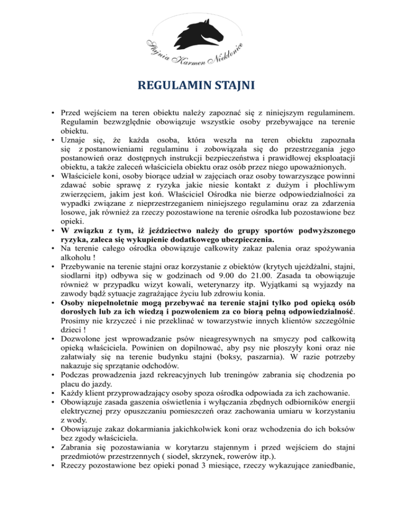 REGULAMIN STAJNI • Przed wejściem na teren obiektu należy zapoznać się z niniejszym regulaminem. Regulamin bezwzględnie obowiązuje wszystkie osoby przebywające na terenie obiektu. • Uznaje się, że każda osoba, która weszła na teren obiektu zapoznała się z postanowieniami regulaminu i zobowiązała się do przestrzegania jego postanowień oraz dostępnych instrukcji bezpieczeństwa i prawidłowej eksploatacji obiektu, a także zaleceń właściciela obiektu oraz osób przez niego upoważnionych. • Właściciele koni, osoby biorące udział w zajęciach oraz osoby towarzyszące powinni zdawać sobie sprawę z ryzyka jakie niesie kontakt z dużym i płochliwym zwierzęciem, jakim jest koń. Właściciel Ośrodka nie bierze odpowiedzialności za wypadki związane z nieprzestrzeganiem niniejszego regulaminu oraz za zdarzenia losowe, jak również za rzeczy pozostawione na terenie ośrodka lub pozostawione bez opieki. • W związku z tym, iż jeździectwo należy do grupy sportów podwyższonego ryzyka, zaleca się wykupienie dodatkowego ubezpieczenia. • Na terenie całego ośrodka obowiązuje całkowity zakaz palenia oraz spożywania alkoholu ! • Przebywanie na terenie stajni oraz korzystanie z obiektów (krytych ujeżdżalni, stajni, siodlarni itp) odbywa się w godzinach od 9.00 do 21.00. Zasada ta obowiązuje również w przypadku wizyt kowali, weterynarzy itp. Wyjątkami są wyjazdy na zawody bądź sytuacje zagrażające życiu lub zdrowiu konia. • Osoby niepełnoletnie mogą przebywać na terenie stajni tylko pod opieką osób dorosłych lub za ich wiedzą i pozwoleniem za co biorą pełną odpowiedzialność. Prosimy nie krzyczeć i nie przeklinać w towarzystwie innych klientów szczególnie dzieci ! • Dozwolone jest wprowadzanie psów nieagresywnych na smyczy pod całkowitą opieką właściciela. Powinien on dopilnować, aby psy nie płoszyły koni oraz nie załatwiały się na terenie budynku stajni (boksy, paszarnia). W razie potrzeby nakazuje się sprzątanie odchodów. • Podczas prowadzenia jazd rekreacyjnych lub treningów zabrania się chodzenia po placu do jazdy. • Każdy klient przyprowadzający osoby spoza ośrodka odpowiada za ich zachowanie. • Obowiązuje zasada gaszenia oświetlenia i wyłączania zbędnych odbiorników energii elektrycznej przy opuszczaniu pomieszczeń oraz zachowania umiaru w korzystaniu z wody. • Obowiązuje zakaz dokarmiania jakichkolwiek koni oraz wchodzenia do ich boksów bez zgody właściciela. • Zabrania się pozostawiania w korytarzu stajennym i przed wejściem do stajni przedmiotów przestrzennych ( siodeł, skrzynek, rowerów itp.). • Rzeczy pozostawione bez opieki ponad 3 miesiące, rzeczy wykazujące zaniedbanie, porzucenie lub zniszczenie oraz rzeczy brudne (w tym także obuwie) pozostawiane w miejscu wspólnego użytkowania, będą wyrzucane lub przekazywane innym. • Obowiązuje zasada czystości i porządku w szatniach i siodlarniach oraz dookoła wszystkich obiektów. • Wszelkie usterki urządzeń stajennych należy bezzwłocznie zgłaszać obsłudze stajni. W sprawach nieuregulowanych niniejszym regulaminem obowiązuje zasada uwzględniająca dobro koni, wzajemnej życzliwości i pomocy. Osoby rażąco naruszające niniejszy regulamin oraz stwarzające zagrożenie dla siebie i innych mogą zostać poproszone o opuszczenie terenu ośrodka.