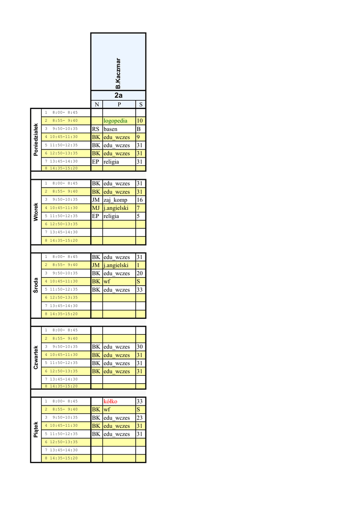 B.Kaczmar 2a Poniedziałek N 1 8:00- 8:45 2 8:55- 9:40 3 9:50-10:35 4 10:45-11:30 5 11:50-12:35 6 12:50-13:35 7 13:45-14:30 P S RS BK BK BK EP logopedia basen edu_wczes edu_wczes edu_wczes religia 10 B 9 31 31 31 BK BK JM MJ EP edu_wczes edu_wczes zaj_komp j.angielski religia 31 31 16 7 5 BK JM BK BK BK edu_wczes j.angielski edu_wczes wf edu_wczes 31 1 20 S 33 BK BK BK BK edu_wczes edu_wczes edu_wczes edu_wczes 30 31 31 31 BK BK BK BK kółko wf edu_wczes edu_wczes edu_wczes 33 S 23 31 31 Wtorek 8 14:35-15:20 1 8:00- 8:45 2 8:55- 9:40 3 9:50-10:35 4 10:45-11:30 5 11:50-12:35 6 12:50-13:35 7 13:45-14:30 Środa 8 14:35-15:20 1 8:00- 8:45 2 8:55- 9:40 3 9:50-10:35 4 10:45-11:30 5 11:50-12:35 6 12:50-13:35 7 13:45-14:30 Czwartek 8 14:35-15:20 1 8:00- 8:45 2 8:55- 9:40 3 9:50-10:35 4 10:45-11:30 5 11:50-12:35 6 12:50-13:35 7 13:45-14:30 Piątek 8 14:35-15:20 1 8:00- 8:45 2 8:55- 9:40 3 9:50-10:35 4 10:45-11:30 5 11:50-12:35 6 12:50-13:35 7 13:45-14:30 8 14:35-15:20