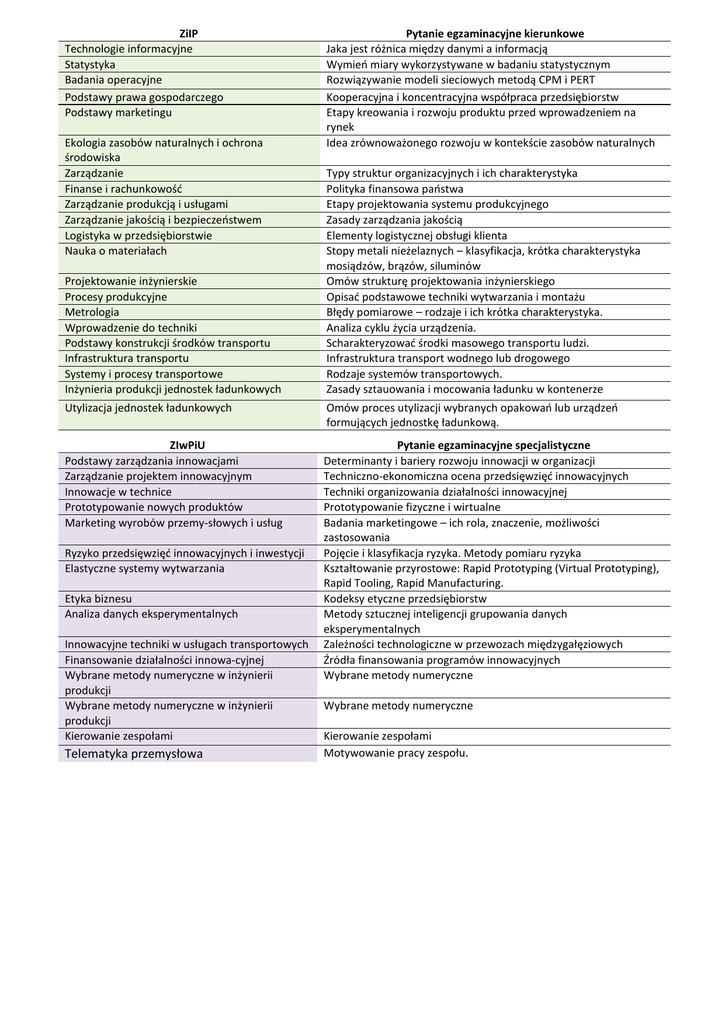 ZiIP Technologie informacyjne Statystyka Badania operacyjne Podstawy prawa gospodarczego Podstawy marketingu Ekologia zasobów naturalnych i ochrona środowiska Zarządzanie Finanse i rachunkowość Zarządzanie produkcją i usługami Zarządzanie jakością i bezpieczeństwem Logistyka w przedsiębiorstwie Nauka o materiałach Projektowanie inżynierskie Procesy produkcyjne Metrologia Wprowadzenie do techniki Podstawy konstrukcji środków transportu Infrastruktura transportu Systemy i procesy transportowe Inżynieria produkcji jednostek ładunkowych Pytanie egzaminacyjne kierunkowe Jaka jest różnica między danymi a informacją Wymień miary wykorzystywane w badaniu statystycznym Rozwiązywanie modeli sieciowych metodą CPM i PERT Kooperacyjna i koncentracyjna współpraca przedsiębiorstw Etapy kreowania i rozwoju produktu przed wprowadzeniem na rynek Idea zrównoważonego rozwoju w kontekście zasobów naturalnych Typy struktur organizacyjnych i ich charakterystyka Polityka finansowa państwa Etapy projektowania systemu produkcyjnego Zasady zarządzania jakością Elementy logistycznej obsługi klienta Stopy metali nieżelaznych – klasyfikacja, krótka charakterystyka mosiądzów, brązów, siluminów Omów strukturę projektowania inżynierskiego Opisać podstawowe techniki wytwarzania i montażu Błędy pomiarowe – rodzaje i ich krótka charakterystyka. Analiza cyklu życia urządzenia. Scharakteryzować środki masowego transportu ludzi. Infrastruktura transport wodnego lub drogowego Rodzaje systemów transportowych. Zasady sztauowania i mocowania ładunku w kontenerze Utylizacja jednostek ładunkowych Omów proces utylizacji wybranych opakowań lub urządzeń formujących jednostkę ładunkową. ZIwPiU Podstawy zarządzania innowacjami Zarządzanie projektem innowacyjnym Innowacje w technice Prototypowanie nowych produktów Marketing wyrobów przemysłowych i usług Pytanie egzaminacyjne specjalistyczne Determinanty i bariery rozwoju innowacji w organizacji Techniczno-ekonomiczna ocena przedsięwzięć innowacyjnych Techniki organizowania działalności innowacyjnej Prototypowanie fizyczne i wirtualne Badania marketingowe – ich rola, znaczenie, możliwości zastosowania Pojęcie i klasyfikacja ryzyka. Metody pomiaru ryzyka Kształtowanie przyrostowe: Rapid Prototyping (Virtual Prototyping), Rapid Tooling, Rapid Manufacturing. Kodeksy etyczne przedsiębiorstw Metody sztucznej inteligencji grupowania danych eksperymentalnych Zależności technologiczne w przewozach międzygałęziowych Źródła finansowania programów innowacyjnych Wybrane metody numeryczne Ryzyko przedsięwzięć innowacyjnych i inwestycji Elastyczne systemy wytwarzania Etyka biznesu Analiza danych eksperymentalnych Innowacyjne techniki w usługach transportowych Finansowanie działalności innowacyjnej Wybrane metody numeryczne w inżynierii produkcji Wybrane metody numeryczne w inżynierii produkcji Kierowanie zespołami Telematyka przemysłowa Wybrane metody numeryczne Kierowanie zespołami Motywowanie pracy zespołu.