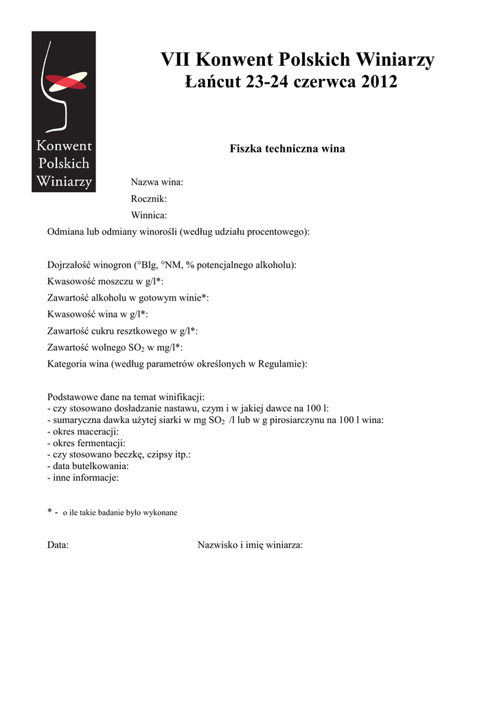 VII Konwent Polskich Winiarzy Łańcut 23-24 czerwca 2012 Fiszka techniczna wina Nazwa wina: Rocznik: Winnica: Odmiana lub odmiany winorośli (według udziału procentowego): Dojrzałość winogron (°Blg, °NM, % potencjalnego alkoholu): Kwasowość moszczu w g/l*: Zawartość alkoholu w gotowym winie*: Kwasowość wina w g/l*: Zawartość cukru resztkowego w g/l*: Zawartość wolnego SO2 w mg/l*: Kategoria wina (według parametrów określonych w Regulamie): Podstawowe dane na temat winifikacji: - czy stosowano dosładzanie nastawu, czym i w jakiej dawce na 100 l: - sumaryczna dawka uŜytej siarki w mg SO2 /l lub w g pirosiarczynu na 100 l wina: - okres maceracji: - okres fermentacji: - czy stosowano beczkę, czipsy itp.: - data butelkowania: - inne informacje: * - o ile takie badanie było wykonane Data: Nazwisko i imię winiarza: