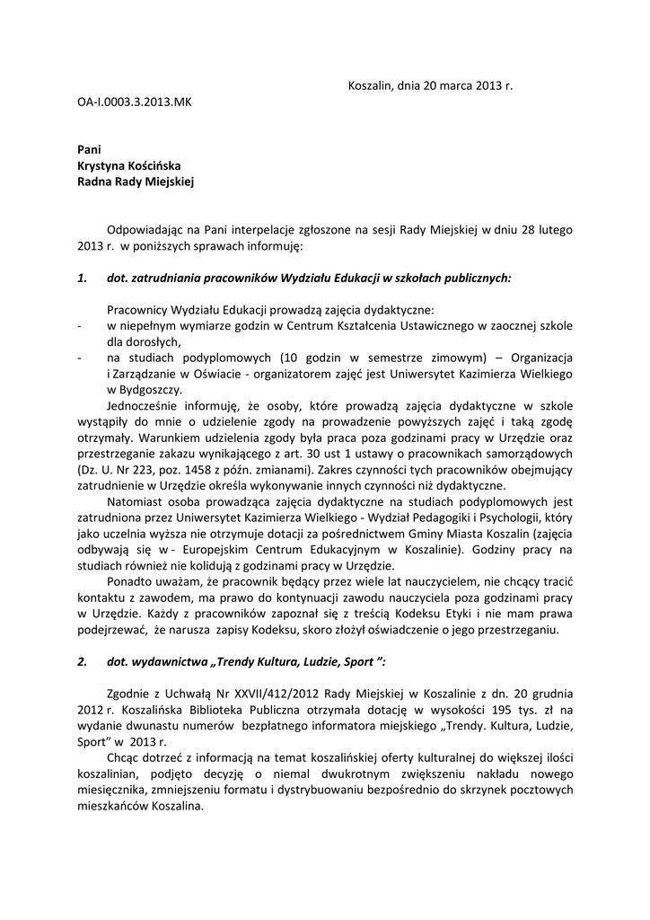 Koszalin, dnia 20 marca 2013 r. OA-I.0003.3.2013.MK Pani Krystyna Kościńska Radna Rady Miejskiej Odpowiadając na Pani interpelacje zgłoszone na sesji Rady Miejskiej w dniu 28 lutego 2013 r. w poniższych sprawach informuję: 1. dot. zatrudniania pracowników Wydziału Edukacji w szkołach publicznych: Pracownicy Wydziału Edukacji prowadzą zajęcia dydaktyczne: w niepełnym wymiarze godzin w Centrum Kształcenia Ustawicznego w zaocznej szkole dla dorosłych, na studiach podyplomowych (10 godzin w semestrze zimowym) – Organizacja i Zarządzanie w Oświacie - organizatorem zajęć jest Uniwersytet Kazimierza Wielkiego w Bydgoszczy. Jednocześnie informuję, że osoby, które prowadzą zajęcia dydaktyczne w szkole wystąpiły do mnie o udzielenie zgody na prowadzenie powyższych zajęć i taką zgodę otrzymały. Warunkiem udzielenia zgody była praca poza godzinami pracy w Urzędzie oraz przestrzeganie zakazu wynikającego z art. 30 ust 1 ustawy o pracownikach samorządowych (Dz. U. Nr 223, poz. 1458 z późn. zmianami). Zakres czynności tych pracowników obejmujący zatrudnienie w Urzędzie określa wykonywanie innych czynności niż dydaktyczne. Natomiast osoba prowadząca zajęcia dydaktyczne na studiach podyplomowych jest zatrudniona przez Uniwersytet Kazimierza Wielkiego - Wydział Pedagogiki i Psychologii, który jako uczelnia wyższa nie otrzymuje dotacji za pośrednictwem Gminy Miasta Koszalin (zajęcia odbywają się w - Europejskim Centrum Edukacyjnym w Koszalinie). Godziny pracy na studiach również nie kolidują z godzinami pracy w Urzędzie. Ponadto uważam, że pracownik będący przez wiele lat nauczycielem, nie chcący tracić kontaktu z zawodem, ma prawo do kontynuacji zawodu nauczyciela poza godzinami pracy w Urzędzie. Każdy z pracowników zapoznał się z treścią Kodeksu Etyki i nie mam prawa podejrzewać, że narusza zapisy Kodeksu, skoro złożył oświadczenie o jego przestrzeganiu. 2. dot. wydawnictwa „Trendy Kultura, Ludzie, Sport ”: Zgodnie z Uchwałą Nr XXVII/412/2012 Rady Miejskiej w Koszalinie z dn. 20 grudnia 2012 r. Koszalińska Biblioteka Publiczna otrzymała dotację w wysokości 195 tys. zł na wydanie dwunastu numerów bezpłatnego informatora miejskiego „Trendy. Kultura, Ludzie, Sport” w 2013 r. Chcąc dotrzeć z informacją na temat koszalińskiej oferty kulturalnej do większej ilości koszalinian, podjęto decyzję o niemal dwukrotnym zwiększeniu nakładu nowego miesięcznika, zmniejszeniu formatu i dystrybuowaniu bezpośrednio do skrzynek pocztowych mieszkańców Koszalina. Zawarte w tytule gazety słowo „trendy”, w odniesieniu do kultury, przestało być słowem „obcym”. Funkcjonuje ono, jako określenie czegoś na czasie. Zatem w kontekście nowej gazety, której ambicją jest wytyczanie „nowych” trendów życia Miasta, m in. dzięki wymiernej współpracy z aktywnymi mieszkańcami Koszalina, wydawały się być słowem trafionym. Układ graficzny okładki, ale i wnętrza, zmienia się co numer, także dzięki uważnemu słuchaniu głosów czytelników. To, że słowo Koszalin jest przy słowie trendy mniejsze, wynika z zamysłu kompozycyjnego grafika, a nie z chęci pomniejszania roli Miasta. Słowo „Koszalin” jest już zresztą znacznie większe od tego w numerze pierwszym. Numer ISSN został przyznany wydawnictwu z opóźnieniem, który wynikał z remontu jaki odbywał się w Bibliotece Narodowej. Został już umieszczony na okładce marcowego wydania gazety. Wybór formatu miesięcznika jest wynikiem nowych założeń dystrybucyjnych oraz chęci odróżnienia gazety od druków reklamowych, które znajdujemy w skrzynce pocztowej. Papier użyty do wydrukowania gazety jest identyczny z tym, na którym był drukowany „Miesiąc w Koszalinie”. Szata graficzna z kolei jest wynikiem wielu prób zaprojektowania niebanalnej treści, odróżniającej się od wszystkich innych okładek na rynku. Dominują na nich zdjęcia i mnóstwo treści. „Trendy. Kultura, Ludzie, Sport””, w zamyśle, mają być czymś czystym formalnie i nie przeładowanym słowami. Układ informacji o imprezach jest z założenia inny od proponowanego wcześniej w „Miesiącu w Koszalinie”. Po rozmowach z około stu osobami, autorzy nowej gazety zdecydowali, że znacznie korzystniejsza jest informacja o tym, co dzieje się danego dnia w Mieście, a nie w danym miejscu. To drugie rozwiązanie oznaczało konieczność „skakania” po instytucjach, żeby wiedzieć co wybrać danego dnia - galerię, kino czy może teatr. Jest to zmiana gruntownie przemyślana, choć na pewno sporo osób przywykło do poprzedniej wersji. Autorzy liczą, że przestawienie się na nową propozycję, to tylko kwestia czasu. Kalendarium imprez w sensie graficznym także ulega zmianom na podstawie uwag czytelników. W numerze trzecim wyraźnie widać tę zmianę. Od lutowego numeru informatora, zamieszczane informacje o wydarzeniach kulturalnych i sportowych, zawierają już dane adresowe i numery telefonów instytucji. Tytuł działu zawierającego istotne miejskie wydarzenia – „zdarza się”, określony w uwagach jako „nieuprawniony” i „nieadekwatny” do treści, użyty został jako synonim słowa wydarzenia. Nie chodzi tu jednak o pomniejszanie znaczenia tych treści, a raczej o nowe spojrzenie na to jak wyglądać może dzisiaj gazeta, która nie musi być przede wszystkim strasznie poważna. Artykuły wstępne, w każdym z trzech numerów, odnoszą się do spraw istotnych. W pierwszym chodzi o skuteczną komunikację, tu rozumianą jako rozmowę między gazetą a odbiorcami, do której ci drudzy są zachęcani. W drugim pojawia się pochwała miejsc w Koszalinie, które wbrew kryzysowi i pasywności odbiorców, animują zdarzenia kulturalne. W trzecim wreszcie, pojawia się promocja ludzi młodych i utalentowanych, a także obraz tego co robi Koszalin dla młodych (mTeatr, Młodzi i Film, Hanza Jazz Festiwal, Reflektor). Wymienianie w tym mi