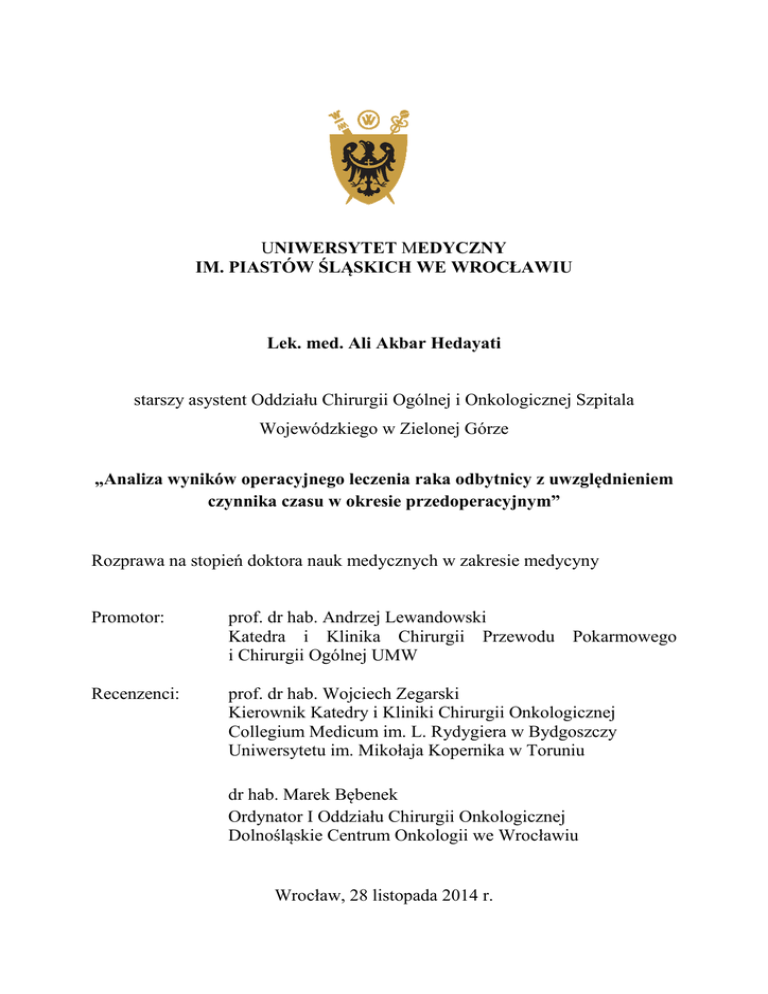UNIWERSYTET MEDYCZNY IM. PIASTÓW ŚLĄSKICH WE WROCŁAWIU Lek. med. Ali Akbar Hedayati starszy asystent Oddziału Chirurgii Ogólnej i Onkologicznej Szpitala Wojewódzkiego w Zielonej Górze „Analiza wyników operacyjnego leczenia raka odbytnicy z uwzględnieniem czynnika czasu w okresie przedoperacyjnym” Rozprawa na stopień doktora nauk medycznych w zakresie medycyny Promotor: prof. dr hab. Andrzej Lewandowski Katedra i Klinika Chirurgii Przewodu Pokarmowego i Chirurgii Ogólnej UMW Recenzenci: prof. dr hab. Wojciech Zegarski Kierownik Katedry i Kliniki Chirurgii Onkologicznej Collegium Medicum im. L. Rydygiera w Bydgoszczy Uniwersytetu im. Mikołaja Kopernika w Toruniu dr hab. Marek Bębenek Ordynator I Oddziału Chirurgii Onkologicznej Dolnośląskie Centrum Onkologii we Wrocławiu Wrocław, 28 listopada 2014 r. Curriculum Vitae Data urodzenia:02.06 1957 Miejsce urodzenia: Teheran-Iran WYKSZTAŁCENIE: 2010 Dyplom specjalisty z chirurgii onkologicznej 2001 Dyplom specjalisty II stopnia z chirurgii ogólnej. 1992 Dyplom specjalisty I stopnia z chirurgii ogólnej. 1988 Dyplom na Wydziale Lekarskim Akademii Medycznej im. Piastów Śląskich we Wrocławiu PRZEBIEG PRACY ZAWODOWEJ: Od 1988 i obecnie Oddział Chirurgii Ogólnej i Onkologicznej Szpitala Wojewódzkiego w Zielonej Górze na stanowisku starszy asystent. SPIS PUBLIKACJI 1. J. Bandurski, E. Dunas, A. A. Hedayati, M. Tuszewski, M. Jesionowski. Niedrożność mechaniczna przewodu pokarmowego spowodowana wgłobieniem jelita cienkiego w zespole Peutz-Jeghersa Nowiny Lekarskie 1996,65,2,249-251. Pkt. MNiSW/KBN: 1.00 2. Ali Akbar Hedayati, Andrzej Lewandowski, Jędrzej Bandurski, Krystyna Markocka-Mączka.: Larg Intestine Cancer –Epidemiology, Diagnosis, Treatment. W:Wellness in good health and sickness ; sci. ed. Krzysztof Turowski; Lublin : NeuroCentrum, 2011;13-21 Pkt. MNiSW/KBN: 7.000 3. Ali Akbar Hedayati, Jędrzej Bandurski, Andrzej Lewandowski.: Bifocal metastasis of melanoma to the small intestine from an unknown primary with intestinal obstruction- case report. Współcz. Onkol. 2013.17.3;317-329. Pkt. MNiSW: 15, IF 0,211 Łączna liczba punktów MNiSW/KBN: 23, IF- 0, 211(liczba prac: 1) STRESZCZENIE Wstęp Rak jelita grubego jest jednym z najczęściej wstępujących nowotworów w krajach wysoko rozwiniętych. W Polsce zachorowalność na ten nowotwór zajmuje drugie miejsce w strukturze zachorowań na nowotwory, odpowiednio 11, 9% u mężczyzn i 10, 3% u kobiet. Liczba zachorowań w 2005 roku wyniosła ponad 7000 u mężczyzn i ponad 5000 u kobiet. Wskaźnik pięcioletniego przeżycia wynosi poniżej 50% W przypadku wczesnego wykrycia ten nowotwór w 90% jest uleczalny. Tak wysoki odsetek wyleczalności jest możliwy dzięki wprowadzaniu badań przesiewowych W materiale własnym zachorowalność na ten nowotwór częściej stwierdzono u mężczyzn w wieku 60-70 lat, u kobiet między 70-80 roku życia. Cel pracy Celem pracy jest analiza wyników leczenia raka odbytnicy w aspekcie: 1.Wpływu czynnika czasu na wyniki operacyjnego leczenia raka odbytnicy. 2.Oceny operacyjności nowotworu w zależności od czasu trwania choroby. 3.Analizy przyczyn opóźnień w leczeniu specjalistycznym. Materiały i metody Analizie poddano grupę 240 pacjentów z rozpoznaniem raka odbytnicy potwierdzonym badaniem histopatologicznym, operowanych w Oddziale Chirurgii Ogólnej, Onkologicznej i Naczyń Szpitala Wojewódzkiego w Zielonej Górze w latach 1997-2006. Dane zebrano i analizowano z dwóch źródeł: na podstawie przeprowadzonej ankiety i przeglądu dokumentacji medycznej uzyskanej z historii chorób znajdujących się w archiwum szpitalnym. Na wykorzystanie danych z archiwum uzyskano zgodę Dyrektora szpitala. Uzyskane wyniki poddano analizie statystycznej, oraz oceniono stopień wpływu badanych parametrów na wyniki leczenia. Chorzy, którzy odpowiedzieli na ankietę wyrazili zgodę na udział w niej. Na wykonanie badań uzyskano zgodę Komisji Bioetycznej przy Uniwersytecie Medycznym we Wrocławiu Nr KB- 185/2014. W minionym okresie według dostępnej dokumentacji 240 chorych z ustalonym rozpoznaniem raka odbytnicy zostało poddanych leczeniu operacyjnemu. Do wszystkich wysłano zaproszenie na rozmowę. Materiał zawarty w tej pracy uzyskano z rozmowy bezpośredniej z chorymi w liczbie 29, którzy zgłosili się na rozmowę. Informacje o pozostałych 211chorych, którzy na zaproszenie nie odpowiedzieli uzyskano z historii chorób z archiwum szpitala w Zielonej Górze. Wyniki: W wyniku analizy zgromadzonych danych ustalono trzy okresy, które mają wpływ na wyniki leczenia raka odbytnicy. Pierwszy okres to jest czas od początku objawów chorobowych zauważonych przez chorych do czasu zgłoszenia do lekarza. Drugi okres to jest czas próby leczenia chorych i przeprowadzenie badań diagnostycznych przez lekarzy pierwszego kontaktu. Trzeci okres to jest czas od potwierdzenia raka i rozpoczęcia leczenia specjalistycznego. Po przeanalizowaniu dostępnej dokumentacji stwierdzono, że średni czas od pierwszych objawów choroby do momentu zgłoszenia się do lekarza trwał średnio 8 miesięcy. Drugi okres to jest czas próby leczenia i wykonania badań diagnostycznych przez lekarzy podstawowej opieki zdrowotnej trwał średnio 3, 7 miesiąca. Trzeci okres to jest czas od ustalenia rozpoznania do leczenia operacyjnego średnio jeden miesiąc. U chorych na podstawie badania histopatologicznego najczęściej stwierdzono gruczolakoraka o wysokim stopniu zróżnicowania. Najczęstszą lokalizację guza stwierdzono w dolnym odcinku odbytnicy to jest do 6 cm od brzegu odbytu. Na podstawie dostępnej dokumentacji ustalono, że część chorych miało leczenie adiuwantowe w postaci radioterapii krótko terminowej i radiochemioterapii długoterminowej. Stopień zaawansowania raka materiału pooperacyjnego ustalono według klasyfikacji Astlera-Collera i w skali TNM. Według tej klasyfikacji najczęściej stwierdzono stopień B1,2 i na drugim mi