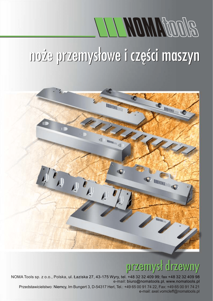 noże przemysłowe i części maszyn przemysł drzewny NOMA Tools sp. z o.o., Polska, ul. Łaziska 27, 43-175 Wyry, tel. +48 32 32 409 99; fax +48 32 32 409 98 e-mail: [email protected], www.nomatools.pl Przedstawicielstwo: Niemcy, Im Bungert 3, D-54317 Herl, Tel.: +49 65 00 91 74 22, Fax: +49 65 00 91 74 21 e-mail: [email protected] Noże maszynowe i części zużywające się dla przemysłu drzewnego NOMA Tools jest wiodącym producentem noży i innych części zużywających się stosowanych w przemyśle drzewnym. Wieloletnie doświadczenie, ciągłe doskonalenie procesu produkcji oraz bezwzględne dotrzymywanie reżimu technologicznego pozwalają sprostać wysokim wymaganiom jakościowym naszych klientów. Produkujemy zgodnie ze standardami normy PN-EN ISO 9001. Dostarczamy noże zarówno do producentów maszyn jak i do końcowych użytkowników. Produkujemy między innymi: 9 9 9 9 9 9 9 9 9 9 9 9 9 9 9 9 9 9 9 kosze nożowe do skrawarek noże do skrawarek rębaki noże do forniru noże do sklejki noże łuszczarskie imaki (skrzynki) nożowe belki nożowe wkłady kosza wykładziny kosza śruby młotkowe pierścienie uszczelniające pierścienie przednie pierścienie tylne przeciwnoże listwy nożowe listwy mocujące płyty ochronne płyty mocujące Dobieramy stal i inne parametry wg indywidualnych potrzeb użytkownika służąc swoją wiedzą i wieloletnim doświadczeniem. Realizujemy zamówienia na nietypowe części wg dokumentacji technicznej klientów. Jeżeli jesteście Państwo zainteresowani szczegółami naszej oferty prosimy o kontakt lub przysłanie zapytania ofertowego zawierającego rysunek wyrobu, ilość oraz wszelkie informacje, które uznacie za istotne, a które pozwolą nam przygotować najlepszą ofertę. Kontakt: Dział Sprzedaży i Marketingu Tel.: +48 32 32 409 99 Fax: +48 32 32 409 98 e‐mail: [email protected] Przemysł drzewny Płyty wiórowe i MDF / Płyty OSB / Sklejka / Fornir Produkujemy noże przemysłowe, części zużywające się, kosze nożowe i inne elementy maszyn następujących producentów: Pallmann 9 PZKR 14-450-49 9 PZKR 14-450-60 9 PZKR 14-450-66 o Kosz skrawarki - 02.002.000.00 o Nóż skrawarki - 02.002.001.00 o Imak nożowy - 02.002.002.00 o Wkład kosza - 02.002.003.00 o Belka nożowa - 02.002.005.00 o Pierścień przedni - 02.002.011.00 o Pierścień tylni - 02.002.010.00 o Pierścień zamykający (uszczelniający) - 02.002.008.00 o Pierścień (ćwiartka) - 02.002.006.00 o Zaczep (kostka montażowa) - 02.002.012.00 o Kostka ustawcza - 02.002.015.00 o Element wypełniający - 02.002.009.00 9 PZKR 14-450-74 o Kosz skrawarki - 02.001.000.00 o Nóż skrawarki - 02.001.001.00 o Imak nożowy - 02.001.002.00 o Wkład kosza - 02.001.003.00 o Belka nożowa - 02.001.004.00 o Pierścień przedni - 02.001.005.00 o Pierścień tylni - 02.001.006.00 o Pierścień zamykający (uszczelniający) - 02.001.007.00 o Pierścień (ćwiartka) - 02.001.008.00 o Zaczep (kostka montażowa) - 02.001.009.00 o Kostka ustawcza - 02.001.010.00 o Element wypełniający - 02.001.011.00 o Kołek ustawczy - 02.001.012.00 o Podkładka - 02.001.013.00 9 9 9 9 PZKR 15-500-66 PHT 570x550 PHT 500x1250 PSKM 15 Przemysł drzewny Płyty wiórowe i MDF / Płyty OSB Maier 9 9 9 9 9 / Sklejka Hombak MRZ 1400-60 HRL 2000/850x1200 HRL 2000/850x1500 HRL 1200/350x800 HRL 1200/450x1000 9 9 9 9 U74-1 U74-2 U74-3 U112 RB1300 Klockner KHZ 14 Rudnick Andritz Vecoplan Bruks Bandit Inne noże i części zamienne wg indywidualnych potrzeb klientów. / Fornir Przemysł drzewny Płyty wiórowe i MDF / Płyty OSB / Sklejka / Fornir Produkujemy noże przemysłowe i części zużywające się, głównie do następujących maszyn: Pallmann 9 9 9 9 PZU 19-725-36 PZU 22-725-36 PZU 22-725-42 PZU 25-800-36 Inne noże i części zamienne wg indywidualnych potrzeb klientów. Przemysł drzewny Płyty wiórowe i MDF / Płyty OSB / Sklejka / Fornir Produkujemy noże przemysłowe i części zużywające się, głównie do następujących maszyn: Raute Erdi Colombo Cremona Corolla Keller Klockner Colombo Cremona Josting Corali Doda Inne noże i części zamienne wg indywidualnych potrzeb klientów. Przemysł drzewny Płyty wiórowe i MDF / Płyty OSB / Sklejka / Fornir Produkujemy noże przemysłowe i części zużywające się, głównie do następujących maszyn: Cremona Josting Doda Inne noże i części zamienne wg indywidualnych potrzeb klientów.