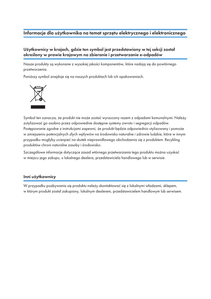 Informacje dla użytkownika na temat sprzętu elektrycznego i elektronicznego Użytkownicy w krajach, gdzie ten symbol jest przedstawiony w tej sekcji został określony w prawie krajowym na zbieranie i przetwarzanie e-odpadów Nasze produkty są wykonane z wysokiej jakości komponentów, które nadają się do powtórnego przetworzenia. Poniższy symbol znajduje się na naszych produktach lub ich opakowaniach. Symbol ten oznacza, że produkt nie może zostać wyrzucony razem z odpadami komunalnymi. Należy zutylizować go osobno przez odpowiednie dostępne systemy zwrotu i segregacji odpadów. Postępowanie zgodne z instrukcjami zapewni, że produkt będzie odpowiednio utylizowany i pomoże w zmiejszeniu potencjalnych złych wpływów na środowisko naturalne i zdrowie ludzkie, które w innym przypadku mogłyby ucierpieć na skutek nieprawidłowego obchodzenia się z produktem. Recykling produktów chroni naturalne zasoby i środowisko. Szczegółowe informacje dotyczące zasad wtórnego przetwarzania tego produktu można uzyskać w miejscu jego zakupu, u lokalnego dealera, przedstawiciela handlowego lub w serwisie. Inni użytkownicy W przypadku pozbywania się produktu należy skontaktować się z lokalnymi władzami, sklepem, w którym produkt został zakupiony, lokalnym dealerem, przedstawicielem handlowym lub serwisem.