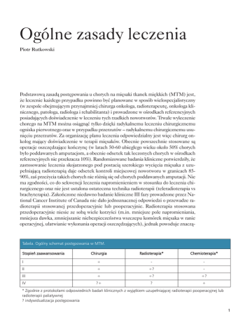 Ogólne zasady leczenia Piotr Rutkowski Podstawową zasadą postępowania u chorych na mięsaki tkanek miękkich (MTM) jest, że leczenie każdego przypadku powinno być planowane w sposób wielospecjalistyczny (w zespole obejmującym przynajmniej chirurga onkologa, radioterapeutę, onkologa klinicznego, patologa, radiologa i rehabilitanta) i prowadzone w ośrodkach referencyjnych posiadających doświadczenie w leczeniu tych rzadkich nowotworów. Trwałe wyleczenie chorego na MTM można osiągnąć tylko dzięki radykalnemu leczeniu chirurgicznemu ogniska pierwotnego oraz w przypadku przerzutów – radykalnemu chirurgicznemu usunięciu przerzutów. Za organizację planu leczenia odpowiedzialny jest więc chirurg onkolog mający doświadczenie w terapii mięsaków. Obecnie powszechnie stosowane są operacje oszczędzające kończynę (w latach 50-60 ubiegłego wieku około 50% chorych było poddawanych amputacjom, a obecnie odsetek tak leczonych chorych w ośrodkach referencyjnych nie przekracza 10%). Randomizowane badania kliniczne potwierdziły, że zastosowanie leczenia skojarzonego pod postacią szerokiego wycięcia mięsaka z uzupełniającą radioterapią daje odsetek kontroli miejscowej nowotworu w granicach 8590%, zaś przeżycia takich chorych nie różnią się od chorych poddawanych amputacji. Nie ma zgodności, co do sekwencji leczenia napromienieniem w stosunku do leczenia chirurgicznego oraz nie jest ustalona ostateczna technika radioterapii (teleradioterapia vs brachyterapia). Zakończone niedawno badanie kliniczne III fazy prowadzone przez National Cancer Institute of Canada nie dało jednoznacznej odpowiedzi o przewadze radioterapii stosowanej przedoperacyjnie lub pooperacyjnie. Radioterapia stosowana przedoperacyjnie niesie ze sobą wiele korzyści (m.in. mniejsze pole napromieniania, mniejsza dawka, zmniejszanie niebezpieczeństwa wszczepu komórek mięsaka w ranie operacyjnej, ułatwianie wykonania operacji oszczędzających), jednak powoduje znaczą- Tabela. Ogólny schemat postępowania w MTM. Stopień zaawansowania Chirurgia Radioterapia* Chemioterapia* I + - - II + +? - III + +? +? IV ?+ ? + * Zgodnie z protokołami odpowiednich badań klinicznych z wyjątkiem uzupełniającej radioterapii pooperacyjnej lub radioterapii paliatywnej ? indywidualizacja postępowania 1 OGÓLNE ZASADY LECZENIA Objawy kliniczne wyczuwalny guz zniekształcenie zarysu ciała brak dolegliwości bólowych położenie podpowięziowe wielkośc powyżej 5 cm przyszpieszenie wzrostu obwodowe zaburzenia neurologiczne (rzadko) • objawy ogólne mogą być nieobecne • • • • • • • • • • • • Rutynowe badania dodatkowe wywiady lekarskie i badanie przedmiotowe RTG klatki piersiowej w dwóch projekcjach RTG zmiany („z kratką”) badania dodatkowe: morfologia, biochemia ewentualnie BAC Badania dodatkowe z wyboru Badanie rezonansu magnetycznego (MR) z kontrastem, ewentualnie tomografia komputerowa (TK) Weryfikacja histologiczna Biopsja otwarta nacinająca Biopsja gruboigłowa Biopsja otwarta wycinająca (tylko dla ≤5 cm) powierzchownie Różnicowanie Nowotwory łagodne Mięsaki kości Myositis ossificans Zmiany przerzutowe Fascitis Chłoniaki Tenosynovitis Stopień zaawansowania klinicznego TNM Decyzja terapeutyczna (M0) (M1) Rycina 1. Schemat postępowania diagnostycznego dla mięsaków tkanek miękkich zlokalizowanych na kończynach lub w powłokach ciała. ce powikłania w gojeniu rany. Dawki rekomendowane do pooperacyjnej radioterapii uzupełniającej w leczeniu MTM są wysokie (60-70 Gy) w ciągu 7-8 tygodni leczenia. Konwencjonalna chemioterapia ma niewielki wpływ na wyniki leczenia większości typów MTM. Metaanaliza obejmująca 14 badań klinicznych w grupie 1568 chorych na MTM leczonych pooperacyjną chemioterapią z zastosowaniem doksorubicyny wskaza2 M I Ę S A K I T K A N E K M I Ę K K I C H U D O R O S ŁY C H Decyzje terapeutyczne M0 Rozpoznanie mięsaka tkanek miękkich G2-3 Wielkość >10 cm G1 <10 cm >5 cm <5 cm Leczenie indywidualizowane RTH przedoperacyjna/CTH przedoperacyjna Wycięcie (R0) Operacja Wielkość >10 cm Leczenie indywidualizowane RTH przedoperacyjna/CTH przedoperacyjna <10 cm >5 cm <5 cm EBRT pooperacyjna Rehabilitacja pooperacyjna Obserwacja Badania kontrolne co 3-6 miesięcy przez 5 lat Rycina 2. Schemat postępowania leczniczego w mięsakach tkanek miękkich kończyn i tułowia EBRT – radioterapia z pól zewnętrznych, CHTH – chemioterapia, RTH – radioterapia, M0 –brak przerzutów, R0 – resekcja mikroskopowo radykalna ła 10% poprawę w zakresie przeżycia wolnego od nawrotu choroby (istotne statystycznie) oraz około 4% poprawę przeżyć całkowitych (nieistotne statystycznie). Jednak postęp związany z pojawianiem się leków celowanych molekularnie działających na zaburzenia leżące u podstawy rozwoju poszczególnych typów MTM może przynieść w najbliższym czasie zmianę w tym zakresie. Leczenie chirurgiczne przerzutów do płuc stanowi postępowanie z wyboru w przypadkach policzalnych, resekcyjnych zmian ograniczonych jedynie do płuc. Ogólnie, wskazana jest indywidualizacja skojarzonego leczenia chorych na MTM z przestrzeganiem następujących ogólnych zasad postępowania (tabela): Wyłączne leczenie chirurgicznie jest uzasadnione jedynie u chorych w stopniu zaawansowania IA (czyli mięsakach o niskim stopniu złośliwości położonych powierzchownie i wielkości do 5 cm) według TNM. W pozostałych stopniach zaawansowania według TNM (IB, IIA, IIB, IIC) należy stosować radykalne leczenie chirurgiczne i pooperacyjną radioterapię. Z tego powo3 OGÓLNE ZASADY LECZENIA du nie należy podejmować leczenia mięsaków tkanek miękkich w ośrodkach nieposiadających zakładów radioterapii. W IV stopniu zaawansowania (N1, M1) obowiązuje rozpoczynanie leczenia od chemioterapii. W przypadku uzyskania odpowiedzi i przy policzalnych przerzutach (potencjalnie operacyjnych) obowiązuje radykalizacja postępowania 