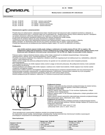 Art. Nr 190840 Moduły kamer z oświetleniem IR i mikrofonem www.conrad.pl Nr.zam. 19 08 00 Nr.zam. 19 08 14 Nr.zam. 19 08 26 Nr.zam. 19 08 40 1/3” CCD – kamera czarno/biała 1/4" CCD – kamera kolorowa 1/4" CMOS – kamera czarno/biała 1/3” CMOS – kamera kolorowa Zastosowanie zgodne z przeznaczeniem Produkt służy do nadzorowania i zabezpieczania miejsc niewidocznych lub krytycznych (jako urządzenie kontrolne w sklepach, w zamkach akustycznych drzwi, w okolicach wejść lub na parkingach itd.). Zarejestrowane obrazy można odtworzyć łącznie z dźwiękiem na każdym stosownym odbiorniku telewizyjnym lub monitorze z wejściem audio-video (AV). W ciemności permanentne oświetlenie podczerwone (IR) stanowi niewidoczne źródło światła. Podłączenie do zasilania odbywa się przez standardowe urządzenie wtykowe. Użycie kamery bez osłony (bez odpowiedniej obudowy) jest niedopuszczalne. Należy unikać kontaktu z wilgocią. Należy pamiętać, że obserwacja osób obcych przy pomocy tej kamery bez ich wiedzy i zgody jest karalna. Produkt jest dopuszczony do podłączenia pod zasilanie prądem stałym 12V lub 9V (w zależności od modelu). Podłączenie Jako źródło zasilania używać źródła prądu stałego w zależności od modelu kamery 9V lub 12V na wyjściu. Nie podejmować nigdy prób korzystania z kamery podłączonej do innego źródła napięcia. Źródło prądu stałego kamery musi dostarczać jako obciążenie minimalne prąd o parametrach 150 lub 250 mA. Nigdy nie przeciążać źródła napięcia. Podczas wyboru miejsca lokalizacji kamery należy unikać miejsc narażonych na działanie bezpośredniego, intensywnego nasłonecznienia, wibracji, kurzu, wysokiej temperatury, zimna i wilgoci. W pobliżu nie powinny znajdować się urządzenia o działaniu silnych pól magnetycznych lub elektrycznych np. radiotelefony, odbiorniki radiowe, silniki elektryczne usw. Należy zwrócić uwagę, aby podczas podłączenia kamery nie zgnieść ani nie uszkodzić przez ostre krawędzie przewodu doprowadzającego. Przy podłączeniu kamery do źródła napięcia należy zwrócić uwagę na kierunek polaryzacji. Złe podłączenie kamery może uszkodzić poszczególne jej elementy. Kamerę podłączyć pod stabilne stałe źródło napięcia z zasilacza lub z baterii/ akumulatorka. Źródło napięcia musi również zasilać urządzenie wymaganym prądem. Zastosowany zasilacz powinien bezwzględnie odpowiadać obowiązującym przepisom bezpieczeństwa oraz być przeznaczony do każdorazowego przypadku zastosowania. Urządzenia ładowane z samochodu i transformatory zabawek są w tym przypadku nieodpowiednie i powodują uszkodzenia elementów układu lub zanik funkcji układu kamery. Kamera podłączona jest do zasilacza i odbiornika TV/ monitora za pomocą trzech przewodów. Podłączenie kamery Podłączyć małą białą wtyczkę przewodu przyłączeniowego do modułu kamery. Pasuje do gniazdka wyłącznie zgodnie z kierunkiem polaryzacji. Podłączenie audio/video Połączyć wejście video odbiornika TV lub monitora Użytkownika z żółtym gniazdkiem cinch modułu kamery. Połączyć wejście audio TV lub monitora Użytkownika z białym gniazdkiem cinch modułu kamery. Należy zawsze używać opcjonalnie odpowiedniego przewodu przyłączeniowego cinch (polaryzacja: wewn. video/audio, zewn. masa). Podłączenie do zasilania Podłączyć czerwoną wtyczkę zasilającą przewodu przyłączeniowego kamery (VDC) do odpowiedniego zasilacza: wtyczka niskiego napięcia DC powinna mieć następujące właściwości: - wymiary zewn.5,5 mm, otwór wewn.2,1 mm; - polaryzacja wewn. plus (+), zewn. minus (-). Konserwacja i czyszczenie Poza sporadycznym czyszczeniem obiektywu produkt nie wymaga konserwacji. Do czyszczenia używać czystej, niemechacącej, antystatycznej i suchej ściereczki bez chemicznych środków czyszczących powodujących zarysowania lub zawierających substancje rozpuszczalne. Dane techniczne Napięcie robocze Pobór prądu Czujnik obrazu Format video Soczewka (ogniskowa) Numer zam. 19 08 00 12 VDC (+/-10%) maks. 250mA 1/3” CCD czarno-biały CCIR f 3,6mm Numer zam. 19 08 14 12 VDC (+/-10%) maks. 250mA 1/4" CCD kolor PAL f 6mm Poziom sygnału wideo Poziom sygnału audio Mikrofon, mono Światłoczułość Czas zamknięcia Efekt.punkty obrazu (piksel) Rozdzielczość (pozioma TV) Stosunek sygn.video - szum Zakres temperatury roboczej Wzgl. wilgotność powietrza Wymiary (dł.x szer.x wys.) Rozstaw otworów/ mocowań Masa (bez przewodu przył.) 1 Vp-p / 75 Ohm 1 Vp-p / 600 Ohm mikrofon pojemnościowy 0,01Lux dla F1,2 1/50 ~ 1/100.000 (sek.) 582 H x 500 V 380 > 48 dB -20°C do +55°C <90%, nie skondens. 55 x 38 x 25 (mm) 33 mm (d=2,5mm) ok. 15 g 1 Vp-p / 75 Ohm 1 Vp-p / 600 Ohm mikrofon pojemność. 0,01Lux dla F1,2 1/50 ~ 1/100.000 (sek.) 582 H x 500 V 380 > 48 dB -20°C do +55°C <90%, nie skondens. 55 x 38 x 25 (mm) 33 mm (d=2,5mm) ok. 15 g Napięcie robocze Pobór prądu Czujnik obrazu Format video Soczewka (ogniskowa) Poziom sygnału wideo Poziom sygnału audio Mikrofon, mono Światłoczułość Czas zamknięcia Efekt.punkty obrazu (piksel) Rozdzielczość (pozioma TV) Stosunek sygn.video - szum Zakres temperatury roboczej Wzgl. wilgotność powietrza Wymiary (dł.x szer.x wys.) Rozstaw otworów/ mocowań Masa (bez przewodu przył.) Numer zam. 19 08 26 9 VDC (+/-10%) maks. 150mA 1/4” CMOS czarno-biały CCIR f 3,6mm 1 Vp-p / 75 Ohm 1 Vp-p / 600 Ohm mikrofon pojemnościowy 0,5 Lux dla F1,4 1/50 ~ 1/6.000 (sek.) 352 H x 288 V 320 > 48 dB -20°C do +55°C <90%, nie skondens. 55 x 38 x 25 (mm) 33 mm (d=2,5mm) ok. 15 g Numer zam. 19 08 40 9 VDC (+/-10%) maks. 150mA 1/3" CMOS kolor PAL f 3,6mm 1 Vp-p / 75 Ohm 1 Vp-p / 600 Ohm mikrofon pojemność. 3,0 Lux dla F1,2 1/60 ~ 1/15.000 (sek.) 510 H x 492 V 280 > 48 dB -20°C do +55°C <90%, nie skondens. 55 x 38 x 25 (mm) 33 mm (d=2,5mm) ok. 15 g