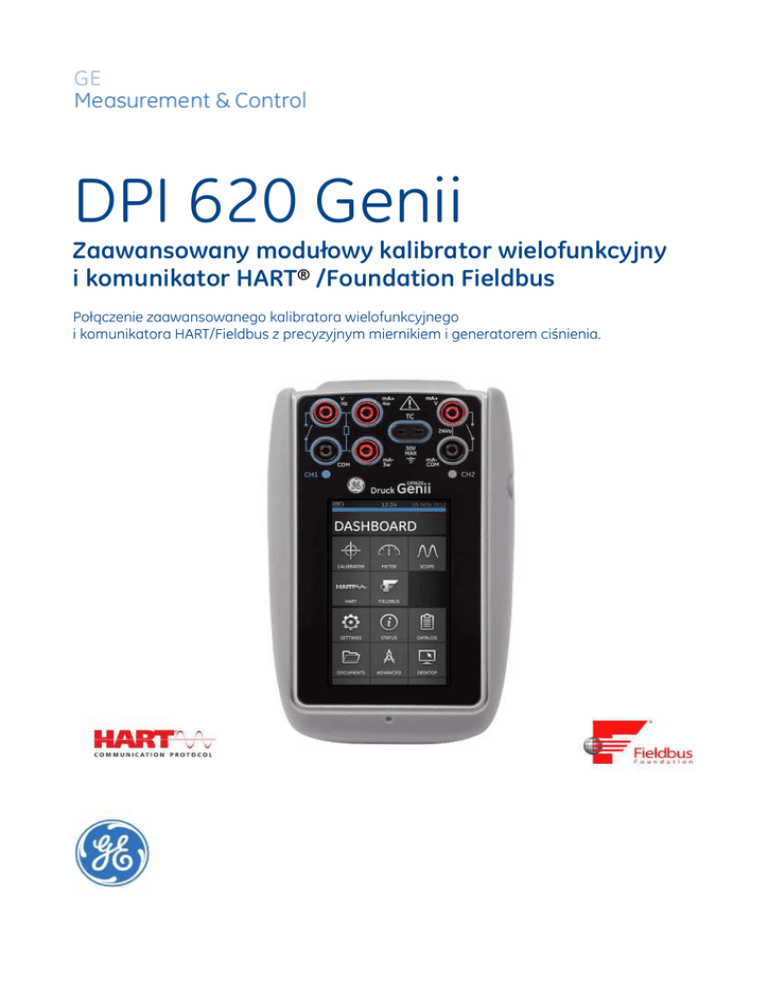 DPI 620 Genii Zaawansowany modułowy kalibrator wielofunkcyjny i komunikator HART® /Foundation Fieldbus Połączenie zaawansowanego kalibratora wielofunkcyjnego i komunikatora HART/Fieldbus z precyzyjnym miernikiem i generatorem ciśnienia. Elastyczny system modułowy Druck DPI 620 Genii - zaawansowany modułowy kalibrator wielofunkcyjny i cyfrowy komunikator HART/Fieldbus, składa się z czterech elementów systemowych, zapewniając wielofunkcyjność w aplikacjach wymagających kiedyś stosowania ilości różnych urządzeń. Komponenty wchodzące w skład systemu to: • • • • DPI 620G – Kalibrator wielofunkcyjny, komunikator HART/Fieldbus PM 620 – Wymienne moduły ciśnieniowe MC 620G – Przystawka/uchwyt do modułów ciśnieniowych PV 62xG – Stacje generująca ciśnienie Właściwości • Wielofunkcyjność: pomiary elektryczne, częstotliwościowe, temperatury, ciśnienia • Zaawansowany komunikator HART • Opcjonalny komunikator Fieldbus Foundation • Modułowa koncepcja • Możliwość korzystania z poszczególnych komponentów jako osobnych urządzeń • Znaczącą redukcję wyposażenia • Łatwa obsługa oraz zwiększone bezpieczeństwo użytkownika • Niskie koszty użytkowania Wielozakresowy dwukanałowy pomiar ciśnienia od 25 mbar (10 dla H2O) do 1000 bar. Mierzy oraz symuluje: mA, mV, V, Ohmy, Częstotliwość, RTD, Termopary. Wielozakresowy pomiar i generacja ciśnienia od 25 mbar (10 dla H2O) do 1000 bar. DPI 620 Genii (P/N DPI620G) Ten kompaktowy kalibrator/komunikator HART umożliwia jednoczesny pomiar oraz symulację sygnałów pozwalając na konfigurowanie ustawień, testowanie oraz kalibrację większości urządzeń procesowych włączając przetworniki (z wyjściem prądowym i napięciowym), manometry, wskaźniki, przełączniki, czujniki zbliżeniowe, przeliczniki, czujniki temperatury (RTD i TC) i zawory. Co nowego w Genii w porównaniu ze starym DPI 620? • Wyświetlacz dotykowy oparty na technologii znanej z nowoczesnych telefonów z nowym interfejsem użytkownika oraz obsługą gestów, zapewniający większą łatwość obsługi. • Kompletnie nowa platforma cyfrowa oraz modemy wspierające komunikację HART/Fieldbus • Nowe menu do szybkiego uruchamiania popularnych funkcji (np. kalibrator lub HART) oraz nowa aplikacja SCOPE do diagnostyki sygnałów w czasie rzeczywistym. • Nowe menu zadaniowe umożliwiające konfigurację różnych urządzeń jednym przyciskiem. Możliwość dodawania zadań skonfigurowanych przez użytkownika. • Wszystkie komponenty oraz akcesoria z pierwszej generacji urządzeń DPI 620 są w pełni kompatybilne z nowym systemem Genii Standardowe aplikacje Kalibrator • Wybór standardowych zadań za pomocą jednego przycisku, np: tryb P – I dla przetwornika ciśnienia • Najwyższa dokładność pomiaru, źródła oraz symulacji sygnałów elektrycznych, częstotliwościowych, temperaturowych i ciśnieniowych • Jednoczesna symulacja wejścia oraz pomiar wyjścia urządzenia (do 6 aktywnych kanałów) • Kalkulacja błędów pomiędzy wejściami a wyjściami • System ciśnieniowy generuje 100 bar pneumatycznie i 1000 bar hydraulicznie • Wymienne moduły ciśnieniowe o zakresach od 25 mbar do 1000 bar Miernik • Łatwy w użyciu miernik • Pomiary, testowanie źródeł zasilania, sprawdzanie ciągłości obwodów Oscyloskop • Analiza graficzna sygnałów elektrycznych i ciśnieniowych w czasie rzeczywistym • Zaawansowana diagnostyka oraz wyszukiwanie błędów Komunikator HART • • • • • • • Wyświetlanie, zmiana, klonowanie i zapisywanie konfiguracji urządzeń Praca w trybie off-line pozwalająca tworzyć i zmieniać konfiguracje urządzeń Transmisja konfiguracji urządzeń do komputera Pomiar i generowanie analogowych sygnałów bez dodatkowego sprzętu kalibracyjnego Zasilanie przyłączonego urządzenia napięciem 24V Wbudowany rezystor 250 Ohm Łatwa rozbudowa komunikatora poprzez darmowe aktualizacje i najnowsze biblioteki DD Parametry techniczne DPI 620 Genii Parametry techniczne - ogólne Wyświetlacz Język Temperatura pracy Temperatura przechowywania Szczelność obudowy Wilgotność Odporność na wstrząsy i wibrację Kompatybilność elektromagnetyczna Bezpieczeństwo – sygnały elektryczne Bezpieczeństwo – ciśnienie Certyfikaty Wymiary Waga Zasilanie Czas pracy na baterii Łączność Rozmiar: 110mm przekątna (4,3 cala); 480 x 800 pikseli; LCD: kolorowy wyświetlacz z panelem dotykowym Angielski (domyślnie), chiński, francuski, niemiecki, włoski, portugalski, rosyjski, hiszpański, holenderski, japoński, polski od -10ºC do 50ºC od -20ºC do 70ºC IP54 (Pył, strumień wody) Od 0 do 90%, RH wilgotności względnej bez kondensacji Zgodne BS EN 61010:2001; Def Stan 66-31, 8.4 cat III, testowany na upadek z wys. 1 m Zgodne z BS EN 61326-1:2006 Zgodne z BS EN 61010 : 2001 Zgodne z dyrektywą klasy SEP (Sound Engineering Practice) CE DPI 620 Genii : 183 x114 x 42 mm + MC 620/G: ≈ 265 x 114 x 64 mm + PM 620: ≈ 265 x 114 x 93 mm DPI 620 Genii: ≈ 575 g – z baterią. MC 620/G: ≈ 640 g . PM 620 : ≈ 100 g . Akumulator litowo-polimerowy (ozn. kat.: IO620-Battery); pojemność: 5040 mAh (min), 5280 mAh (typowo); Napięcie nominalne: 3.7 V. Temperatura ładowania : 0° do 40°C ; Temp. rozładowywania: 20° do 60°C. Cykle ładowania/rozładowywania: > 500 > 70% pojemności. Nota: Najlepsza wydajność baterii przy pracy w temperaturze poniżej 60°C . Funkcja pomiaru (CH1): ≈ 12 h. ciągłej pracy. Pomiar + zasilanie przetwornika (CH2): ≈ 7 h (24 V , 12 mA). USB Typ A, USB Typ Mini B, WiFi IEEE 802.11g, Bluetooth Parametry techniczne – Sygnały elektryczne NLH&R ±1°C / 24h 1) %wskaz. + %zakr. Całkowita niepewność 10÷ 30°C/rok3) %wskaz. + %zakr. Błąd dodatkowy -10÷10°C i 30÷50°C %wsk./°C +%zakr/°C Rozdziel -czość Okno/ kanał Pomiar TC Tryb TC - 10 ÷ 100 mV ± 200 mV Napięcie DC ± 2000 mV ± 20 V ± 30 V 0 ÷ 2000 mVAC Napięci