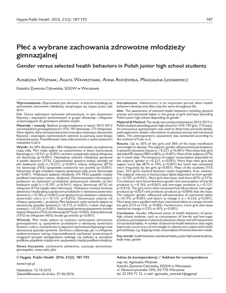 Woźniak Hygeia Public A i wsp. Health Płeć2016, a wybrane 51(2):zachowania 187-193 zdrowotne młodzieży gimnazjalnej 187 Płeć a wybrane zachowania zdrowotne młodzieży gimnazjalnej Gender versus selected health behaviors in Polish junior high school students Agnieszka Woźniak, Agata Wawrzyniak, Anna Anyżewska, Magdalena Leonkiewicz Katedra Żywienia Człowieka, SGGW w Warszawie Wprowadzenie. Dojrzewanie jest okresem, w którym kształtują się zachowania zdrowotne młodzieży utrzymujące się często przez całe życie. Cel. Ocena wybranych zachowań zdrowotnych, w tym aktywności fizycznej i zwyczajów żywieniowych w grupie dziewcząt i chłopców uczęszczających do gimnazjum zależnie od płci. Materiały i metody. Badanie przeprowadzono w latach 2012-2013 wśród polskich gimnazjalistów (n=370, 197 dziewcząt, 173 chłopców). Dane ogólne, dane antropometryczne oraz dane dotyczące aktywności fizycznej i zwyczajów żywieniowych zebrano za pomocą autorskiego kwestionariusza. Prawidłowość masy ciała oceniono z wykorzystaniem wskaźnika Cole’a. Wyniki. Aż 30% dziewcząt i 38% chłopców cechowało się nadmierną masą ciała. Płeć miała wpływ na uczestnictwo w lekcji wychowania fizycznego (rs=0,221; p<0,001), na które uczęszczało więcej chłopców niż dziewcząt (p<0,001). Największy odsetek młodzieży spożywał 4 posiłki dziennie (37%). Częstotliwość spożycia kolacji zależała od płci badanych osób (rs=0,221; p<0,001); więcej chłopców (87%) niż dziewcząt (70%) spożywało codziennie ten posiłek (p<0,001). Natomiast drugie śniadania częściej spożywane były przez dziewczęta (p=0,001). Większość badanej młodzieży (75-76%) pojadało między posiłkami (warzywa i owoce, słodycze). Zainteresowanie informacjami podanymi na etykietach produktów spożywczych zależało od płci badanych osób (rs=-0,107; p=0,041); więcej dziewcząt (67%) niż chłopców (57%) czytało takie informacje. Wykazano również istnienie zależności między płcią a spożyciem produktów o obniżonej zawartości tłuszczu (rs=-0,165; p=0,001) oraz spożyciem produktów o obniżonej zawartości cukru (rs=-0,131; p=0,012). Dziewczęta częściej niż chłopcy spożywały rs produkty. Płeć badanych osób wywarła wpływ na samoocenę sposobu żywienia (rs=0,173; p=0,001), a także chęć jego zmiany (rs=-0,335; p<0,001). Swój sposób żywienia pozytywnie oceniło więcej chłopców (75%) niż dziewcząt (57%) (p=0,002); więcej dziewcząt (75%) niż chłopców (45%) chciało go zmienić (p<0,001). Wnioski. Płeć miała wpływ na niektóre zachowania zdrowotne gimnazjalistów, tj. spożywanie produktów o obniżonej zawartości tłuszczu i cukru, uczestnictwo w zajęciach wychowania fizycznego oraz samoocenę sposobu żywienia. Zarówno u dziewcząt, jak i u chłopców zaobserwowano szereg nieprawidłowych zachowań żywieniowych mogących sprzyjać występowaniu nadwagi, czy otyłości, tj. pomijanie posiłków, pojadanie między nimi, spożywanie między posiłkami słodyczy. Introduction. Adolescence is an important period when health behaviors develop and often stay the same throughout life. Aim. The assessment of selected health behaviors including physical activity and nutritional habits in the group of girls and boys attending Polish junior high school depending on gender. Material & Method. The study was conducted between 2012-2013 in Polish students attending junior high school (n=370; 197 girls, 173 boys). An anonymous questionnaire was used to determine personal details, anthropometric details, information on physical activity and nutritional habits. The anthropometric assessment was conducted according to the method of Cole et al. Results. Up to 30% of the girls and 38% of the boys manifested overweight or obesity. The subjects’ gender influenced the participation in physical education classes (rs=0.221; p<0.001). More boys than girls attended PE classes (98% vs 86%; p<0.001). Most of the subjects (37%) ate 4 meals daily. The frequency of supper consumption depended on the subjects’ gender (rs=0.221; p<0.001). More boys than girls had supper every day (87% vs 70%; p<0.001) but lunch was consumed more frequently by the girls (p=0.001). Most of the students (75% boys, 76% girls) snacked between meals (vegetables, fruit, sweets). The subjects’ interest in food product labels depended on their gender (rs=-0.107; p=0.041). More girls than boys read them (67% vs 57%). Correlations were found between gender and consumption of low-fat products (rs=-0.165; p=0.001) and low-sugar products (rs=-0.131; p=0.012). The girls more often consumed low-fat products, low-sugar products (p=0.027) and probiotic products (p=0.004) than the boys. The subjects’ gender influenced self-assessment of nutritional habits (rs=0.173; p=0.001) and desire to change it (rs=-0.335; p<0.001). More boys were satisfied with their nutritional habits as compared with the girls (57% vs 75%; p=0.002). Furthermore, more girls than boys wanted to change it (75% vs 45%; p<0.001). Conclusion. Gender influenced some of health behaviors of junior high school students, such as consumption of low-fat and low-sugar products, participation in physical education classes and self-assessment of nutritional habits. A number of abnormal health behaviors that might lead to the occurrence of overweight or obesity were observed in both girls and boys, e.g. skipping meals, consumption of sweets between meals. Key words: health behavior, nutritional habits, junior high school students, body mass, gender Słowa kluczowe: zachowania zdrowotne, zwyczaje żywieniowe, gimnazjaliści, masa ciała, płeć © Hygeia Public Health 2016, 51(2): 187-193 Adres do korespondencji / Address for correspondence www.h-ph.pl mgr inż. Agnieszka Woźniak Katedra Żywienia Człowieka, SGGW w Warszawie ul. Nowoursynowska 159c, 02-776 Warszawa tel. 22 593 71 12, e-mail: [email protected] Nadesłano: 15.10.2015 Zakwa