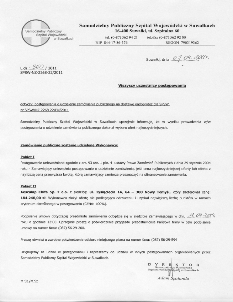 SamodzielnyPubliczny Szpital Wojew6dzki w Suwalkach Publiczny $amod?ielny Szpitalwojew6drki w Suwalkach 16-400Suwalki,ul. Szpitalna60 tel.(0-87)56294 21 NrP 844-17-86-376 tel./fax(0-87)56292 00 REGON 790319362 Suwalki, dnia'9.f..oQ-4ct/tn. t.az'..36Q. I zorr sPsw-NZ-2258-22/2011 Wszvscv uczestnicv Dostepowania publicznego dotvczv:postqpowania o udzielenie zamowienia na dostaweendoprotez dla SPSW nr SPSW/NZ-2268-22/PN/2011 SamodzielnyPublicznySzpital Wojew6dzkiw Suwalkachuprzejmieinformuje, 2e w wyniku prowadzeniaW/w postepowania publicznego o udzielenie zam6wienia dokonalrvyboruofert najkozystniejszych. Zam6wienie oubliczne zostanie udzielone Wvkonawcv: Pakiet I Postepowanie uniewainione zgodniez art.93 ust. 1 pK. 4 ustawyPrawoZam6wiefPublicznych z dnia29 stycznia2004 jesli cenanajkorzystniejszej postQpowanie roku ZamawiajEcy uniewa2nia o udzielenie zamowienia, oferty lub ofertaz pneznaczyina sfinansowanie najnizszA kwote,K6ra zamawiajacy zamitetza cenaprzewyzsza zam6wienia. Pakiet II Aescufap Chifa Sp. z o.o. z siedziba:ul. Tysiaclecia L4, 64 - 300 Nowy Tomy6l, kt6ry zaoferowalcene: 184.248,00 zl. Wykonawcazlozylofertq nie podlegajqca odrzuceniui uzyskalnajwiekszA liczbepunK6ww ramach (CENA:100o/o). kryteriumokreslonego w postepowaniu Podpisanie umowydotyczacejprzedmiotuzamowienia odbedziesiQw siedzibiezamawiajqcego * oniu.'.|4.Q4.,4.Q.//n przyjazduprzedstawiciela roku o godzinie12:00.UprzejmieproszQo potwierdzenie Paistwafirmy w celu podpisania umolvyna numerfaxu: (087)56-29-200. pismana numerfaxu:(087)56-29-594 Proszer6wnie2o zwrotnepotwierdzenie odbioruniniejszego pnez Dziekujemyza udzial w postepowaniui zapraszamydo udzialuw innych postepowaniach organizowanych Publiczny Samodzielny SzpitalWojewodzki w Suwalkach. D Y F r J n t o * ".",*::T,:3'"Tiryffi"r.a lvl.Sz./M.Sz Adant Sgalanda