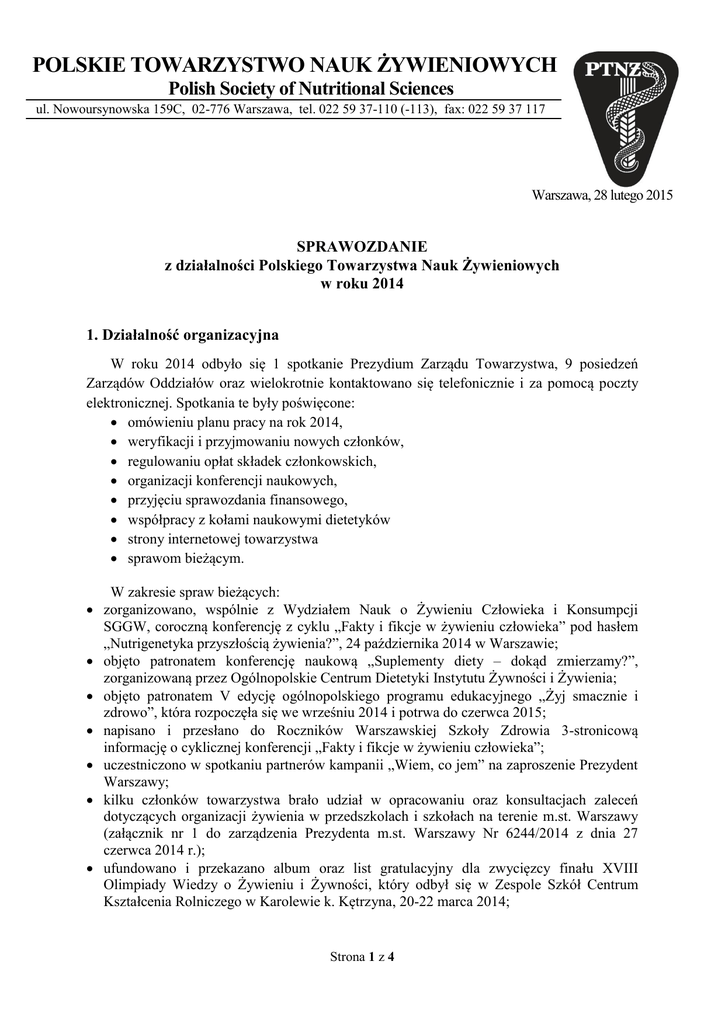POLSKIE TOWARZYSTWO NAUK ŻYWIENIOWYCH Polish Society of Nutritional Sciences ul. Nowoursynowska 159C, 02-776 Warszawa, tel. 022 59 37-110 (-113), fax: 022 59 37 117 Warszawa, 28 lutego 2015 SPRAWOZDANIE z działalności Polskiego Towarzystwa Nauk Żywieniowych w roku 2014 1. Działalność organizacyjna W roku 2014 odbyło się 1 spotkanie Prezydium Zarządu Towarzystwa, 9 posiedzeń Zarządów Oddziałów oraz wielokrotnie kontaktowano się telefonicznie i za pomocą poczty elektronicznej. Spotkania te były poświęcone: omówieniu planu pracy na rok 2014, weryfikacji i przyjmowaniu nowych członków, regulowaniu opłat składek członkowskich, organizacji konferencji naukowych, przyjęciu sprawozdania finansowego, współpracy z kołami naukowymi dietetyków strony internetowej towarzystwa sprawom bieżącym. W zakresie spraw bieżących: zorganizowano, wspólnie z Wydziałem Nauk o Żywieniu Człowieka i Konsumpcji SGGW, coroczną konferencję z cyklu „Fakty i fikcje w żywieniu człowieka” pod hasłem „Nutrigenetyka przyszłością żywienia?”, 24 października 2014 w Warszawie; objęto patronatem konferencję naukową „Suplementy diety – dokąd zmierzamy?”, zorganizowaną przez Ogólnopolskie Centrum Dietetyki Instytutu Żywności i Żywienia; objęto patronatem V edycję ogólnopolskiego programu edukacyjnego „Żyj smacznie i zdrowo”, która rozpoczęła się we wrześniu 2014 i potrwa do czerwca 2015; napisano i przesłano do Roczników Warszawskiej Szkoły Zdrowia 3-stronicową informację o cyklicznej konferencji „Fakty i fikcje w żywieniu człowieka”; uczestniczono w spotkaniu partnerów kampanii „Wiem, co jem” na zaproszenie Prezydent Warszawy; kilku członków towarzystwa brało udział w opracowaniu oraz konsultacjach zaleceń dotyczących organizacji żywienia w przedszkolach i szkołach na terenie m.st. Warszawy (załącznik nr 1 do zarządzenia Prezydenta m.st. Warszawy Nr 6244/2014 z dnia 27 czerwca 2014 r.); ufundowano i przekazano album oraz list gratulacyjny dla zwycięzcy finału XVIII Olimpiady Wiedzy o Żywieniu i Żywności, który odbył się w Zespole Szkół Centrum Kształcenia Rolniczego w Karolewie k. Kętrzyna, 20-22 marca 2014; Strona 1 z 4 wystąpiono z wnioskiem do Ministra Nauki o dofinansowanie cyklicznej konferencji w roku 2014, tj. Fakty i fikcje w żywieniu człowieka”, które uzyskano; przygotowano i przesłano do Ministerstwa Nauki i Szkolnictwa Wyższego raport z realizacji konferencji z cyklu „Fakty i fikcje w żywieniu człowieka”; zapłacono składkę członkowską z racji przynależności do organizacji międzynarodowej FENS (Federation of European Nutrition Societies); aktualizowano stronę internetową towarzystwa, zamieszczając m. in. informacje o wydarzeniach naukowych – krajowych i międzynarodowych, o Laureatce Nagrody im. prof. Aleksandra Szczygła itp.; przyjęto w poczet członków 6 osób. Członkowie oddziałów aktywnie uczestniczyli w organizacji kolejnej XVIII edycji Olimpiady Wiedzy o Żywieniu i Żywności, w eliminacjach Olimpiady Wiedzy i Umiejętności Rolniczych oraz Festiwalu Nauki. 2. Działalność naukowa Oddziały Towarzystwa zorganizowały w sumie 10 zebrań naukowych, a ich tematyka w roku 2014 była następująca: pieczywo i jego technologie w XXI wieku, wpływ odżywiania na zdrowie, wpływ procesów przetwarzania żywności (np. fermentacja) na jej właściwości prozdrowotne, zasady żywienia w anoreksji, żywienie osób starszych, żywienie w warunkach stresu oksydacyjnego, metabolizm grup jednowęglowych – o genach, żywieniu i zdrowiu metabolicznym, czy żywność regionalna jest lepsza od tradycyjnej? uwarunkowania żywieniowe niepłodności kobiet i mężczyzn, długowieczność – czy żywność i żywienie może być naszą szansą? znaczenie fitosteroli roślinnych w żywieniu człowieka Ponadto członkowie oddziałów brali aktywny udział w różnych konferencjach naukowych, wygłaszając referaty. 3. Działalność popularyzatorska W roku 2014 członkowie Polskiego Towarzystwa Nauk Żywieniowych prowadzili szeroką działalność popularyzatorską: organizowano i prowadzono wykłady i warsztaty z zakresu edukacji i profilaktyki żywieniowej (dla słuchaczy Wszechnicy Żywieniowej SGGW, lekarzy z Polskiego Towarzystwa Ginekologicznego, mieszkańców województwa warmińsko-mazurskiego, dyrektorów i intendentów szkół, pracowników ośrodków pomocy społecznej, dzieci i młodzieży) – Oddział Gdańsko-Olsztyński, wygłoszono wykłady dla Polskiego Towarzystwa Dietetyki i Sądeckiego Uniwersytetu Trzeciego Wieku (Oddział Krakowski), Strona 2 z 4 przygotowano i wygłoszono wykłady dla uczniów gimnazjum w Białymstoku, podczas konferencji w Wyższej Szkole Zawodowej Ochrony Zdrowia TWP w Łomży oraz podczas spotkania Towarzystwa Przyjaciół Ziemi Łomżyńskiej (Oddział Białostocki), prowadzono warsztaty dla Ogólnopolskiego Zespołu Sekcji Studenckich Polskiego Towarzystwa Farmaceutycznego „Młoda Farmacja” (Oddział Krakowski) prowadzono szkolenia dla dietetyków nt. zaleceń żywieniowych w schorzeniach tarczycy (Oddział Krakowski) brano udział w eliminacjach okręgowych i centralnych Olimpiady Wiedzy o Żywieniu i Żywności oraz w eliminacjach Olimpiady Wiedzy i Umiejętności Rolniczych (Oddział Poznański, Gdańsko-Olsztyński i Warszawski), prowadzono wykłady z zakresu zasad prawidłowego żywienia (Uniwersytet III Wieku, Wszechnica Żywieniowa, Olimpiady Wiedzy o Żywieniu, szkoły podstawowe i gimnazjalne, ośrodki metodyczne dla nauczycieli, SANEPID w Ciechanowie, Ostrowi Mazowieckiej, Rawie Mazowieckiej i Łowiczu (Oddział Warszawski), prowadzono poradnictwo żywieniowe dla różnych grup populacyjnych (np. dzieci, rodzice, opiekunowie, nauczyciele, ludzie starsi, osoby otyłe), współpracowano ze świętokrzyskim portalem internetowym e-vive – wywiady, artykuły na temat zasad prawidłowego żywienia różnych grup populacyjny