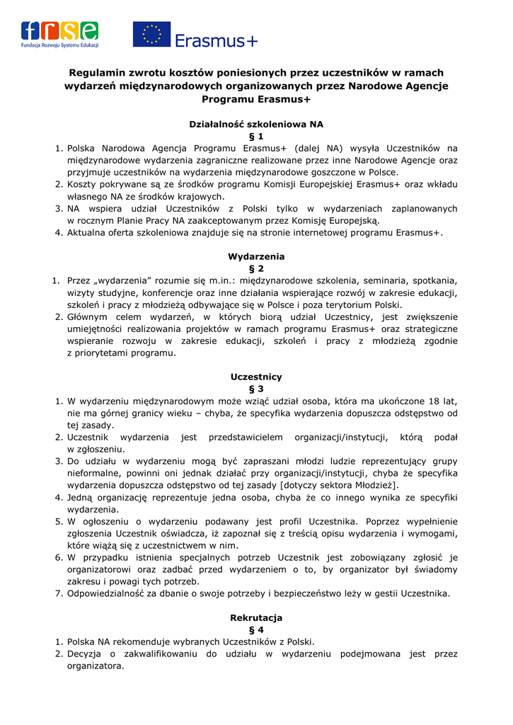 Regulamin zwrotu kosztów poniesionych przez uczestników w ramach wydarzeń międzynarodowych organizowanych przez Narodowe Agencje Programu Erasmus+ 1. 2. 3. 4. Działalność szkoleniowa NA §1 Polska Narodowa Agencja Programu Erasmus+ (dalej NA) wysyła Uczestników na międzynarodowe wydarzenia zagraniczne realizowane przez inne Narodowe Agencje oraz przyjmuje uczestników na wydarzenia międzynarodowe goszczone w Polsce. Koszty pokrywane są ze środków programu Komisji Europejskiej Erasmus+ oraz wkładu własnego NA ze środków krajowych. NA wspiera udział Uczestników z Polski tylko w wydarzeniach zaplanowanych w rocznym Planie Pracy NA zaakceptowanym przez Komisję Europejską. Aktualna oferta szkoleniowa znajduje się na stronie internetowej programu Erasmus+. Wydarzenia §2 1. Przez „wydarzenia” rozumie się m.in.: międzynarodowe szkolenia, seminaria, spotkania, wizyty studyjne, konferencje oraz inne działania wspierające rozwój w zakresie edukacji, szkoleń i pracy z młodzieżą odbywające się w Polsce i poza terytorium Polski. 2. Głównym celem wydarzeń, w których biorą udział Uczestnicy, jest zwiększenie umiejętności realizowania projektów w ramach programu Erasmus+ oraz strategiczne wspieranie rozwoju w zakresie edukacji, szkoleń i pracy z młodzieżą zgodnie z priorytetami programu. 1. 2. 3. 4. 5. 6. 7. Uczestnicy §3 W wydarzeniu międzynarodowym może wziąć udział osoba, która ma ukończone 18 lat, nie ma górnej granicy wieku – chyba, że specyfika wydarzenia dopuszcza odstępstwo od tej zasady. Uczestnik wydarzenia jest przedstawicielem organizacji/instytucji, którą podał w zgłoszeniu. Do udziału w wydarzeniu mogą być zapraszani młodzi ludzie reprezentujący grupy nieformalne, powinni oni jednak działać przy organizacji/instytucji, chyba że specyfika wydarzenia dopuszcza odstępstwo od tej zasady [dotyczy sektora Młodzież]. Jedną organizację reprezentuje jedna osoba, chyba że co innego wynika ze specyfiki wydarzenia. W ogłoszeniu o wydarzeniu podawany jest profil Uczestnika. Poprzez wypełnienie zgłoszenia Uczestnik oświadcza, iż zapoznał się z treścią opisu wydarzenia i wymogami, które wiążą się z uczestnictwem w nim. W przypadku istnienia specjalnych potrzeb Uczestnik jest zobowiązany zgłosić je organizatorowi oraz zadbać przed wydarzeniem o to, by organizator był świadomy zakresu i powagi tych potrzeb. Odpowiedzialność za dbanie o swoje potrzeby i bezpieczeństwo leży w gestii Uczestnika. Rekrutacja §4 1. Polska NA rekomenduje wybranych Uczestników z Polski. 2. Decyzja o zakwalifikowaniu do udziału w wydarzeniu organizatora. podejmowana jest przez 3. Rekrutacja odbywa się z wykorzystaniem formularza dostępnego jako formularz zgłoszeniowy. 4. Selekcja Uczestników odbywa się na podstawie informacji zawartych w formularzu zgłoszeniowym przesłanym przed upływem terminu zgłoszeń. Nie są przyjmowane CV ani listy motywacyjne. 5. Pierwszeństwo podczas rekrutacji Uczestników mają osoby, które jeszcze nie brały udziału w wydarzeniach międzynarodowych oraz te, które są reprezentantami organizacji o profilu najbardziej adekwatnym do tematyki wydarzenia. 6. Uczestnik, który zostanie zakwalifikowany do udziału w wydarzeniu w ciągu 7 dni od daty wysłania zawiadomienia o zakwalifikowaniu potwierdza mailem zwrotnym zapozanie się z regulaminem oraz przyjęcie go do stosowania. 1. 2. 3. 4. 5. 1. 2. 3. 4. Koszty §5 Koszty związane z udziałem Uczestnika w wydarzeniu, takie jak koszty trenerów, zakwaterowania i wyżywienia w dniach wydarzenia pokrywają organizatorzy, chyba że specyfika wydarzenia określa inaczej. Zakwalifikowany Uczestnik z Polski zobowiązany jest do samodzielnego zakupu biletów oraz opłacenia kosztów podróży z miejsca zamieszkania do miejsca realizacji wydarzenia i z powrotem. W przypadku uczestników z zagranicy, za których koszty podróży odpowiada Polska NA, bilety międzynarodowe kupowane są przez Polską NA, dodatkowe koszty związane z podróżą zwracane są na miejscu lub przelewem na podstawie biletów i faktur/rachunków. Uczestnik jest zobowiązany do wyboru najtańszej opcji przejazdu (bilety II klasy lub klasy ekonomicznej w środkach komunikacji publicznej, takich jak: samolot, pociąg, autobus, etc.) umożliwiającej udział w wydarzeniu w podanych przez organizatora dniach i godzinach. Koszty podróży zostaną zwrócone Uczestnikom przez Polską NA do wysokości 2100 PLN lub 500 EUR po zakończeniu spotkania i przekazaniu formularza zwrotu kosztów wraz z oryginałami biletów na adres FRSE ul. Mokotowska 43, 00-551 Warszawa (z dopiskiem TCA – edukacja szkolna / kształcenie i szkolenie zawodowe / edukacja dorosłych / Młodzież). Jeśli na biletach nie widać ceny należy załączyć rachunek lub fakturę wystawioną na pasażera. Uczestnicy z Polski są zobowiązani dostarczyć również podpisane sprawozdanie. Jeśli podróż odbywa się na terenie Polski to limitem wysokości kosztów jest 600 PLN. Uczestnik zobowiązany jest do ubezpieczenia się na czas podróży i pobytu zagranicą we własnym zakresie. Zwrot kosztów §6 Koszty podróży oraz koszty wizy (jeśli dotyczy) zwracane są pod warunkiem uczestniczenia w całości wydarzenia. Zwrot kosztów podróży oraz koszt wizy (jeśli dotyczy) dokonywany jest w przeciągu 2 tygodni od daty otrzymania przez NA podpisanego sprawozdania oraz kompletnych dokumentów wymaganych do rozliczenia kosztów. Zwrotowi nie podlegają koszty przejazdu taksówką, samochodem oraz koszty dodatkowych noclegów, poza uzasadnionymi przypadkami. Dla uznania tych kosztów wymagana jest każdorazowo zgoda NA. Nie są zwracane koszty podróży, które nie są bezpośrednio związane z dojazdem na miejsce wydarzenia i powrotem do miejsca zamieszkania. Podróż powinna nastąpić najwcześniej dzień przed terminem rozpoczęcia wydarzenia a powrót najpóźniej dzień po jego zakończeniu, poza uzasadniony