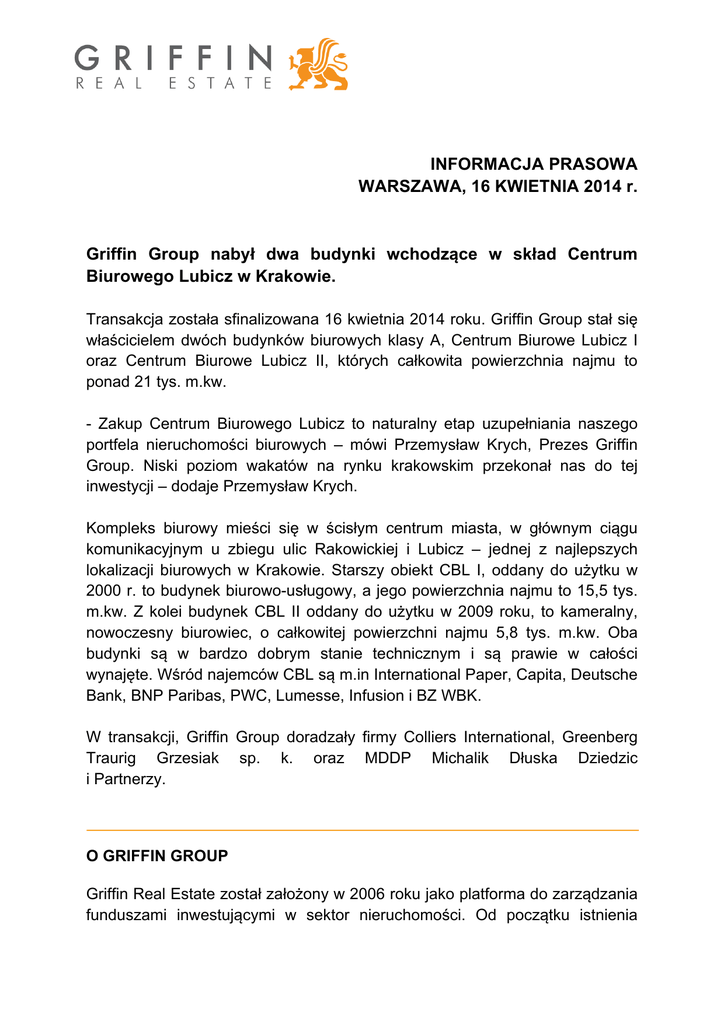 INFORMACJA PRASOWA WARSZAWA, 16 KWIETNIA 2014 r. Griffin Group nabył dwa budynki wchodzące w skład Centrum Biurowego Lubicz w Krakowie. Transakcja została sfinalizowana 16 kwietnia 2014 roku. Griffin Group stał się właścicielem dwóch budynków biurowych klasy A, Centrum Biurowe Lubicz I oraz Centrum Biurowe Lubicz II, których całkowita powierzchnia najmu to ponad 21 tys. m.kw. - Zakup Centrum Biurowego Lubicz to naturalny etap uzupełniania naszego portfela nieruchomości biurowych – mówi Przemysław Krych, Prezes Griffin Group. Niski poziom wakatów na rynku krakowskim przekonał nas do tej inwestycji – dodaje Przemysław Krych. Kompleks biurowy mieści się w ścisłym centrum miasta, w głównym ciągu komunikacyjnym u zbiegu ulic Rakowickiej i Lubicz – jednej z najlepszych lokalizacji biurowych w Krakowie. Starszy obiekt CBL I, oddany do użytku w 2000 r. to budynek biurowo-usługowy, a jego powierzchnia najmu to 15,5 tys. m.kw. Z kolei budynek CBL II oddany do użytku w 2009 roku, to kameralny, nowoczesny biurowiec, o całkowitej powierzchni najmu 5,8 tys. m.kw. Oba budynki są w bardzo dobrym stanie technicznym i są prawie w całości wynajęte. Wśród najemców CBL są m.in International Paper, Capita, Deutsche Bank, BNP Paribas, PWC, Lumesse, Infusion i BZ WBK. W transakcji, Griffin Group doradzały firmy Colliers International, Greenberg Traurig Grzesiak sp. k. oraz MDDP Michalik Dłuska Dziedzic i Partnerzy. O GRIFFIN GROUP Griffin Real Estate został założony w 2006 roku jako platforma do zarządzania funduszami inwestującymi w sektor nieruchomości. Od początku istnienia inwestuje w nie także swój własny kapitał. W marcu 2013 roku Griffin pozyskał inwestora strategicznego – Oaktree Capital Management, z którym współpracuje od 2010 roku. Oaktree jest funduszem hedgingowym wywodzącym się z USA. Posiada biura na całym świecie, zatrudnia ponad 650 osób oraz zarządza środkami w wysokości prawie 90 miliardów dolarów. Griffin to wiodący inwestor na polskim rynku nieruchomości, który w imieniu zarządzanych przez siebie Funduszy, aktywnie lokuje środki w prestiżowe projekty. Celem strategicznym jest zbudowanie w ciągu kilku lat unikatowego portfela nieruchomości. W portfolio grupy Griffin znajduje się obecnie m.in. Hala Koszyki w Warszawie, Dom Handlowy Renoma we Wrocławiu, Supersam w Katowicach oraz inne obiekty biurowe i handlowe, a także działki inwestycyjne. Griffin wspiera liczne inicjatywy, w tym Fundację Edukacyjną Jana Karskiego. W obiektach należących do Funduszy zarządzanych przez Griffin realizowane są również projekty artystyczne, inicjowane przez Griffin Art Space, instytucję powołaną przez Griffin, aby wspierać sztukę i promować jej obecność w przestrzeni publicznej.