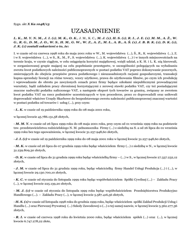 Sygn. akt X Ka 1048/13 UZASADNIENIE L. K., M. Y. N. M., J. I. (1), M. K., O. K., J. M., K. C., M. J. (1), H. S. (1), R. I., J. E. (1), M. M., A. Ż., W. G., R. G., D. M., J. O., W. S., H. M., G. W., W. Z., A. Z., M. Ł., A. B., A. Ś. (1), J. B. B. K. (1), D. K. (1), J. K. (1) zostali oskarżeni o to, że: I. w czasie od 02 czerwca 1998 roku do maja 2001 roku w W., M. województwa (...), Ś., R., K. województwa (...), Z. i w S. województwa (...), w S., R., M., P., S. województwa (...), K. województwa (...) i w innych miejscowościach na terenie kraju, w czynie ciągłym, w celu osiągnięcia korzyści majątkowej, wzięli udział, a K. H. i L. K. nią kierowali, w zorganizowanej grupie mającej na celu popełnianie przestępstw, w szczególności polegających na wyłudzaniu zwrotu kwot podatkowych należności publicznoprawnych w postaci podatku VAT poprzez dokonywanie pozornych, zmierzających do obejścia przepisów prawa podatkowego i nieuzasadnionych racjami gospodarczymi, transakcji kupna-sprzedaży licencji na różne towary, wzory użytkowe, prawa do użytkowania filmów, po czym ich produkcję i wprowadzanie do obrotu po zawyżonych cenach przez firmy będące szkołami niepublicznymi prowadzącymi warsztaty, bądź zakładem pracy chronionej korzystającymi z zerowej stawki podatku VAT, czy też posiadającymi znaczne nadwyżki podatku naliczonego VAT, a następnie eksport tych towarów za granicę, związany ze zwrotem kwot podatku VAT na rzecz podmiotów uczestniczących w tym procederze, przez co doprowadzili oraz usiłowali doprowadzić właściwe Urzędy Skarbowe do bezpodstawnego zwrotu należności publicznoprawnej znacznej wartości w postaci podatku od towarów i usług (...), przy czym: - L. K. w czasie od 19 października 1999 roku do 08 maja 2001 roku, w łącznej kwocie 45.786.131,58 złotych, - M. M. Y. w czasie od 26 lipca 1999 roku do 08 maja 2001 roku, przy czym od 01 września 1999 roku na podstawie tzw. przedstawicielstwa rodzicielskiego N. M. pełnomocnika Firmy (...) z siedzibą na S. a od 26 lipca do 01 września 1999 roku bez tego upoważnienia, w łącznej kwocie 31.257.948,60 złotych, - J. I. (1) w czasie od 19 października 1999 roku do 08 maja 2001 roku w łącznej kwocie 31.257.948,60 złotych, - M. K. w czasie od 26 lipca do 07 grudnia 1999 roku będąc właścicielem firmy (...) z siedzibą w N., w łącznej kwocie 31.239.809,30 złotych, - O. K. w czasie od lipca do 31 grudnia 1999 roku będąc właścicielką firmy – (...) w S., w łącznej kwocie 27.337.232,12 złotych, - J. M. w czasie od lipca do 31 grudnia 1999 roku, będąc właścicielką firmy Handel Usługi Produkcja (...) i (...), w łącznej kwocie 29.130.700,10 złotych, - K. C. w czasie od stycznia do listopada 1999 roku będąc współwłaścicielem Spółki Cywilnej (...) – Zakładu Pracy (...), w łącznej kwocie 225.139,20 złotych, - M. J. (1) w czasie od stycznia do listopada 1999 roku będąc współwłaścicielem Przedsiębiorstwa Produkcyjno Handlowego (...). – Zakładu Pracy (...), w łącznej kwocie 5.587.416,56 złotych, - H. S. (1) w czasie od listopada 1998 roku do grudnia 1999 roku, będąc właścicielem spółki Zakład Produkcji Usług i Handlu (...) oraz Pierwszej Prywatnej (...) Szkoły Zawodowej o (...) o tej samej nazwie, w łącznej kwocie 5.362.277,36 złotych, - R. I. w czasie od czerwca 1998 roku do kwietnia 2000 roku, będąc właścicielem spółek (...) oraz (...), w łącznej kwocie 6.747.278,22 złote, - J. E. (1) w czasie od 02 listopada 1998 roku do maja 2001 roku, będąc wspólnikiem spółki cywilnej (...), Prezesem Zarządu spółek (...) i (...), w łącznej kwocie 3.606.074,60 złotych; - M. M. w czasie od 02 czerwca do 27 października 1998 roku, jako właścicielka firmy (...), w łącznej kwocie 2.325.526 złotych, - A. Ż. w czasie od 21 czerwca do grudnia 1999 roku, będąc właścicielem spółki z o.o. (...) i jednocześnie członkiem jej Zarządu, oraz właścicielem spółki z o.o. (...) i jednocześnie jej Prezesem Zarządu następnie zaś sekretarz Zarządu, w łącznej kwocie 559.659,20 złotych, - W. G. w czasie od 21 czerwca do grudnia 1999 roku, będąc członkiem Zarządu spółek z o.o. (...) i (...), w łącznej kwocie 559.659,20 złotych, - J. O. w czasie 15 maja 1998 roku do 03 sierpnia 1999 roku, będąc właścicielką firmy PPHU (...) oraz PHU (...), w łącznej kwocie 5.381.223 złote, - H. M. w czasie od 02 października 1999 roku do marca 2000 roku, będąc właścicielką firmy (...), w łącznej kwocie 2.557.327 złotych, - G. W. w czasie od lipca 1998 roku do grudnia 1999 roku, będąc współwłaścicielem spółki cywilnej (...) w łącznej kwocie 709.016 złotych, - W. Z. w czasie od 15 listopada 1999 roku do lutego 2000 roku, jako właściciel firmy Z- (...) oraz dyrektor handlowy w spółce (...), w łącznej kwocie 48.044,70 złotych, - A. Z. w czasie od 19 kwietnia do 26 września 2000 roku, jako właściciel firmy (...), w łącznej kwocie 441.601,60 złotych, - M. Ł. w czasie od marca do maja 2001 roku, jako właścicielka i jednocześnie Prezes Zarządu spółki z o.o. (...), w łącznej kwocie 1.487.420 złotych, - A. B. w czasie od kwietnia do maja 2001 roku, jako właściciel firmy (...), Handel (...), w łącznej kwocie 873.300 złotych, - A. Ś. (1) w czasie od kwietnia do maja 2001 roku, jako właściciel firmy (...), w łącznej kwocie 614.020 złotych, tj. o przestępstwo z art. 258 § 1 kk, a wobec K. H. i L. K. o przestępstwo z art. 258 § 1 i 3 kk, a nadto: L. K. został oskarżony o to, że: II w czasie i w miejscu jak w pkt. I-szym, działając wspólnie i w porozumieniu z innymi ustalonymi osobami w ramach zorganizowanej grupy przestępczej opisanej w pkt. I-szym, ze z góry powziętym zamiarem i w celu osiągnięcia korzyści majątkowej, nakłaniał N. M. Y. jako przedstawiciela firmy (...) z siedzibą na S., do zawierania ze wskazanymi przez siebie i innych członków grupy wymi