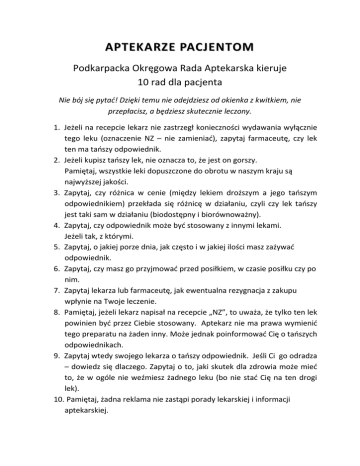 A P T E K A R Z E PA C J E N T O M Podkarpacka Okręgowa Rada Aptekarska kieruje 10 rad dla pacjenta Nie bój się pytać! Dzięki temu nie odejdziesz od okienka z kwitkiem, nie przepłacisz, a będziesz skutecznie leczony. 1. Jeżeli na recepcie lekarz nie zastrzegł konieczności wydawania wyłącznie tego leku (oznaczenie NZ – nie zamieniać), zapytaj farmaceutę, czy lek ten ma tańszy odpowiednik. 2. Jeżeli kupisz tańszy lek, nie oznacza to, że jest on gorszy. Pamiętaj, wszystkie leki dopuszczone do obrotu w naszym kraju są najwyższej jakości. 3. Zapytaj, czy różnica w cenie (między lekiem droższym a jego tańszym odpowiednikiem) przekłada się różnicę w działaniu, czyli czy lek tańszy jest taki sam w działaniu (biodostępny i biorównoważny). 4. Zapytaj, czy odpowiednik może być stosowany z innymi lekami. Jeżeli tak, z którymi. 5. Zapytaj, o jakiej porze dnia, jak często i w jakiej ilości masz zażywać odpowiednik. 6. Zapytaj, czy masz go przyjmować przed posiłkiem, w czasie posiłku czy po nim. 7. Zapytaj lekarza lub farmaceutę, jak ewentualna rezygnacja z zakupu wpłynie na Twoje leczenie. 8. Pamiętaj, jeżeli lekarz napisał na recepcie „NZ”, to uważa, że tylko ten lek powinien być przez Ciebie stosowany. Aptekarz nie ma prawa wymienić tego preparatu na żaden inny. Może jednak poinformować Cię o tańszych odpowiednikach. 9. Zapytaj wtedy swojego lekarza o tańszy odpowiednik. Jeśli Ci go odradza – dowiedz się dlaczego. Zapytaj o to, jaki skutek dla zdrowia może mieć to, że w ogóle nie weźmiesz żadnego leku (bo nie stać Cię na ten drogi lek). 10. Pamiętaj, żadna reklama nie zastąpi porady lekarskiej i informacji aptekarskiej.