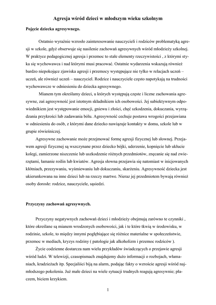 Agresja wśród dzieci w młodszym wieku szkolnym Pojęcie dziecka agresywnego. Ostatnio wyraźnie wzrosło zainteresowanie nauczycieli i rodziców problematyką agresji w szkole, gdyż obserwuje się nasilenie zachowań agresywnych wśród młodzieży szkolnej. W praktyce pedagogicznej agresja i przemoc to stałe elementy rzeczywistości , z którymi styka się wychowawca i nad którymi musi pracować. Ostatnie wydarzenia wskazują również bardzo niepokojące zjawiska agresji i przemocy występujące nie tylko w relacjach uczeń – uczeń, ale również uczeń – nauczyciel. Rodzice i nauczyciele często napotykają na trudności wychowawcze w odniesieniu do dziecka agresywnego. Mianem tym określamy dzieci, u których występują częste i liczne zachowania agresywne, zaś agresywność jest istotnym składnikiem ich osobowości. Jej subiektywnym odpowiednikiem jest występowanie emocji, gniewu i złości, chęć szkodzenia, dokuczania, wyrządzania przykrości lub zadawania bólu. Agresywność cechuje postawa wrogości przejawiana w odniesieniu do osób, z którymi dane dziecko nawiązuje kontakty w domu, szkole lub w grupie rówieśniczej. Agresywne zachowanie może przejmować formę agresji fizycznej lub słownej. Przejawem agresji fizycznej są wszczynane przez dziecko bójki, uderzenie, kopnięcie lub ukłucie kolegi, zamierzone niszczenie lub uszkodzenie różnych przedmiotów, znęcanie się nad zwierzętami, łamanie roślin lub kwiatów. Agresja słowna przejawia się natomiast w inicjowanych kłótniach, przezywaniu, wyśmiewaniu lub dokuczaniu, skarżeniu. Agresywność dziecka jest ukierunkowana na inne dzieci lub na rzeczy martwe. Nieraz jej przedmiotem bywają również osoby dorosłe: rodzice, nauczyciele, sąsiedzi. Przyczyny zachowań agresywnych. Przyczyny negatywnych zachowań dzieci i młodzieży obejmują zarówno te czynniki , które określane są mianem wrodzonych osobowości, jak i te które tkwią w środowisku, w rodzinie, szkole, to między innymi pogłębiające się różnice materialne w społeczeństwie, przemoc w mediach, kryzys rodziny ( patologie jak alkoholizm i przemoc rodziców ). Życie codzienne dostarcza nam wielu przykładów świadczących o przejawie agresji wśród ludzi. W telewizji, czasopismach znajdujemy dużo informacji o rozbojach, włamaniach, kradzieżach itp. Specjaliści biją na alarm, podając fakty o wzroście agresji wśród najmłodszego pokolenia. Już małe dzieci na wiele sytuacji trudnych reagują agresywnie; płaczem, biciem krzykiem. 1 Agresja pojawia się w sposób gwałtowny i bezpośredni, często występuje z niechęcią do nauki. Coraz częściej dorośli, rodzice, nauczyciele, mimo usilnych zabiegów, nie potrafią poradzić sobie ze wzrastającą agresją. Świat, w którym żyjemy, bardzo często stawia nas w sytuacji, w której czujemy się niepewnie, jesteśmy rozczarowani. Nie zawsze możemy zaspokoić potrzeby swoje i najbliższych. Rodzice starają się stworzyć dzieciom jak najlepsze warunki, w których mogłyby przeżyć beztroskie dzieciństwo. Chronią więc swoje pociechy przed wszystkimi złymi doświadczeniami, zaspokajają potrzeby, ale też i zachcianki. Nie chcą, by ich dziecko było gorsze od innych. Taka postawa rodziców może przynieść skutki odwrotne do zamierzonych. Jeśli wychowanie ograniczy się tylko do zaspokajania potrzeb materialnych, to między dzieckiem i rodzicami nie rozwija się więź i porozumienie. Chociaż dziecku niczego nie brakuje, rolę wychowawcy przejmuje telewizor lub komputer. Ogromnie ważna jest tu mądra miłość rodzicielska w rozumieniu i zaspokajaniu potrzeb dziecka. Akceptacja i poszanowanie praw dziecka w znacznym stopniu niwelują pojawiające się negatywne formy zachowania. Nadmierna swoboda, podobnie jak i nadmierna kontrola mogą wyzwalać u dziecka niepożądane formy zachowania. Wyróżnianie jednego dziecka w rodzinie, a także nadmierne przekonywanie o zawsze nienagannym zachowaniu swoich dzieci powoduje ich zadufanie i chęć wykorzystania tej uprzywilejowanej pozycji w kręgu kolegów. W systemie wzmocnień pozytywnych powinny decydować nagrody stosowane w miarę często, ale też nie każde zachowanie. Kara fizyczna rodzi agresję. Rodzice powinni zapewnić dziecku potrzebę bliskiego kontaktu. Obydwoje są dla dziecka jednakowo ważni i potrzebni. Dzieci przejawiające agresję powinny być kontrolowane i otoczone szczególną opieką przez rodziców, wychowawcę klasy czy pedagoga szkolnego. Inną przyczyną agresji wśród dzieci jest bieda. Złe warunki materialne rodziny, uniemożliwiające zaspokajanie potrzeb i pragnień dziecka, powodują reakcję obronną w postaci agresji, najczęściej w stosunku do młodszych kolegów. W dalszej kolejności na postawy dzieci, oddziałują środki masowego przekazu, pokazujące okrucieństwo i przemoc. Bezpowrotnie minęły czasy kiedy żyliśmy w przekonaniu, że telewizja jest elementem integrującym rodzinę, że wspólne jej oglądanie umacnia więzi rodzinne, a dziecko przed telewizorem jest bezpieczniejsze niż na ulicy. Telewizję zaczęto postrzegać jako jedną z głównych przyczyn narastającej agresji dzieci. Kolejną przyczyną wywołującą agresję jest posługiwanie się komputerami przez dzieci. Z pewnością komputer przynosi wiele korzyści, jednak gry komputerowe nasycone obrazami destrukcji i przemocy stanowią poważne zagrożenie społeczne. Przy grach dzieci nie tylko oglądają przemoc, ale same ją realizują, a przez to oswajają się z nią i obojętnieją na nią. Niektórzy rodzice mniej lub bardziej świadomie aprobują agresywne zachowania dzieci, traktując je jako formę samoobrony przed wrogim otoczeniem. Przyczyną agresywnego 2 zachowania może być również szkoła, a w szczególności niepowodzenia w nauce. Współczesna szkoła wymaga od dzieci dużej wiedzy, umiejętności radzenia sobie w sytuacjach trudnych, ciągłego poszukiwania nowych rozwiązań