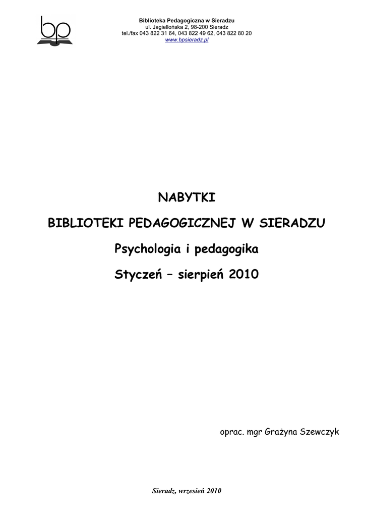 Biblioteka Pedagogiczna w Sieradzu ul. Jagiellońska 2, 98-200 Sieradz tel./fax 043 822 31 64, 043 822 49 62, 043 822 80 20 www.bpsieradz.pl NABYTKI BIBLIOTEKI PEDAGOGICZNEJ W SIERADZU Psychologia i pedagogika Styczeń – sierpień 2010 oprac. mgr GraŜyna Szewczyk Sieradz, wrzesień 2010 Biblioteka Pedagogiczna w Sieradzu ul. Jagiellońska 2, 98-200 Sieradz tel./fax 043 822 31 64, 043 822 49 62, 043 822 80 20 www.bpsieradz.pl 1. CHILES JOHN Depresje nastolatków a narkotyki / John Chiles ; tł. [z ang.] Adam Bujnik. - Warszawa : "Profi", 1994. - 88, [8] s. : fot., il. ; 24 cm. - (Encyklopedia Wiedzy o UzaleŜnieniach) Sygn.: 116708 – 116709 2. COX W. MILES Osobowość nałogowa / W. Miles Cox ; tł. [z ang.] Adam Bujnik. - Warszawa : "Profi", 1995. - 89, [7] s. : fot., rys., wykr. ; 24 cm. - (Encyklopedia Wiedzy o UzaleŜnieniach) Sygn.: 116718 – 116719 3. EKOLOGICZNY projekt w kompetentnej szkole, czyli O szkolnych projektach ochrony lokalnej przyrody realizowanych w ramach Kampanii "Szkoły dla przyrody" / red. Marek Kaczmarzyk. Bystra : "Pracownia na rzecz Wszystkich Istot", cop. 2010. - 95, [9] s. : fot., rys., wykr. ; 25 cm. (Zeszyty Ekologiczne ; 3) Sygn.: 116705 4. FRIEDLAND BRUCE Emocje i myśli / Bruce Friedland ; tł. [z ang.] Adam Bujnik. - Warszawa : "Profi", 1995. - 120, [8] s. : fot., rys., wykr. ; 24 cm.. - (Encyklopedia Wiedzy o UzaleŜnieniach) Sygn.: 116710 – 116711 5. GICZEWSKA ANETA Fenomen dotyku : stymulacja systemu taktylnego i jej wpływ na rozwój psychoruchowy dziecka / Aneta Giczewska. - Środa Śląska : Centrum Aneta Giczewska, cop. 2005. - 119, [1] s. : fot., rys. ; 21 cm. Sygn.: 116762 6. GŁOS narzędziem pracy : poradnik dla nauczycieli / red. Mariola Śliwińska-Kowalska ; Instytut Medycyny Pracy. - Łódź : Oficyna Wydawnicza Instytutu Medycyny Pracy, cop. 1999. - 55, [1] s. : fot. (w tym kolor.), rys. ; 21 cm. Sygn.: 116764 7. KARPOWICZ PAWEŁ Terapia wewnętrznego dziecka : leczenie zranionej duszy / Paweł Karpowicz. - Warszawa : "Eneteia", 2007. - 210, [6] s. : il. ; 21 cm.. - (ŚcieŜki Psychoterapii) Sygn.: 116694 8. KLIM-KLIMASZEWSKA ANNA Pedagogika przedszkolna : nowa podstawa programowa / Anna Klim-Klimaszewska. - Warszawa : Instytut Wydawniczy Erica, 2010. - 376 s. ; 23 cm. Sygn.: 116684-Czyt Sieradz, wrzesień 2010 Biblioteka Pedagogiczna w Sieradzu ul. Jagiellońska 2, 98-200 Sieradz tel./fax 043 822 31 64, 043 822 49 62, 043 822 80 20 www.bpsieradz.pl 9. KNAPP HERSCHEL Komunikacja w terapii / Herschel Knapp ; przeł. [z ang.] Magdalena Trzcińska. - Warszawa : Wydawnictwo Naukowe PWN, 2009. - 272, [2] s. : rys. ; 24 cm.. - (Terapia) Sygn.: 116686 10. KOPIŃSKA VIOLETTA Współczesna młodzieŜ wobec problemu wolności : studium socjologiczno-pedagogiczne / Violetta Kopińska. - Toruń : Wydawnictwo Edukacyjne "Akapit", 2008. - 329, [1] s. ; 24 cm. Sygn.: 116783 11. KOZAK STANISŁAW Patologia eurosieroctwa w Polsce : skutki migracji zarobkowej dla dzieci i ich rodzin / Stanisław Kozak. - Warszawa : "Difin", 2010. - 230, [2] s. : mapki, wykr. ; 23 cm.. - (Engram) Sygn.: 116658 12. KUSZAK KINGA Dziecko samodzielne w szkole : empiryczne studium szkolnych losów dzieci o róŜnym poziomie samodzielności / Kinga Kuszak. - Poznań : Garmond Oficyna Wydawnicza, 2008. - 151, [1] s. : rys., wykr. ; 24 cm. Sygn.: 116649 13. MONITOROWANIE narkotyków i narkomanii na poziomie lokalnym / [red. prow.] Janusz Sierosławski, Bogusława Bukowska, Piotr Jabłoński. - Warszawa : Krajowe Biuro do Spraw Przeciwdziałania Narkomanii, 2007. - 224 s. : rys., wykr. ; 23 cm. Sygn.: 116720 – 116722 14. NOWACKA TERESA Pozytywiści : lektury dla szkół ponadgimnazjalnych / Teresa Nowacka. - Warszawa : "Verbum", 2004. - 224 s. ; 21 cm. - (Streszczenia, problematyka - lektury dla szkół ponadgimnazjalnych) Sygn.: 116678 15. PODRĘCZNIK do monitorowania problemu narkotyków i narkomanii na poziomie lokalnym / [red. prow.] Bogusława Bukowska, Piotr Jabłoński, Janusz Sierosławski. - [Wyd. 2 uzup. i popr.]. - Warszawa : Krajowe Biuro do Spraw Przeciwdziałania Narkomanii, 2008. - 280 s. : rys., wykr. ; 23 cm. + dysk optyczny (CD) Sygn.: 116723 16. PSYCHOTERAPIA tańcem i ruchem : teoria i praktyka w terapii grupowej : praca zbiorowa / red. Zuzanna Pędzik. - Warszawa : Centrum Szkoleniowo-Wydawnicze "Arteer" ElŜbieta Rybicka, cop. 2009. - 144 s. : wykr. ; 21 cm. Sygn.: 116666, 116665-Czyt. Sieradz, wrzesień 2010 Biblioteka Pedagogiczna w Sieradzu ul. Jagiellońska 2, 98-200 Sieradz tel./fax 043 822 31 64, 043 822 49 62, 043 822 80 20 www.bpsieradz.pl 17. SEPOLSKY ROBERT M. Dlaczego zebry nie mają wrzodów? : psychofizjologia stresu / Robert M. Sapolsky ; przeł. [z ang.] Małgorzata Guzowska-Dąbrowska. - Warszawa : Wydawnictwo Naukowe PWN, 2010. - 448, [4] s. : fot., rys., wykr. ; 24 cm.. - (Biblioteka Psychologii Współczesnej) Sygn.: 116685 18. SAWINDA-DZIADECKA KATARZYNA Język polski : Arkadia, kariera, miasto, miłość, rewolucja, teatr świata, władca / Katarzyna Sawinda-Dziadecka, Barbara Sędziak. - Warszawa : Wydawnictwo Langenscheidt Polska, [2008]. - 370, [2] s. ; 24 cm.. - (M jak Matura : Motywy Literackie ; 1) Sygn.: 116671-Czyt. 19. SCHAEFER KLAUS Nauczyciel w szkole : jak przeŜyć szkołę / Klaus Schaefer ; przeł. [z niem.] Joanna Mink. - [Wyd. 2]. Gdańsk ; Sopot : Gdańskie Wydawnictwo Psychologiczne, 2008. - 205, [1] s. : rys., wykr. ; 23 cm. Sygn.: 116650 20. SKUBAŁA PIOTR Zrozumieć przyrodę na nowo : 10 zasad jak uczyć o przyrodzie, by budować motywację do działań ekologicznych / Piotr Skubała, Iwona Kukowka. - Bystra : "Pracownia na rzecz Wszystkich Istot", cop. 2010. - 103, [1] s. : fot. rys., wykr. ; 25 cm.. - (Zeszyty Ekologiczne ; 1) Sygn.: 116703 21. ŚRODOWISKO, młodzieŜ, zdrowie : pedagogiczne i psychologiczne wymiary zagroŜeń Ŝycia i rozwoju młodzieŜy / red. nauk. Jan Adam Malinowski, Aleksander Zandecki ; Uniwersytet Mikołaja Kopernika (Toruń). Studium Pedagogiczne. - Toruń : Wydawnictwo Edukacyjne