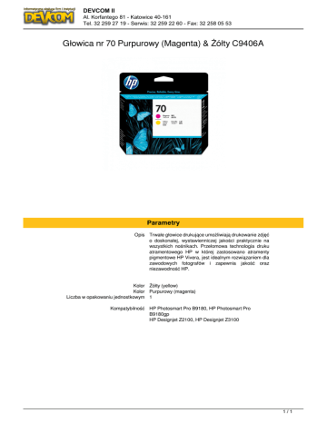 DEVCOM II Al. Korfantego 81 - Katowice 40-161 Tel. 32 259 27 19 - Serwis: 32 259 22 60 - Fax: 32 258 05 53 Głowica nr 70 Purpurowy (Magenta) & Żółty C9406A Parametry Opis Trwałe głowice drukujące umożliwiają drukowanie zdjęć o doskonałej, wystawienniczej jakości praktycznie na wszystkich nośnikach. Przełomowa technologia druku atramentowego HP w której zastosowano atramenty pigmentowe HP Vivera, jest idealnym rozwiązaniem dla zawodowych fotografów i zapewnia jakość oraz niezawodność HP. Kolor Żółty (yellow) Kolor Purpurowy (magenta) Liczba w opakowaniu jednostkowym 1 Kompatybilność HP Photosmart Pro B9180, HP Photosmart Pro B9180gp HP Designjet Z2100, HP Designjet Z3100 1/1 Powered by TCPDF (www.tcpdf.org)