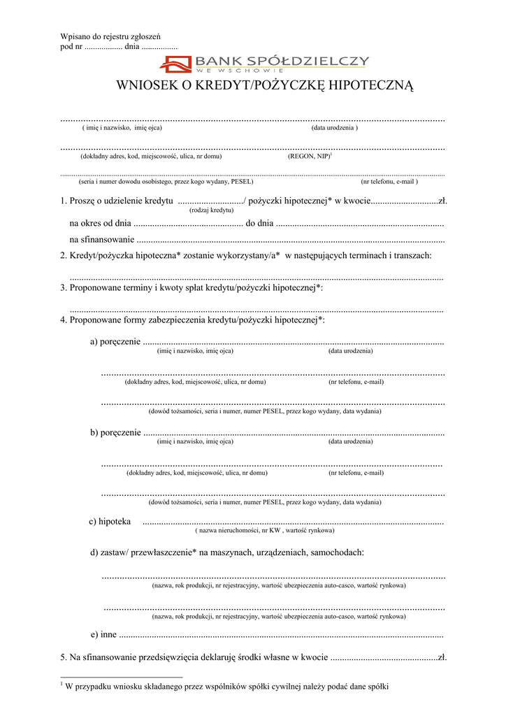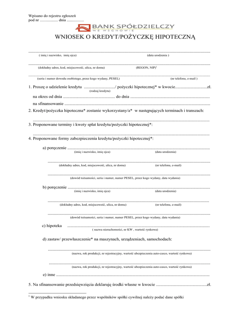 Wpisano do rejestru zgłoszeń pod nr .................. dnia ................. WNIOSEK O KREDYT/POśYCZKĘ HIPOTECZNĄ ....................................................................................................................................................... ( imię i nazwisko, imię ojca) (data urodzenia ) ....................................................................................................................................................... (dokładny adres, kod, miejscowość, ulica, nr domu) (REGON, NIP)1 ......................................................................................................................................................................................................... (seria i numer dowodu osobistego, przez kogo wydany, PESEL) (nr telefonu, e-mail ) 1. Proszę o udzielenie kredytu ............................/ poŜyczki hipotecznej* w kwocie.............................zł. (rodzaj kredytu) na okres od dnia ............................................... do dnia ........................................................................ na sfinansowanie .................................................................................................................................... 2. Kredyt/poŜyczka hipoteczna* zostanie wykorzystany/a* w następujących terminach i transzach: ................................................................................................................................................................ 3. Proponowane terminy i kwoty spłat kredytu/poŜyczki hipotecznej*: ................................................................................................................................................................ 4. Proponowane formy zabezpieczenia kredytu/poŜyczki hipotecznej*: a) poręczenie ................................................................................................................................. (imię i nazwisko, imię ojca) (data urodzenia) ....................................................................................................................................... (dokładny adres, kod, miejscowość, ulica, nr domu) (nr telefonu, e-mail) ....................................................................................................................................... (dowód toŜsamości, seria i numer, numer PESEL, przez kogo wydany, data wydania) b) poręczenie ................................................................................................................................. (imię i nazwisko, imię ojca) (data urodzenia) ...................................................................................................................................... (dokładny adres, kod, miejscowość, ulica, nr domu) (nr telefonu, e-mail) ....................................................................................................................................... (dowód toŜsamości, seria i numer, numer PESEL, przez kogo wydany, data wydania) c) hipoteka ................................................................................................................................. ( nazwa nieruchomości, nr KW , wartość rynkowa) d) zastaw/ przewłaszczenie* na maszynach, urządzeniach, samochodach: ....................................................................................................................................... (nazwa, rok produkcji, nr rejestracyjny, wartość ubezpieczenia auto-casco, wartość rynkowa) ...................................................................................................................................... (nazwa, rok produkcji, nr rejestracyjny, wartość ubezpieczenia auto-casco, wartość rynkowa) e) inne ........................................................................................................................................... 5. Na sfinansowanie przedsięwzięcia deklaruję środki własne w kwocie ..............................................zł. 1 W przypadku wniosku składanego przez wspólników spółki cywilnej naleŜy podać dane spółki 6. Moim źródłem dochodów jest ................................................................................................................ (nazwa zakładu pracy, gospodarstwo rolne ha) ....................................................................................................................................................... 7. Mój średni miesięczny dochód netto z ostatnich 3 m-cy wynosi .......................................................zł. 8. Dane dotyczące podmiotów gospodarczych w działalność których jest Pan(i) zaangaŜowany(a). Nazwa Adres Status prawny Wielkość udziałów w % 9. Zobowiązania wobec banków oraz innych osób prawnych i fizycznych. Bank / wierzyciel (nazwa i adres) Kwota kredytu / zobowiązania 10. Posiadane nieruchomości. Lokalizacja i wykorzystanie oraz nr KW 11. Posiadane pojazdy i maszyny. Marka Rok produkcji Wartość rynkowa 12.WspółmałŜonek wnioskodawcy ............................................................................................................. (imię i nazwisko, imię ojca) (data urodzenia) ..................................................................................................................................................................................... (dokładny adres, kod, miejscowość, ulica, nr domu) ..................................................................................................................................................................................... (dowód toŜsamości, seria i numer, przez kogo wydany, data wydania , numer PESEL, NIP) ..................................................................................................................................................................................... (miejsce zatrudnienia) (dochód miesięczny ne