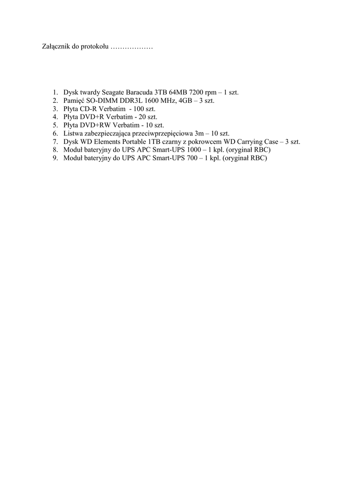 Załącznik do protokołu ……………… 1. 2. 3. 4. 5. 6. 7. 8. 9. Dysk twardy Seagate Baracuda 3TB 64MB 7200 rpm – 1 szt. Pamięć SO-DIMM DDR3L 1600 MHz, 4GB – 3 szt. Płyta CD-R Verbatim - 100 szt. Płyta DVD+R Verbatim - 20 szt. Płyta DVD+RW Verbatim - 10 szt. Listwa zabezpieczająca przeciwprzepięciowa 3m – 10 szt. Dysk WD Elements Portable 1TB czarny z pokrowcem WD Carrying Case – 3 szt. Moduł bateryjny do UPS APC Smart-UPS 1000 – 1 kpl. (oryginał RBC) Moduł bateryjny do UPS APC Smart-UPS 700 – 1 kpl. (oryginał RBC)