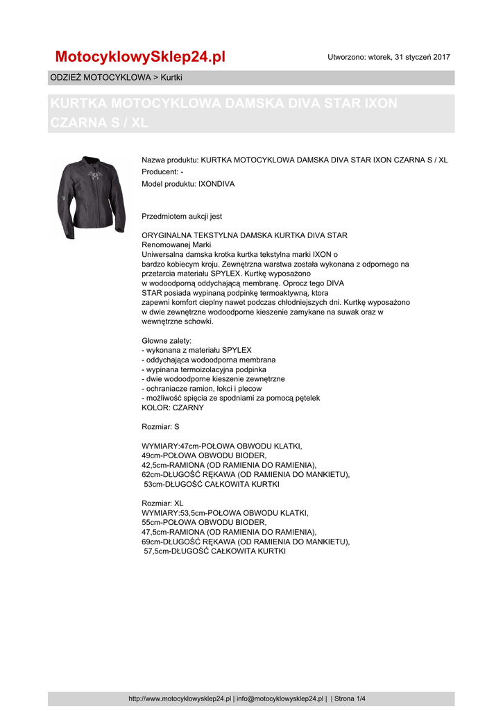 MotocyklowySklep24.pl Utworzono: wtorek, 31 styczeń 2017 ODZIEŻ MOTOCYKLOWA > Kurtki KURTKA MOTOCYKLOWA DAMSKA DIVA STAR IXON CZARNA S / XL Nazwa produktu: KURTKA MOTOCYKLOWA DAMSKA DIVA STAR IXON CZARNA S / XL Producent: Model produktu: IXONDIVA Przedmiotem aukcji jest ORYGINALNA TEKSTYLNA DAMSKA KURTKA DIVA STAR Renomowanej Marki Uniwersalna damska krotka kurtka tekstylna marki IXON o bardzo kobiecym kroju. Zewnętrzna warstwa została wykonana z odpornego na przetarcia materiału SPYLEX. Kurtkę wyposażono w wodoodporną oddychającą membranę. Oprocz tego DIVA STAR posiada wypinaną podpinkę termoaktywną, ktora zapewni komfort cieplny nawet podczas chłodniejszych dni. Kurtkę wyposażono w dwie zewnętrzne wodoodporne kieszenie zamykane na suwak oraz w wewnętrzne schowki. Głowne zalety: - wykonana z materiału SPYLEX - oddychająca wodoodporna membrana - wypinana termoizolacyjna podpinka - dwie wodoodporne kieszenie zewnętrzne - ochraniacze ramion, łokci i plecow - możliwość spięcia ze spodniami za pomocą pętelek KOLOR: CZARNY Rozmiar: S WYMIARY:47cm-POŁOWA OBWODU KLATKI, 49cm-POŁOWA OBWODU BIODER, 42,5cm-RAMIONA (OD RAMIENIA DO RAMIENIA), 62cm-DŁUGOŚĆ RĘKAWA (OD RAMIENIA DO MANKIETU), 53cm-DŁUGOŚĆ CAŁKOWITA KURTKI Rozmiar: XL WYMIARY:53,5cm-POŁOWA OBWODU KLATKI, 55cm-POŁOWA OBWODU BIODER, 47,5cm-RAMIONA (OD RAMIENIA DO RAMIENIA), 69cm-DŁUGOŚĆ RĘKAWA (OD RAMIENIA DO MANKIETU), 57,5cm-DŁUGOŚĆ CAŁKOWITA KURTKI http://www.motocyklowysklep24.pl | [email protected] | | Strona 1/4 MotocyklowySklep24.pl Utworzono: wtorek, 31 styczeń 2017 ODZIEŻ MOTOCYKLOWA > Kurtki KURTKA MOTOCYKLOWA DAMSKA DIVA STAR IXON CZARNA S / XL http://www.motocyklowysklep24.pl | [email protected] | | Strona 2/4 MotocyklowySklep24.pl Utworzono: wtorek, 31 styczeń 2017 ODZIEŻ MOTOCYKLOWA > Kurtki KURTKA MOTOCYKLOWA DAMSKA DIVA STAR IXON CZARNA S / XL http://www.motocyklowysklep24.pl | [email protected] | | Strona 3/4 MotocyklowySklep24.pl Utworzono: wtorek, 31 styczeń 2017 ODZIEŻ MOTOCYKLOWA > Kurtki KURTKA MOTOCYKLOWA DAMSKA DIVA STAR IXON CZARNA S / XL Cena: 265.00zł Opcje dostępne dla KURTKA MOTOCYKLOWA DAMSKA DIVA STAR IXON CZARNA S / XL : Rozmiar S, XL. Dostępność: Ten produkt został dodany do sklepu w dniu wtorek, 31 styczeń 2017 http://www.motocyklowysklep24.pl | [email protected] | | Strona 4/4