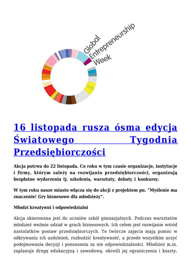 16 listopada rusza ósma edycja Światowego Tygodnia Przedsiębiorczości Akcja potrwa do 22 listopada. Co roku w tym czasie organizacje, instytucje i firmy, którym zależy na rozwijaniu przedsiębiorczości, organizują bezpłatne wydarzenia tj. szkolenia, warsztaty, debaty i konkursy. W tym roku nasze miasto włącza się do akcji z projektem pn. ”Myślenie ma znaczenie! Gry biznesowe dla młodzieży”. Młodzi kreatywni i odpowiedzialni Akcja skierowana jest do uczniów szkół gimnazjalnych. Podczas warsztatów młodzież weźmie udział w grach biznesowych. Ich celem jest rozwijanie wśród nastolatków postaw przedsiębiorczych. Te twórcze zajęcia mają pomóc w odkrywaniu ich uzdolnień, rozbudzić kreatywność, a przede wszystkim uczyć podejmowania decyzji i ponoszenia za nie odpowiedzialności. Młodzież m.in. zaplanuje drogę edukacyjną i zawodową, określi jej ograniczenia i koszty, zanalizuje korzyści i ustali odpowiedzialność biznesową. Harmonogram warsztatów: 17 listopada – Publiczne Gimnazjum nr 3 w Starogardzie Gdańskim 18 listopada – Publiczne Gimnazjum nr 1 w Starogardzie Gdańskim 19 listopada – Publiczne Gimnazjum nr 4 w Starogardzie Gdańskim 20 listopada – Publiczne Gimnazjum nr 2 w Starogardzie Gdańskim Do akcji przygotowani zostali też nauczyciele, którzy 29 października uczestniczyli w specjalnym szkoleniu, przygotowującym ich do koordynowania tego projektu. Szkolenie odbyło się w Urzędzie Miasta, a jego organizatorem była Fundacja Młodzieżowej Przedsiębiorczości z Gdańska. Idea Światowego Tygodnia Przedsiębiorczości Pomysłodawcami Światowego Tygodnia Przedsiębiorczości są premier Wielkiej Brytanii Gordon Brown, prezes amerykańskiej Fundacji Kauffmana – Carl Schramm oraz brytyjska rządowo-biznesowa organizacja Make Your Mark. Global Entrepreneurship Week to już właściwie międzynarodowy ruch społeczny. To wyjątkowa inicjatywa. Gromadzi instytucje państwowe i pozarządowe, firmy, szkoły i uniwersytety, które podejmują wspólne działania na rzecz rozwoju przedsiębiorczości. Kolejne edycje przyciągają coraz większą publiczność. W wydarzeniach Światowego Tygodnia Przedsiębiorczości uczestniczy blisko 100 tysięcy osób rocznie! Partnerzy, którzy angażują się w tę międzynarodową inicjatywę, mają okazję wspólnie tworzyć markę ŚTP, promować przedsiębiorcze postawy w swoich firmach oraz edukować innych. Od 2008 roku ŚTP organizowany jest w 143 krajach świata, w tym w Polsce. „Polska jest jednym z liderów Światowego Tygodnia Przedsiębiorczości. To właśnie od nas inne kraje uczą się jak przy takiej inicjatywie mogą współpracować ze sobą sektor publiczny, prywatny i pozarządowy. Na co dzień takiej współpracy brakuje, ale to właśnie podczas Światowego Tygodnia swoje wysiłki łączą urzędy marszałkowskie, parki technologiczne, duże korporacje, małe firmy, uczelnie, fundacje i stowarzyszenia. Łącznie organizujemy ponad dwa i pół tysiąca bezpłatych wydarzeń w ciągu zaledwie kilku dni. Za takie działanie Polska została uhonorowana nagrodą „Country of the Year” na marcowym Kongresie Przedsiębiorczości w Mediolanie” – mówi Justyna Politańska, prezes Fundacji Światowego Tygodnia Przedsiębiorczości. Patronat honorowy nad wydarzeniem objęli: Ministerstwo Gospodarki, Minister Pracy i Polityki Społecznej, Przedstawicielstwo Komisji Europejskiej w Polsce, PARP, Prezydent m.st Warszawy i Konfederacja Lewiata.
