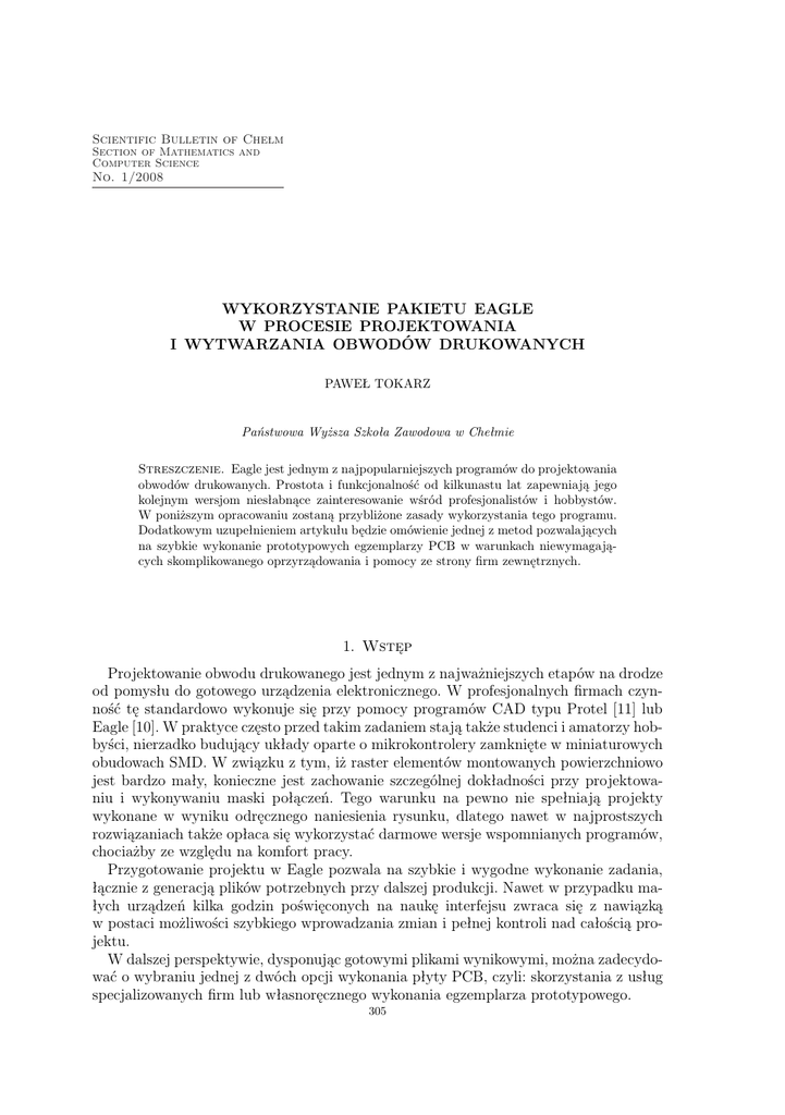 Scientific Bulletin of Chelm Section of Mathematics and Computer Science No. 1/2008 WYKORZYSTANIE PAKIETU EAGLE W PROCESIE PROJEKTOWANIA I WYTWARZANIA OBWODÓW DRUKOWANYCH PAWEŁ TOKARZ Państwowa Wyższa Szkoła Zawodowa w Chełmie Streszczenie. Eagle jest jednym z najpopularniejszych programów do projektowania obwodów drukowanych. Prostota i funkcjonalność od kilkunastu lat zapewniają jego kolejnym wersjom niesłabnące zainteresowanie wśród profesjonalistów i hobbystów. W poniższym opracowaniu zostaną przybliżone zasady wykorzystania tego programu. Dodatkowym uzupełnieniem artykułu będzie omówienie jednej z metod pozwalających na szybkie wykonanie prototypowych egzemplarzy PCB w warunkach niewymagających skomplikowanego oprzyrządowania i pomocy ze strony firm zewnętrznych. 1. Wstęp Projektowanie obwodu drukowanego jest jednym z najważniejszych etapów na drodze od pomysłu do gotowego urządzenia elektronicznego. W profesjonalnych firmach czynność tę standardowo wykonuje się przy pomocy programów CAD typu Protel [11] lub Eagle [10]. W praktyce często przed takim zadaniem stają także studenci i amatorzy hobbyści, nierzadko budujący układy oparte o mikrokontrolery zamknięte w miniaturowych obudowach SMD. W związku z tym, iż raster elementów montowanych powierzchniowo jest bardzo mały, konieczne jest zachowanie szczególnej dokładności przy projektowaniu i wykonywaniu maski połączeń. Tego warunku na pewno nie spełniają projekty wykonane w wyniku odręcznego naniesienia rysunku, dlatego nawet w najprostszych rozwiązaniach także opłaca się wykorzystać darmowe wersje wspomnianych programów, chociażby ze względu na komfort pracy. Przygotowanie projektu w Eagle pozwala na szybkie i wygodne wykonanie zadania, łącznie z generacją plików potrzebnych przy dalszej produkcji. Nawet w przypadku małych urządzeń kilka godzin poświęconych na naukę interfejsu zwraca się z nawiązką w postaci możliwości szybkiego wprowadzania zmian i pełnej kontroli nad całością projektu. W dalszej perspektywie, dysponując gotowymi plikami wynikowymi, można zadecydować o wybraniu jednej z dwóch opcji wykonania płyty PCB, czyli: skorzystania z usług specjalizowanych firm lub własnoręcznego wykonania egzemplarza prototypowego. 305 306 PAWEŁ TOKARZ 2. Pakiet Eagle - moduł Schematic Eagle jest produktem niemieckiej firmy Cadsoft. Program został stworzony z myślą o użytkownikach wymagających prostego i efektywnego narzędzia. Na chwilę obecną aktualna edycja nosi oznaczenie 5.1. Darmowa wersja jest w pełni funkcjonalna, a jedynym minusem może być ograniczony obszar roboczy o maksymalnych wymiarach 80 × 100 mm.Wszystkie potrzebne pliki instalacyjne dla systemów Windows, Linux i Mac OS dostępne są na stronie producenta Rysunek 1. Przekrój przez wielowarstwową płytę PCB Pracę z programem rozpoczyna się od uruchomienia panelu kontrolnego przedstawionego na rysunku 2. Rysunek 2. Okno panelu kontrolnego Wśród dostępnych opcji istnieje możliwość tworzenia i edycji następujących elementów projektu: - schematu (moduł Schematic), - obwodu drukowanego (moduł Board), WYKORZYSTANIE PAKIETU EAGLE W PROCESIE PROJEKTOWANIA ... - 307 biblioteki (Library), plików produkcyjnych (CAM), programów w języku użytkownika (ULP), skryptów (Script), plików tekstowych. Zdecydowanie najczęściej wykorzystywane są moduły Schematic i Board - bezpośrednio powiązane z tworzeniem schematu i mozaiki płyty PCB, w dalszej kolejności edytor bibliotek i menadżer CAM. Rysunek 3. Okno modułu Schematic Z chwilą otwarcia lub utworzenia pliku w module Schematic pojawia się okno zbliżone wyglądem do rysunku 3 (w tym wypadku jest to gotowy projekt przetwornicy DC/DC). Ogólna zasada tworzenia rysunków elektrycznych nakazuje, aby wszystkie sygnały prowadzone były od strony lewej (wejścia) do prawej (wyjścia), a w przypadku szyn zasilania ta sama reguła wskazuje, aby potencjały wyższe umieszczać powyżej linii masy, dalsze polepszenie czytelności rysunku uzyskuje się poprzez wstawianie węzłów w punktach wspólnych. Pozostałe reguły tworzenia schematów są adekwatne do tego, co można się spodziewać po innych programach CAD. Symbole elementów pobierane są z biblioteki (rysunek 4) komendą Add, ilość dostępnych modeli jest bardzo duża i w większości wypadków eliminuje konieczność opracowywania własnych. Wszystkie operacje typu przesuwanie, kreślenie linii - Wire czy też prowadzenie połączeń - Net wykonywane są przy pomocy myszy. Korzystając z menu kontekstowego, każdej linii można nadać odpowiedni kształt, kolor i sposób prowadzenia, w brakujących miejscach schemat można dodatkowo uzupełniać o węzły poleceniem Junction. Elementom umieszczanym na schemacie przypisywana jest automatycznie nazwa, którą można edytować poleceniem Name, opcja Value umożliwia z kolei korektę pola wartości. Zamiana symboli na schemacie odbywa się po wybraniu pozycji Replace. 308 PAWEŁ TOKARZ Rysunek 4. Okno magazynu podzespołów W przypadku podzespołów zawierających w obrębie jednej struktury większą liczbę identycznych elementów czasami celowe staje się skorzystanie z ikony Gateswap, zamienia ona położenie bloków bez naruszenia logicznej struktury układu (przykład: podmiana funkcji bramek NAND w obrębie pojedynczej kostki CMOS 4011). Do tej samej grupy poleceń należy komenda Pinswap zamieniająca wyprowadzenia o identycznych właściwościach (np. przemieszczenie sygnałów w obrębie czterowejściowej bramki AND). Jedna z pożyteczniejszych komend, polepszająca czytelność schematów z szynami adresowymi, nosi oznaczenie Bus i odpowiada za prowadzenia połączeń magistralnych. Dalsze poprawienie klarowności rysunku można uzyskać poleceniem Smash, które oddzieli nazwę i wartość od zarysu symbolu. Przy kontroli schematu nieocenioną rolę odgrywa test ERC (Electrical Rules Check). Sprawd
