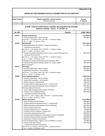 Załącznik nr 9 ZBIORCZE ZESTAWIENIE DOTACJI PODMIOTOWYCH NA 2009 ROK Dział, Rozdz. Nazwa podmiotu, nazwa zadania Podstawa prawna Kwota w złotych 1 2 3 § 2540 - Dotacja podmiotowa z budżetu dla niepublicznej jednostki systemu oświaty - kwota 8 778 420,- zł dz. 801 80101 Razem Szkoły podstawowe * Prywatny Zespół Szkół - Henryk Jóźwiak 6 965 790 zł 327 060 zł 327 060 zł (art.90 ust. 1 i 2a ustawy z dnia 7.09.1991 r. o systemie oświaty tj. Dz. U. z 2004 r. Nr 256 poz. 2572) 80104 Przedszkola * Zgomadzenie Sióstr Św. Elzbiety - Prowincja Poznańska 1 941 650 zł 911 660 zł - prowadzenie przedszkola (art. 90 ust. 1 i 2b ustawy z dnia 7.09.1991 r. o systemie oświaty tj. Dz. U. z 2004 r. Nr 256 poz. 2572) * Prywatne Przedszkole Niepubliczne Nr 2 Lucyna i Leszek Machowiak Sp. c. 283 570 zł - prowadzenie przedszkola (art. 90 ust. 1 i 2b ustawy z dnia 7.09.1991 r. o systemie oświaty tj. Dz. U. z 2004 r. Nr 256 poz. 2572) * Niepubliczne Przedszkole"Wesoła Ciuchcia"Agnieszka Jekel * Przedszkole Niepubliczne"Kolorowy Świat" S.C. Krystyna Sejwa 159 120 zł 587 300 zł Maria Jurczyńska 80110 Gimnazja * Prywatny Zespół Szkół - Henryk Jóźwiak * Zespół Szkół Prywatnych - Anna Handke 378 970 zł 246 590 zł 132 380 zł (art.90 ust. 1 i 2a ustawy z dnia 7.09.1991 r. o systemie oświaty tj. Dz. U. z 2004 r. Nr 256 poz. 2572) 80120 Licea ogólnokształcace * Prywatny Zespół Szkół - Henryk Jóźwiak * Zespół Szkół Prywatnych - Anna Handke * Zespół Prywatnych Szkół Średnich * Prywatne Szkoły Ponadpodstawowe Sp. c. "EDUKATOR" * Zakład Doskonalenia Zawodowego Centrum Kształcenia * Prywatna Szkoła Techniczna * Liceum Ogólnokształcące dla Dorosłych "PRYMUS" * Prywatne Liceum Ogólnokształcące 1 266 310 zł 19 240 zł 305 430 zł 156 470 zł 102 730 zł 204 940 zł 29 240 zł 220 210 zł 228 050 zł - prowadzenie jednostek oświatowych (art. 90 ust. 2, 2a i 3 ustawy z dnia 7.09.1991 r. o systemie oświaty tj. Dz. U. z 2004 r. Nr 256 poz. 2572) 80130 Szkoły zawodowe * Zespół Prywatnych Szkół Średnich * Prywatne Szkoły Ponadpodstawowe Sp. c. "EDUKATOR" * Zakład Doskonalenia Zawodowego Centrum Kształcenia * Prywatna Szkoła Techniczna * Policealna Szkoła Ekonomii i Informatyki * Policealna Szkoła Architektury i Budownictwa * Towarzystwo Edukacji Bankowej S.A. * Policealna Szkoła Detektywów i Pracowników Ochrony O`CHIKARA * Dwuletnia Policealna Szkoła Zawodowa "PRYMUS" * Zespół Szkół i Placówek Oświatowych * Studium Bezpieczeństwa i Higieny Pracy O`CHIKARA w Lesznie * Prywatne Policealne Studium - prowadzenie jednostek oświatowych (art. 90 ust. 2 i 3 ustawy z dnia 7.09.1991 r. o systemie oświaty tj. Dz. U. z 2004 r. Nr 256 poz. 2572) 3 051 800 zł 369 590 zł 259 190 zł 407 070 zł 387 740 zł 69 620 zł 121 460 zł 496 490 zł 102 640 zł 369 650 zł 289 830 zł 55 080 zł 123 440 zł 1 2 dz. 854 3 Razem 85402 Specjalne ośrodki wychowawcze 85402 * Ośrodek Rehabilitacyjno - Edukacyjno - Wychowawczy w Lesznie 1 812 630 zł 1 812 630 zł 1 812 630 zł - prowadzenie działalności rehabilitacyjno-wychowawczej (art. 90 ust. 3a ustawy z dnia 7.09.1991 r. o systemie oświaty tj. Dz. U. z 2004 r. Nr 256 poz. 2572) § 2480 - Dotacja podmiotowa z budżetu dla samorządowej instytucji kultury - kwota 3 813 621,- zł dz. 921 Razem 92109 * Miejski Ośrodek Kultury w Lesznie 92110 * Miejskie Biuro Wystaw Artystycznych w Lesznie 92116 * Miejska Biblioteka Publiczna w Lesznie 3 813 621 zł 1 379 800 zł 295 120 zł 2 138 701 zł