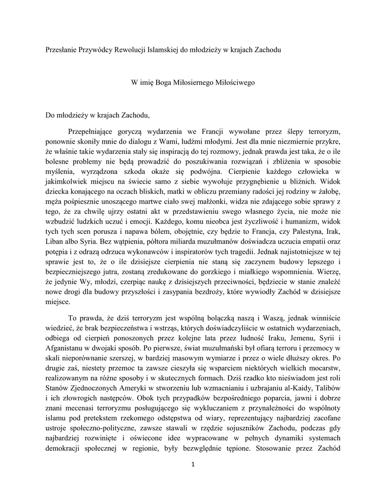 Przesłanie Przywódcy Rewolucji Islamskiej do młodzieży w krajach Zachodu W imię Boga Miłosiernego Miłościwego Do młodzieży w krajach Zachodu, Przepełniające goryczą wydarzenia we Francji wywołane przez ślepy terroryzm, ponownie skoniły mnie do dialogu z Wami, ludźmi młodymi. Jest dla mnie niezmiernie przykre, że właśnie takie wydarzenia stały się inspiracją do tej rozmowy, jednak prawda jest taka, że o ile bolesne problemy nie będą prowadzić do poszukiwania rozwiązań i zbliżenia w sposobie myślenia, wyrządzona szkoda okaże się podwójna. Cierpienie każdego człowieka w jakimkolwiek miejscu na świecie samo z siebie wywołuje przygnębienie u bliźnich. Widok dziecka konającego na oczach bliskich, matki w obliczu przemiany radości jej rodziny w żałobę, męża pośpiesznie unoszącego martwe ciało swej małżonki, widza nie zdającego sobie sprawy z tego, że za chwilę ujrzy ostatni akt w przedstawieniu swego własnego życia, nie może nie wzbudzić ludzkich uczuć i emocji. Każdego, komu nieobca jest życzliwość i humanizm, widok tych tych scen porusza i napawa bólem, obojętnie, czy będzie to Francja, czy Palestyna, Irak, Liban albo Syria. Bez wątpienia, półtora miliarda muzułmanów doświadcza uczucia empatii oraz potępia i z odrazą odrzuca wykonawców i inspiratorów tych tragedii. Jednak najistotniejsze w tej sprawie jest to, że o ile dzisiejsze cierpienia nie staną się zaczynem budowy lepszego i bezpieczniejszego jutra, zostaną zredukowane do gorzkiego i miałkiego wspomnienia. Wierzę, że jedynie Wy, młodzi, czerpiąc naukę z dzisiejszych przeciwności, będziecie w stanie znaleźć nowe drogi dla budowy przyszłości i zasypania bezdroży, które wywiodły Zachód w dzisiejsze miejsce. To prawda, że dziś terroryzm jest wspólną bolączką naszą i Waszą, jednak winniście wiedzieć, że brak bezpieczeństwa i wstrząs, których doświadczyliście w ostatnich wydarzeniach, odbiega od cierpień ponoszonych przez kolejne lata przez ludność Iraku, Jemenu, Syrii i Afganistanu w dwojaki sposób. Po pierwsze, świat muzułmański był ofiarą terroru i przemocy w skali nieporównanie szerszej, w bardziej masowym wymiarze i przez o wiele dłuższy okres. Po drugie zaś, niestety przemoc ta zawsze cieszyła się wsparciem niektórych wielkich mocarstw, realizowanym na różne sposoby i w skutecznych formach. Dziś rzadko kto nieświadom jest roli Stanów Zjednoczonych Ameryki w stworzeniu lub wzmacnianiu i uzbrajaniu al-Kaidy, Talibów i ich złowrogich następców. Obok tych przypadków bezpośredniego poparcia, jawni i dobrze znani mecenasi terroryzmu posługującego się wykluczaniem z przynależności do wspólnoty islamu pod pretekstem rzekomego odstępstwa od wiary, reprezentujący najbardziej zacofane ustroje społeczno-polityczne, zawsze stawali w rzędzie sojuszników Zachodu, podczas gdy najbardziej rozwinięte i oświecone idee wypracowane w pełnych dynamiki systemach demokracji społecznej w regionie, były bezwględnie tępione. Stosowanie przez Zachód 1 podwójnych standardów wobec ruchów przebudzenia w swiecie muzułmańskim, stanowi wymowny przykład sprzeczności w polityce Zachodu. Inne oblicze tej sprzeczności znajduje wyraz w popieraniu terroryzmu państwowego Izraela. Represjonowana ludność Palestyny od ponad sześćdziesięciu lat doświadcza najgorszego rodzaju terroryzmu. Jeżeli Europejczycy obecnie przez kilka dni chronią się w swoich domach i wystrzegają się pojawiania się w miejscach publicznych i przepełnionych centrach, to przeciętna rodzina palestyńska od dziesiątków lat nie może czuć się bezpieczna i wolna od machiny eksterminacji i niszczenia reżimu syjonistycznego nawet w swoim własnym domu. Z jakim rodzajem przemocy można dziś pod względem bezwzględnego okrucieństwa porównać budowanie osiedli przez reżim syjonistyczny? Reżim ten, nigdy nie będąc obiektem poważnej i skutecznej krytyki swych wpływowych sojuszników albo przynajmniej pozornie niezależnych instytucji międzynarodowych, każdego dnia burzy domy Palestyńczyków i niszczy ich sady i pola, nie dając im nawet sposobności przeniesienia dobytku lub możliwości zbioru plonów z pól. A wszystko to rozgrywa się na przepełnionych łzami oczach przerażonych kobiet i dzieci, będących świadkami bicia członków ich rodzin, a w niektórych przypadkach ich transportu do napawających grozą ośrodków tortur. Czy znacie dziś na świecie podobne okrucieństwo na taką skalę i w takim wymiarze, w dodatku trwające przez tak długi czas? Czymże jest zastrzelenie kobiety na ulicy tylko dlatego, że sprzeciwiła się uzbrojonemu po zęby żołnierzowi, jak nie terroryzmem? Tylko dlatego, że tego rodzaju barbarzyństwa dopuszczają się siły zbrojne okupacyjnego państwa, nie powinno być ono określane mianem ekstremizmu? A może tylko dlatego obrazy te nie powinny robić żadnego wrażenia na naszych sumieniach, bo od sześćdziesięciu lat są ciągle oglądane na ekranach telewizorów? Dokonywane w ostatnich latach inwazje militarne na świat islamu pozostawiające po sobie niezliczone ofiary są kolejnym przykładem sprzecznej logiki Zachodu. Najeżdżane kraje, poza stratami ludzkimi, ponosiły straty w infrastrukturze gospodarczej i przemysłowej a ich perspektywy rozwoju zostały albo zatrzymane albo spowolnione. W niektórych przypadkach cofnęły się o dziesiątki lat. Mimo to, bezczelnie żąda się od nich, aby nie uważały się za ofiary. Jakże można zamienić jakiś kraj w ruinę, jego miasta i wioski rozbić w perzynę, po czym powiedzieć mu, żeby nie czuł się ofiarą przemocy!? Czy zamiast domagania się samootumanienia albo wyparcia z pamięci własnej tragedii, nie lepiej szczerze przeprosić? Cierpienia, których w tych latach doznał świat muzułmański przez hipokryzję i dwulicowość agresorów były nie mniejsze niż straty materialne. Droga młodzieży! Mam nadzie