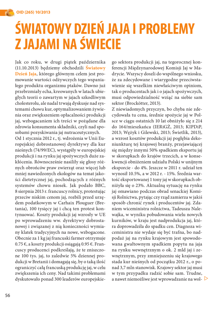 OID (265) 10/2013 KJL ŚWIATOWY DZIEŃ JAJA I PROBLEMY Z JAJAMI NA ŚWIECIE Jak co roku, w drugi piątek października (11.10.2013) będziemy obchodzili Światowy Dzień Jaja, którego głównym celem jest promowanie wartości odżywczych tego wspaniałego produktu organizmu ptaków. Dawno już przebrzmiały echa, kreowanych w latach ubiegłych teorii o zawartym w jajach szkodliwym cholesterolu, ale nadal trwają dyskusje nad systemami chowu kur, optymalizowaniem żywienia oraz zwiększeniem opłacalności produkcji jaj, wzbogacaniem ich treści w pożądane dla zdrowia konsumenta składniki, czyli nad sposobami pozyskiwania jaj nutraceutycznych. Od 1 stycznia 2012 r., tj. wdrożenia w Unii Europejskiej dobrostanowej dyrektywy dla kur nieśnych (74/99/EC), wystąpiły w europejskiej produkcji i na rynku jaj spożywczych duże zakłócenia. Równocześnie nasiliły się głosy różnych obrońców praw zwierząt oraz więcej lub mniej nawiedzonych ekologów na temat jakości dietetycznej jaj, pochodzących z różnych systemów chowu niosek. Jak podało BBC, 8 sierpnia 2013 r. francuscy rolnicy, protestując przeciw niskim cenom jaj, rozbili przed urzędem podatkowym w Carhaix Plouguer (Bretania), 100 tysięcy jaj i chcą ten protest kontynuować. Koszty produkcji jaj wzrosły w UE po wprowadzeniu ww. dyrektywy dobrostanowej i związanej z nią konieczności wymiany klatek tradycyjnych na nowe, wzbogacone. Obecnie za 1 kg jaj francuski farmer otrzymuje 0.75 €, a koszty produkcji osiągają 0.95 €. Francuscy producenci podkreślają, że te zniszczone 100 tys. jaj, to zaledwie 5% dziennej produkcji w Bretanii i domagają się, by o taką ilość ograniczyć całą francuską produkcję jaj, w celu zwiększenia ich ceny. Nad takimi problemami dyskutowało ponad 300 leaderów europejskie56 go sektora produkcji jaj, na tegorocznej konferencji Międzynarodowej Komisji Jaj w Madrycie. Wszyscy doszli do wspólnego wniosku, że za zdecydowane i wiarygodne przeciwstawienie się wszelkim niewłaściwym opiniom, tak o producentach jak i o jajach spożywczych, musi odpowiedzialność wziąć na siebie sam sektor (Brockötter, 2013). Z niewiadomych przyczyn, bo chyba nie zdecydowała tu cena, średnie spożycie jaj w Polsce w ciągu ostatnich 10 lat obniżyło się z 214 do 164/mieszkańca (IERiGŻ, 2013; KIPDiP, 2013; Wężyk i Gilewski, 2013; Świetlik, 2013), a wzrost kosztów produkcji jaj pogłębia dekoniunkturę tej krajowej branży, przejawiającej się między innymi 50% spadkiem eksportu jaj w skorupkach do krajów trzecich, a w konsekwencji obniżeniem udziału Polski w unijnym eksporcie - do 4%. Jeszcze w 2011 r. udział ten wynosił 10.5%, a w 2012 r. - 15%. Średnia wartość eksportowanej 1 tony jaj w skorupkach obniżyła się o 23%. Aktualną sytuację na rynku jaj omawiano podczas obrad senackiej Komisji Rolnictwa, pytając czy rząd zamierza w jakiś sposób chronić rynek i producentów jaj. Zdaniem wiceministra rolnictwa, Tadeusza Nalewajka, w wyniku pobudowania wielu nowych kurników, w kraju jest nadprodukcja jaj, która doprowadziła do spadku cen. Diagnoza wiceministra nie wydaje się być trafna, bo nadpodaż jaj na rynku krajowym jest spowodowana gwałtownym spadkiem popytu na jaja na rynku wewnętrznym o ok. 2 mld jaj i zewnętrznym, przy zmniejszeniu się krajowego stada kur nieśnych od początku 2012 r., o ponad 3,7 mln stanowisk. Krajowy sektor jaj musi w tym przypadku radzić sobie sam. Trudne, a nawet niemożliwe jest wprowadzanie na wol- OID (265) 10/2013 KJL nym rynku regulacji rządowych. W tym przypadku producenci jaj, stowarzyszeni w różnych organizacjach branżowych, powinni przystąpić do działań stabilizujących produkcję jaj i wpłynąć skutecznie na zwiększenie krajowego na nie popytu. Należy jednak zwrócić uwagę, że na 1166 zarejestrowanych przez GIW ferm kur nieśnych (dane z 13 sierpnia 2013 r.), zaledwie ok. 250 producentów jaj jest czynnymi (płacącymi składki) członkami organizacji drobiarskich. Pewną nadzieję budzi spadek cen w skupie zbóż paszowych, co może spowodować w konsekwencji obniżenie cen pasz drobiowych. Wg prof. Luise Fresco (2013), byłej dyrektor badań rolniczych w FAO, a obecnie profesor Uniwersytetu w Amsterdamie i Wageningen, sektorowi produkcji jaj należą się szczególne gratulacje za szybki rozwój i wdrażanie innowacji. Nie ma tak ważnej innej branży, która by na tak dużą skalę dążyła do zaspokojenia światowych potrzeb na białko i to w sytuacji, gdy z 7 miliardowej populacji ludzkiej, 2 miliardy są niedożywione lub żywią się nieodpowiednią żywnością. Inne 2 miliardy ludzi mają co prawda jej wystarczającą ilość, ale są na etapie poprawy jej jakości. Ogromne zapotrzebowanie na zwierzęce białko występuje obecnie w Azji i Afryce. Więcej niż połowa ludności świata nie odżywia się w dostatecznym stopniu lub wręcz niedostatecznie. Jak przewidują demografowie, o następne 2 miliardy ludzi zwiększy się światowa populacja do 2050 roku i to jest dodatkowe wyzwanie, jakie stoi przed producentami żywności. Mimo że sektor produkcji jaj odnosi sukcesy, to nie wszystko jest w nim idealne - powiedziała prof. Fresco (2013). Wiele z niezadawalających spraw wynika z ludzkiego punktu widzenia na dobrostan i choroby drobiu, wywołane takimi bakteriami jak Salmonella enteritidis, Esherihia coli i inne oraz zdrowotne bezpieczeństwo żywności. Konsument, należący nie koniecznie do tzw. średniej klasy społecznej lub po58 chodzący z krajów rozwiniętych gospodarczo, jest pełen niepokoju i stara się uzyskać wszelkie informacje nt. statusu zdrowotnego naszej żywności. Sektor produkcji jaj jest zobowiązany do wiarygodnego informowania konsumentów, że dostarczane im jaja nie zagrażają ich zdrowiu. Oczywiście od czasu do czasu mogą pojawić się jakieś problemy, ale opinia, że produkowane przez sektor jaja są skażone czynnikami chorobotwórczymi jest całkowicie
