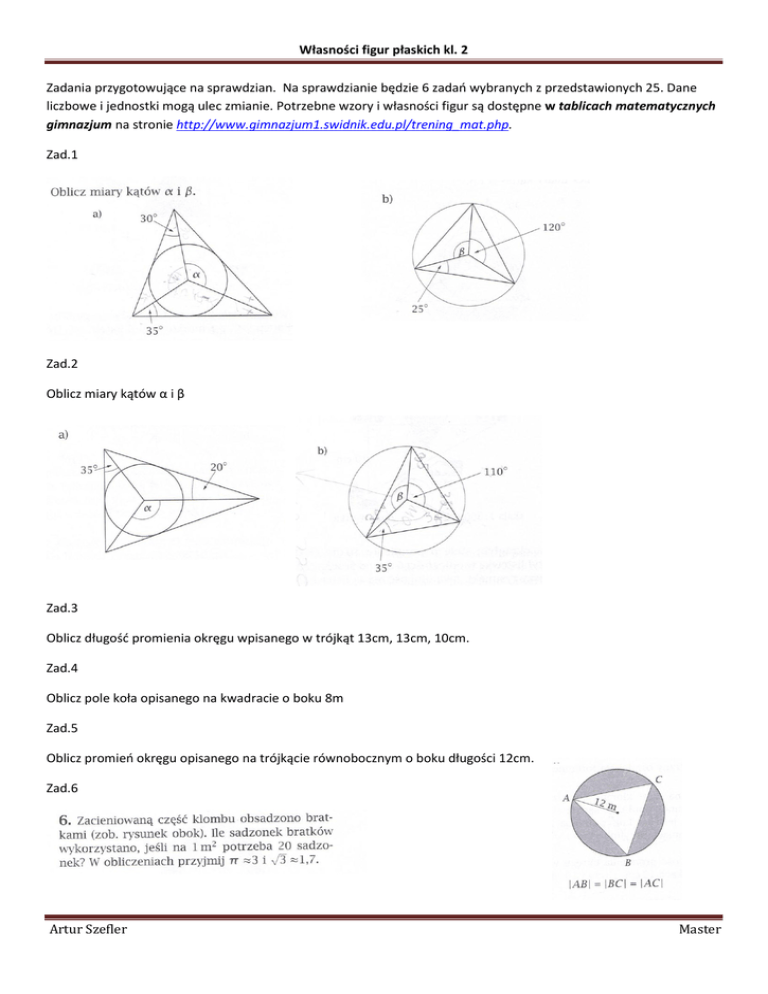 Własności figur płaskich kl. 2 Zadania przygotowujące na sprawdzian. Na sprawdzianie będzie 6 zadań wybranych z przedstawionych 25. Dane liczbowe i jednostki mogą ulec zmianie. Potrzebne wzory i własności figur są dostępne w tablicach matematycznych gimnazjum na stronie http://www.gimnazjum1.swidnik.edu.pl/trening_mat.php. Zad.1 Zad.2 Oblicz miary kątów α i β Zad.3 Oblicz długość promienia okręgu wpisanego w trójkąt 13cm, 13cm, 10cm. Zad.4 Oblicz pole koła opisanego na kwadracie o boku 8m Zad.5 Oblicz promień okręgu opisanego na trójkącie równobocznym o boku długości 12cm. Zad.6 Artur Szefler Master Własności figur płaskich kl. 2 Zad.7 Znajdź miarę kąta wewnętrznego dziewięciokąta foremnego. Zad.8 Wykonaj obliczenia i uzupełnij zdania Zad.9 Zad.10 Zad.11 Korzystając z rysunku obok, oceń prawdziwość zdań Artur Szefler Master Własności figur płaskich kl. 2 Zad.12 Oblicz obwód i pole trójkąta o bokach 10cm, 10cm, 12cm. (wskazówka – wzór Herona) Zad.13 Narysuj i oblicz pole pierścienia kołowego o promieniu wewnętrznym 2cm i promieniu zewnętrznym 3cm. Zad.14 Oblicz liczbę przekątnych dwudziestokąta. Zad.15 Zad.16 Oblicz pole wycinka kołowego przedstawionego na rysunku obok Zad.17 Zad.18 Artur Szefler Master Własności figur płaskich kl. 2 Zad.19 Oblicz obwód i pole sześciokąta foremnego wpisanego w koło o promieniu 6cm. Zad.20 (60o) Gratisy Zad.21 i 22 Zad.23 Zad.24 Zad.25 Artur Szefler Master