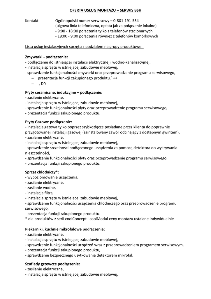 OFERTA USŁUG MONTAŻU – SERWIS BSH Kontakt: Ogólnopolski numer serwisowy – 0-801-191-534 (ulgowa linia telefoniczna, opłata jak za połączenie lokalne) - 9:00 - 18:00 połączenia tylko z telefonów stacjonarnych - 18:00 - 9:00 połączenia również z telefonów komórkowych Lista usług instalacyjnych sprzętu z podziałem na grupy produktowe: Zmywarki - podłączenie: - podłączenie do istniejącej instalacji elektrycznej i wodno-kanalizacyjnej, - instalacja sprzętu w istniejącej zabudowie meblowej, - sprawdzenie funkcjonalności zmywarki oraz przeprowadzenie programu serwisowego, – prezentacja funkcji zakupionego produktu.` ++ – , D0 Płyty ceramiczne, indukcyjne – podłączenie: - zasilenie elektryczne, - instalacja sprzętu w istniejącej zabudowie meblowej, - sprawdzenie funkcjonalności płyty oraz przeprowadzenie programu serwisowego, - prezentacja funkcji zakupionego produktu. Płyty Gazowe podłączenie: - instalacja gazowa tylko poprzez szybkozłącze posiadane przez klienta do poprawnie przygotowanej instalacji gazowej (zainstalowany zawór odcinający z dostępnym gwintem), - zasilanie elektryczne, - instalacja sprzętu w istniejącej zabudowie meblowej, - sprawdzenie szczelności podłączonego urządzenia za pomocą detektora do wykrywania nieszczelności, - sprawdzenie funkcjonalności płyty oraz przeprowadzenie programu serwisowego, - prezentacja funkcji zakupionego produktu. Sprzęt chłodniczy*: - wypoziomowanie urządzenia, - zasilanie elektryczne, - zasilanie wodne, - instalacja filtra, - instalacja sprzętu w istniejącej zabudowie meblowej, - sprawdzenie funkcjonalności urządzenia chłodniczego oraz przeprowadzenie programu serwisowego, - prezentacja funkcji zakupionego produktu. * dla produktów z serii coolConcept i coolModul ceny montażu ustalane indywidualnie Piekarniki, kuchnie mikrofalowe podłączenie: - zasilanie elektryczne, - instalacja sprzętu w istniejącej zabudowie meblowej, - sprawdzenie funkcjonalności urządzeń wraz z przeprowadzeniem programem serwisowym, - prezentacja funkcji zakupionego produktu, - sprawdzenie bezpiecznego użytkowania detektorem mikrofal. Szuflady grzewcze podłączenie: - zasilanie elektryczne, - instalacja sprzętu w istniejącej zabudowie meblowej, - sprawdzenie funkcjonalności szuflady oraz przeprowadzenie programu serwisowego, - prezentacja funkcji zakupionego produktu. Ekspresy do zabudowy podłączenie: - zasilanie elektryczne, - instalacja filtra, - instalacja sprzętu w istniejącej zabudowie meblowej, - sprawdzenie funkcjonalności ekspresu oraz przeprowadzenie programu serwisowego, - prezentacja funkcji zakupionego produktu. Okapy podłączenie: - zasilanie elektryczne, - instalacja filtra węglowego, - sprawdzenie funkcjonalności okapu oraz przeprowadzenie programu serwisowego. - prezentacja funkcji zakupionego produktu. Pralki i pralko suszarki - podłączenie: - podłączenie do istniejącej instalacji elektrycznej i wodno-kanalizacyjnej, - instalacja sprzętu w istniejącej zabudowie meblowej, - zdjęcie śrub transportowych w urządzeniu, - sprawdzenie funkcjonalności pralki / pralko-suszarki oraz przeprowadzenie programu serwisowego, - prezentacja funkcji zakupionego produktu.