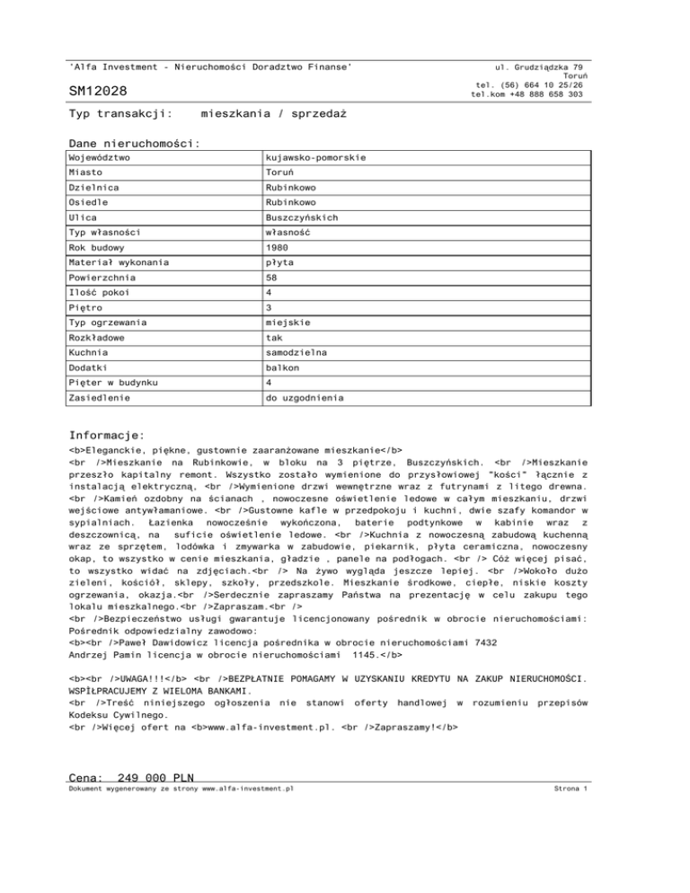 'Alfa Investment - Nieruchomości Doradztwo Finanse' SM12028 Typ transakcji: ul. Grudziądzka 79 Toruń tel. (56) 664 10 25/26 tel.kom +48 888 658 303 mieszkania / sprzedaż Dane nieruchomości: Województwo kujawsko-pomorskie Miasto Toruń Dzielnica Rubinkowo Osiedle Rubinkowo Ulica Buszczyńskich Typ własności własność Rok budowy 1980 Materiał wykonania płyta Powierzchnia 58 Ilość pokoi 4 Piętro 3 Typ ogrzewania miejskie Rozkładowe tak Kuchnia samodzielna Dodatki balkon Pięter w budynku 4 Zasiedlenie do uzgodnienia Informacje: <b>Eleganckie, piękne, gustownie zaaranżowane mieszkanie</b> <br />Mieszkanie na Rubinkowie, w bloku na 3 piętrze, Buszczyńskich. <br />Mieszkanie przeszło kapitalny remont. Wszystko zostało wymienione do przysłowiowej "kości" łącznie z instalacją elektryczną, <br />Wymienione drzwi wewnętrzne wraz z futrynami z litego drewna. <br />Kamień ozdobny na ścianach , nowoczesne oświetlenie ledowe w całym mieszkaniu, drzwi wejściowe antywłamaniowe. <br />Gustowne kafle w przedpokoju i kuchni, dwie szafy komandor w sypialniach. Łazienka nowocześnie wykończona, baterie podtynkowe w kabinie wraz z deszczownicą, na suficie oświetlenie ledowe. <br />Kuchnia z nowoczesną zabudową kuchenną wraz ze sprzętem, lodówka i zmywarka w zabudowie, piekarnik, płyta ceramiczna, nowoczesny okap, to wszystko w cenie mieszkania, gładzie , panele na podłogach. <br /> Cóż więcej pisać, to wszystko widać na zdjęciach.<br /> Na żywo wygląda jeszcze lepiej. <br />Wokoło dużo zieleni, kościół, sklepy, szkoły, przedszkole. Mieszkanie środkowe, ciepłe, niskie koszty ogrzewania, okazja.<br />Serdecznie zapraszamy Państwa na prezentację w celu zakupu tego lokalu mieszkalnego.<br />Zapraszam.<br /> <br />Bezpieczeństwo usługi gwarantuje licencjonowany pośrednik w obrocie nieruchomościami: Pośrednik odpowiedzialny zawodowo: <b><br />Paweł Dawidowicz licencja pośrednika w obrocie nieruchomościami 7432 Andrzej Pamin licencja w obrocie nieruchomościami 1145.</b> <b><br />UWAGA!!!</b> <br />BEZPŁATNIE POMAGAMY W UZYSKANIU KREDYTU NA ZAKUP NIERUCHOMOŚCI. WSPÓŁPRACUJEMY Z WIELOMA BANKAMI. <br />Treść niniejszego ogłoszenia nie stanowi oferty handlowej w rozumieniu przepisów Kodeksu Cywilnego. <br />Więcej ofert na <b>www.alfa-investment.pl. <br />Zapraszamy!</b> Cena: 249 000 PLN Dokument wygenerowany ze strony www.alfa-investment.pl Strona 1