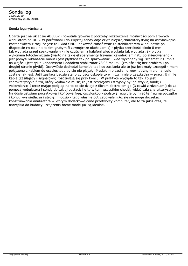 SP4XYI Sonda log 22.02.2010. Zmieniony 28.02.2010. Sonda logarytmiczna Oparta jest na układzie AD8307 i powstała głównie z potrzeby rozszerzenia możliwości pomiarowych wobulatora na DDS. W porównaniu do zwykłej sondy daje czytelniejszą charakterystykę na oscyloskopie. Postanowiłem z racji że jest to układ SMD upakować całość wraz ze stabilizatorem w obudowie po długopisie (w cale nie takim grubym fi zewnętrnze około 1cm ;) - płytka szerokości około 8 mm tak wygląda przed spakowaniem - nie czyściłem z kalafoni więc wygląda jak wygląda ;) - płytka wykonana fotochemicznie (warto na takie eksperymenty trzymać kawałek laminatu polakierowanego jest pomysł kikanascie minut i jest płytka:a tak po spakowaniu: układ wykonany wg. schematu: U mnie na wejściu jest tylko kondensator i dodałem stabilizator 78l05 malutki (zmieścił się bez problemu po drugiej stronie płytki). Oczywiście dochodzi komplet kabli do zasilania ale to już jest mały szczegół - mam połączone z kablem do oscyloskopu by sie nie plątały. Myslałem o zasilaniu wewnętrznym ale na razie zostaje jak jest. Jeśli zasilacz bedzie stał przy oscyloskopie to w niczym nie przeszkadza w pracy. U mnie kable (zasilajacy i sygnałowy) rozdzielają się przy końcu. W praktyce wygląda to tak:To jest charakterystyka filtru, który wydawało mi się że jest zestrojony (strojony był na zwykłą sondę i voltomierz): I teraz mając podgląd na to co sie dzieje z filtrem dostroiłem go (3 cewki z rdzeniami) do za pomocą wobulatora i sondy do takiej postaci: i o to w tym wszystkim chodzi, widać całą charakterystykę. Na ddsie ustwiam początkową i końcową freq, oscyloskop - podstwę reguluje by mieć te freq na początku i końcu wyswietlacza i stroję. miodzio - tego właśnie potrzebowałem.Aż sie nie mogę doczekać konstruowania analizatora w którym dodatkowo dane przetworzy komputer, ale to za jakiś czas, te narzędzia do budowy urządzenia home mode juz są idealne. http://asan.ovh.org Kreator PDF Utworzono 3 March, 2017, 11:55